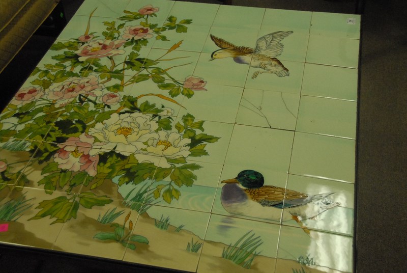 Pictorial tile top table with polished steel base five cracked tiles, ht. 18 1/2in. top 42 x 36