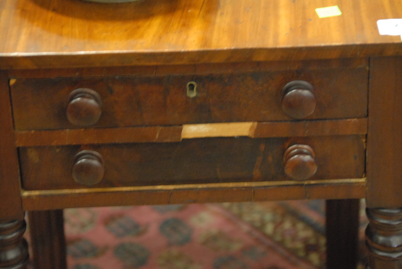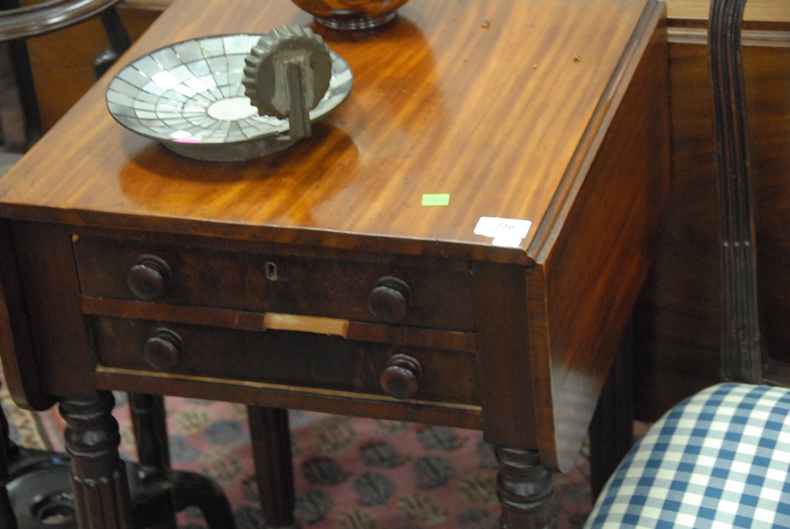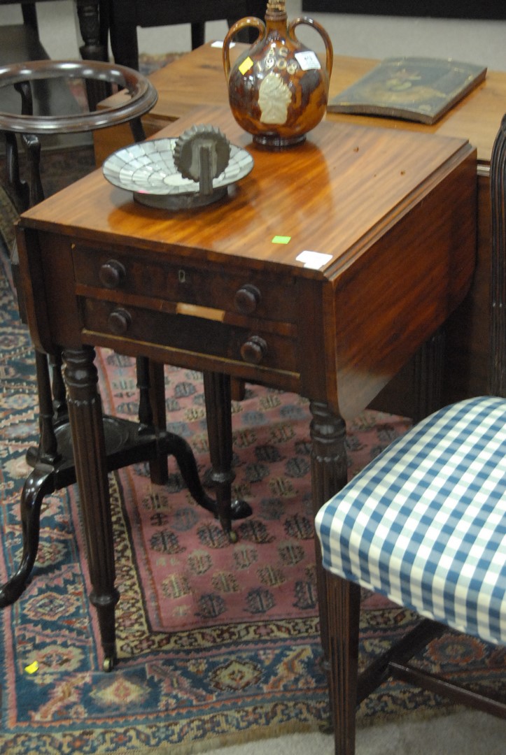 Lot 236: Sheraton mahogany drop leaf table with fluted legs, circa 1830 veneer chip. ht. 30 in. wd. 17 in. dp. 19 in.