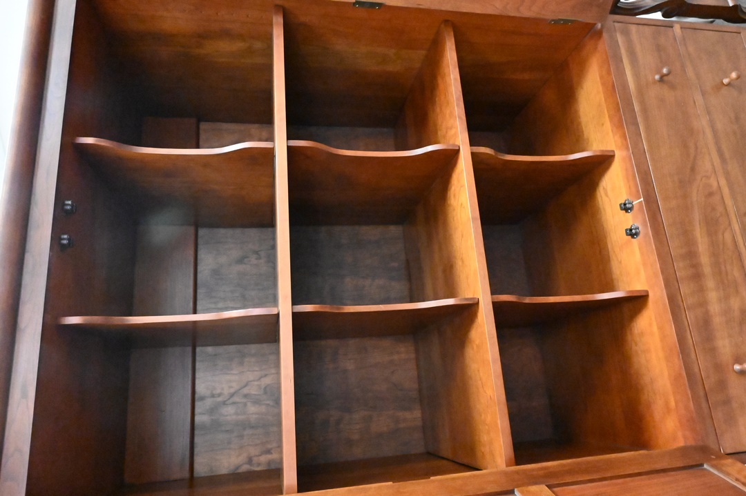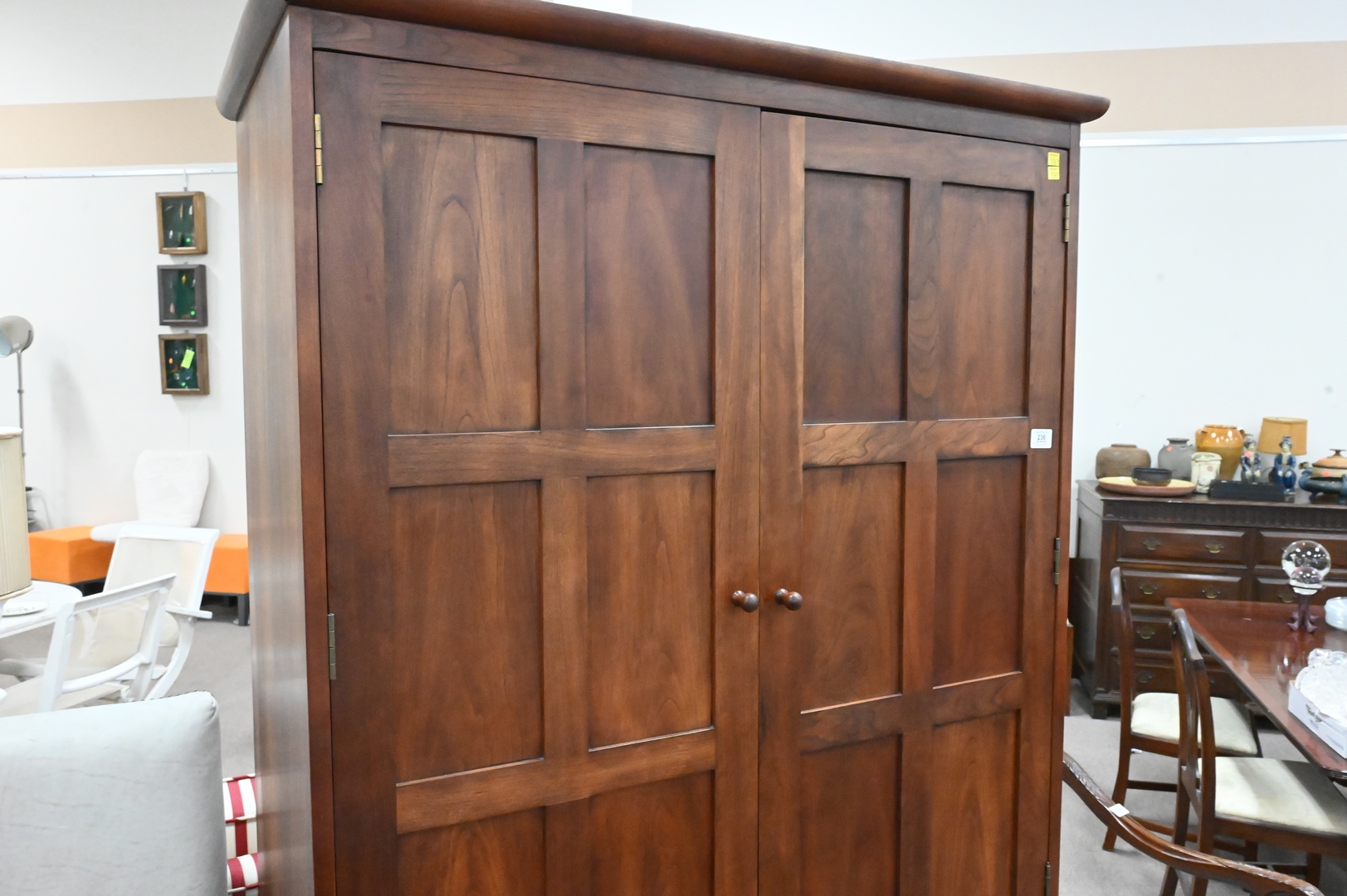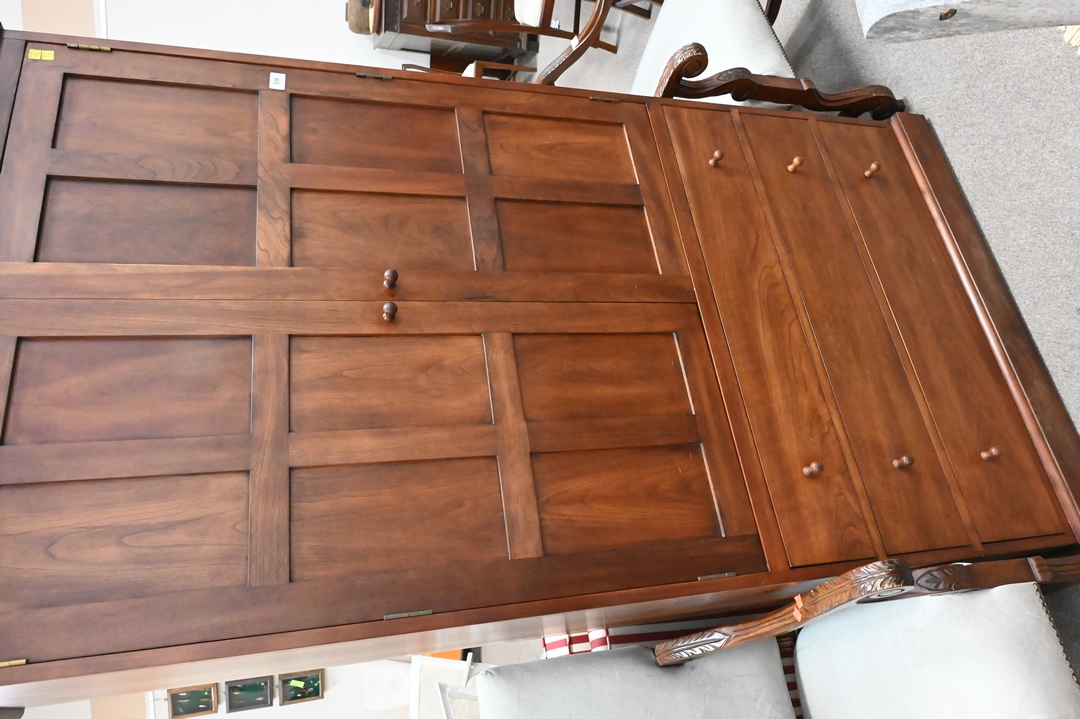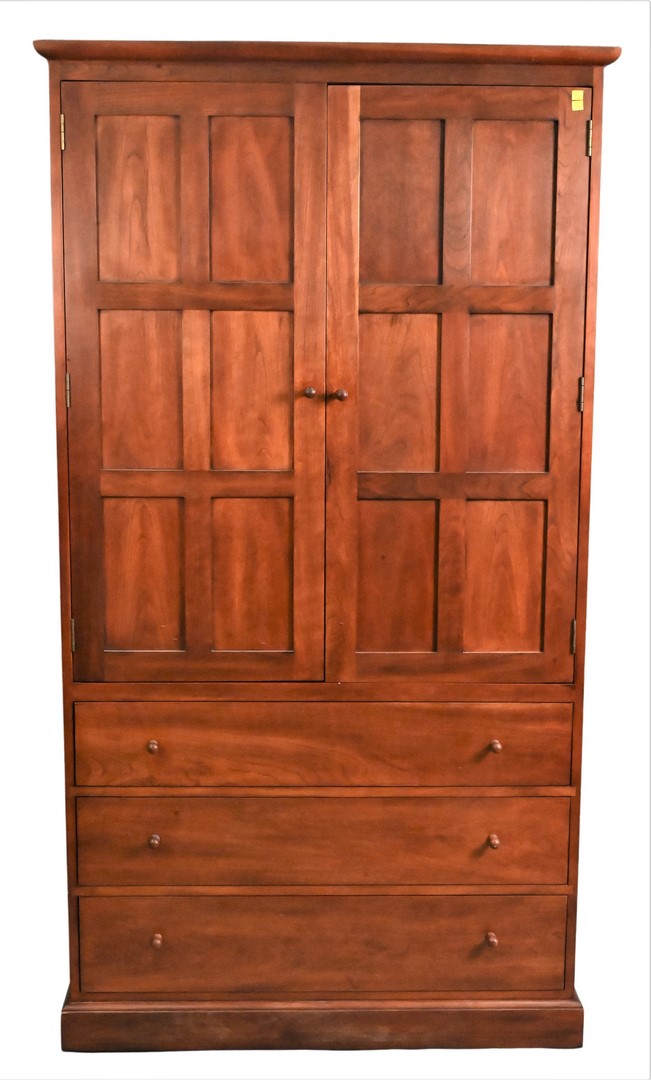 Stickley Cherry Cabinet, having two doors opening to fitted interior, over three drawers, height 77 inches, width 40 inches, depth 21 inches.