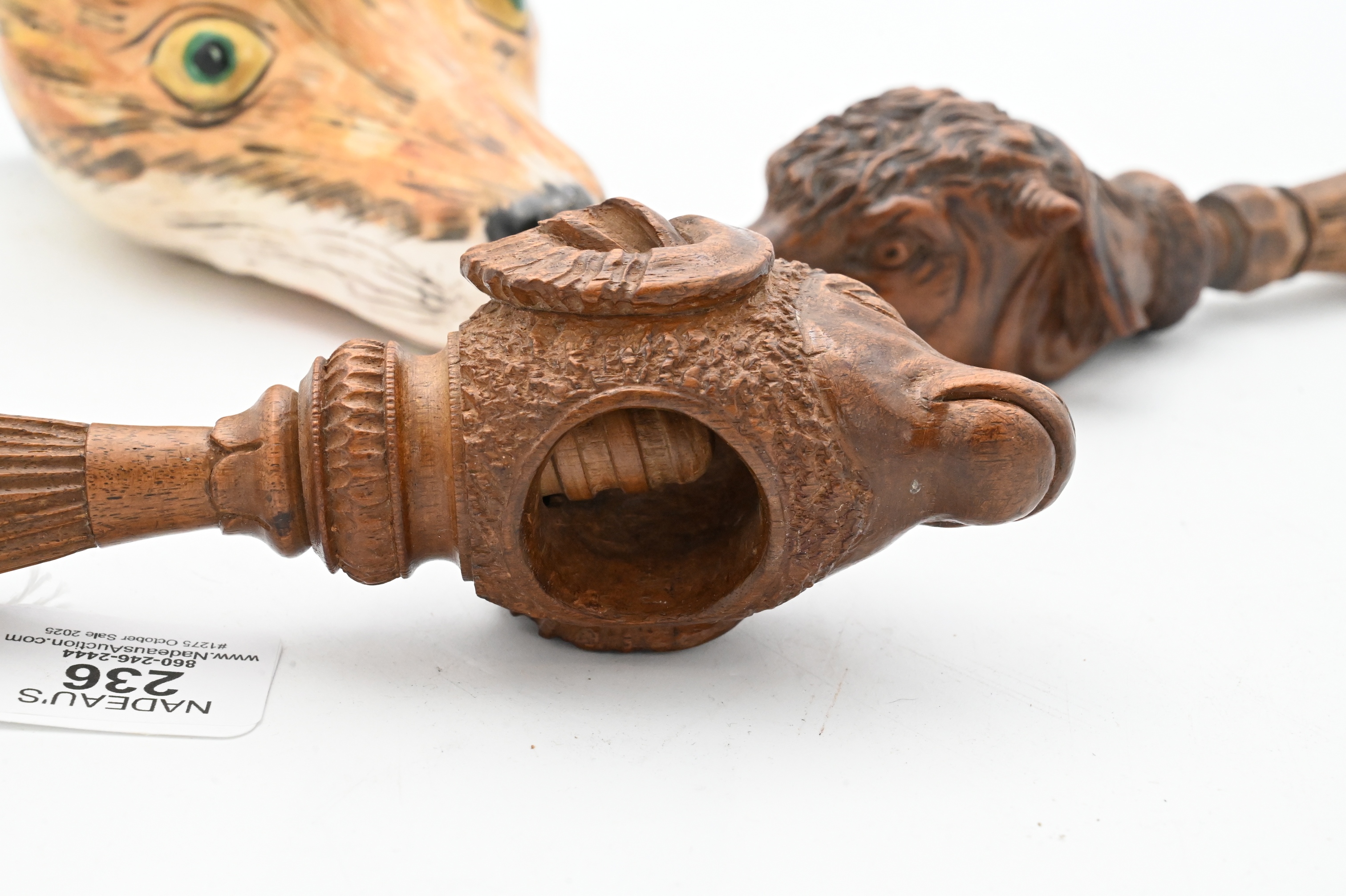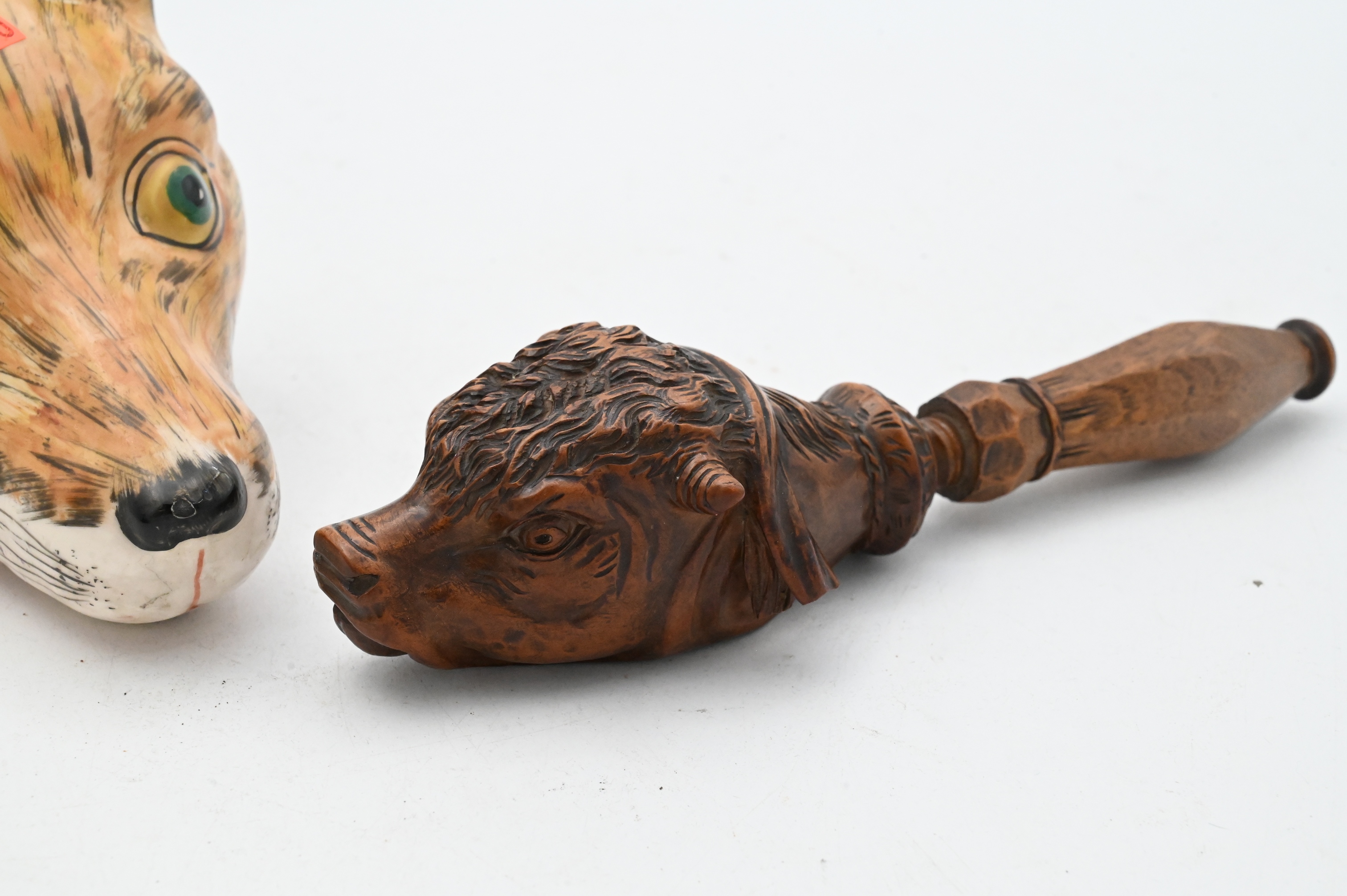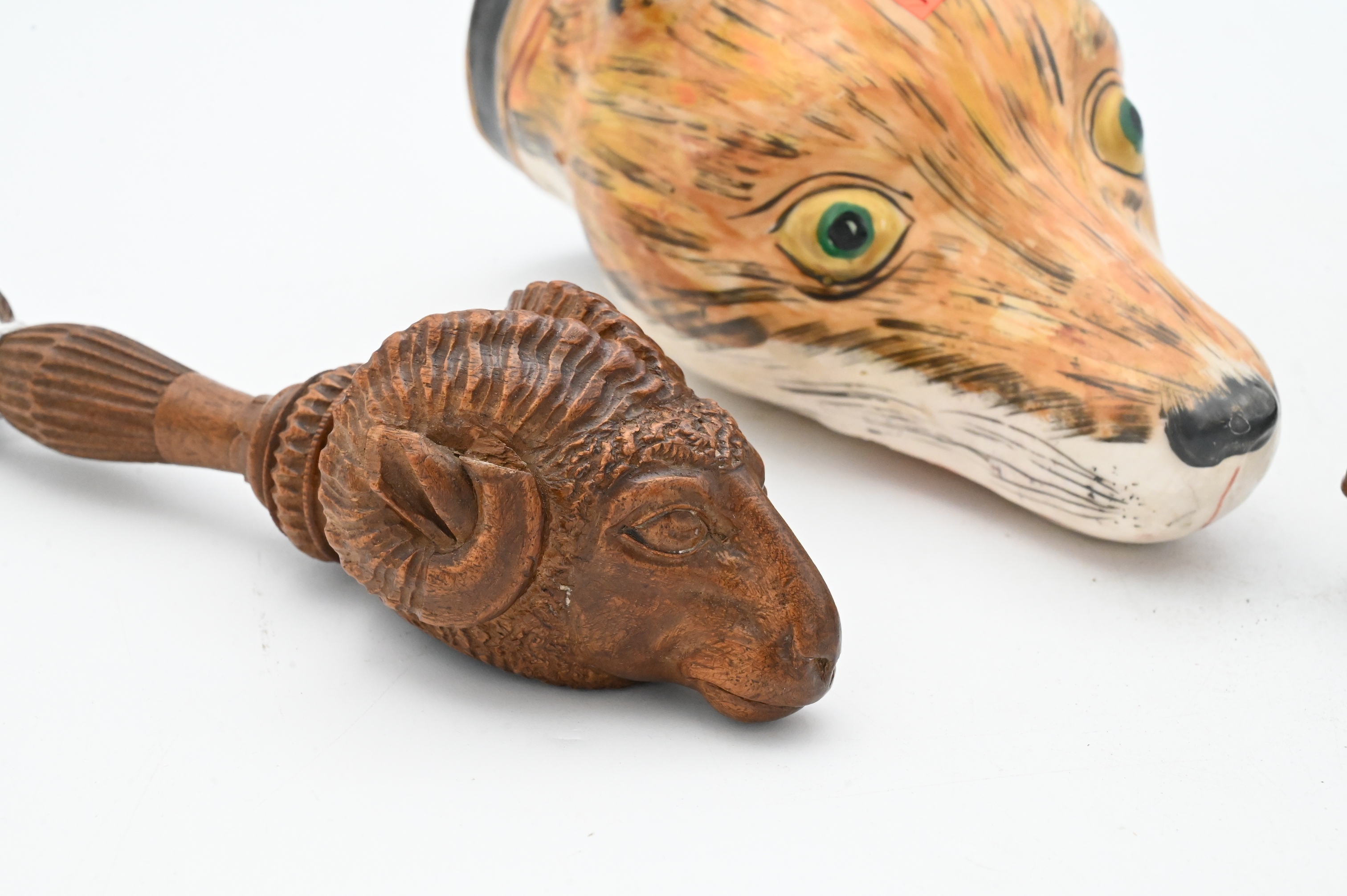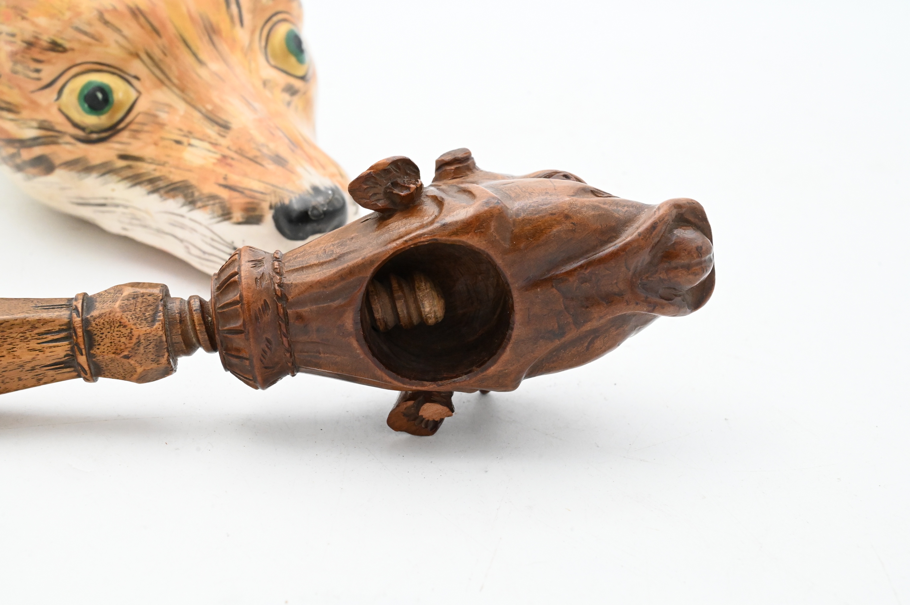 Fox head form ceramic stirrup cup, marked Italy, length 7 1/4 inches, two folk art carved wood Ram’s Head and cow screw nutcrackers