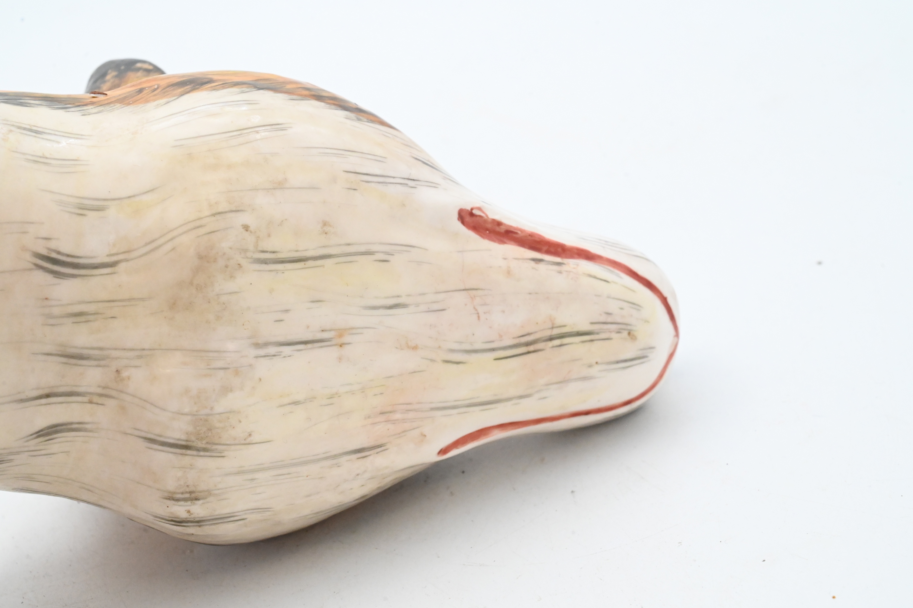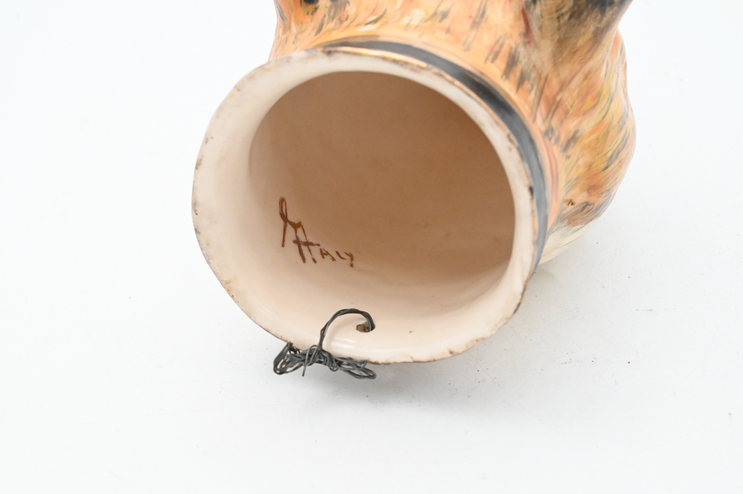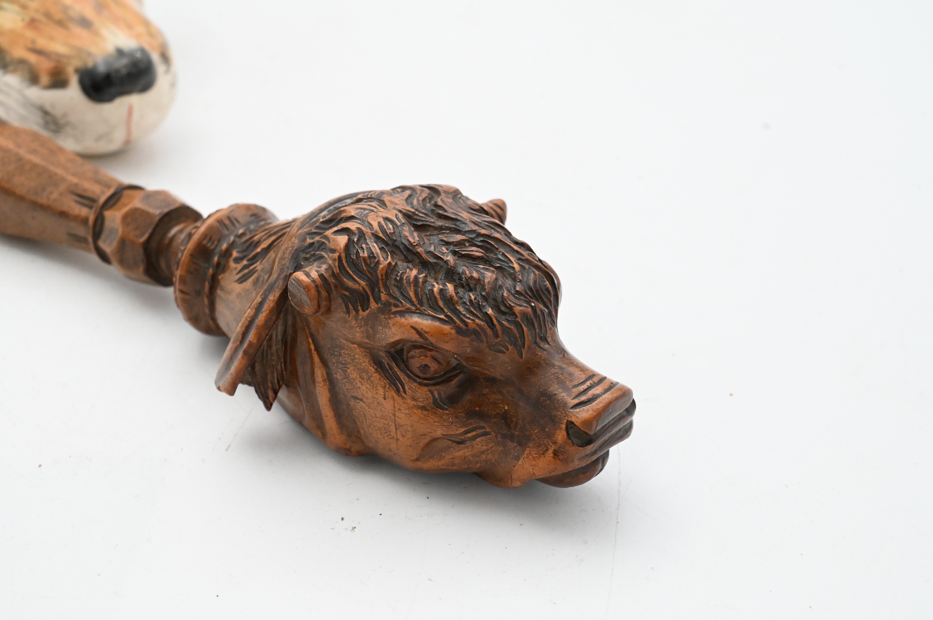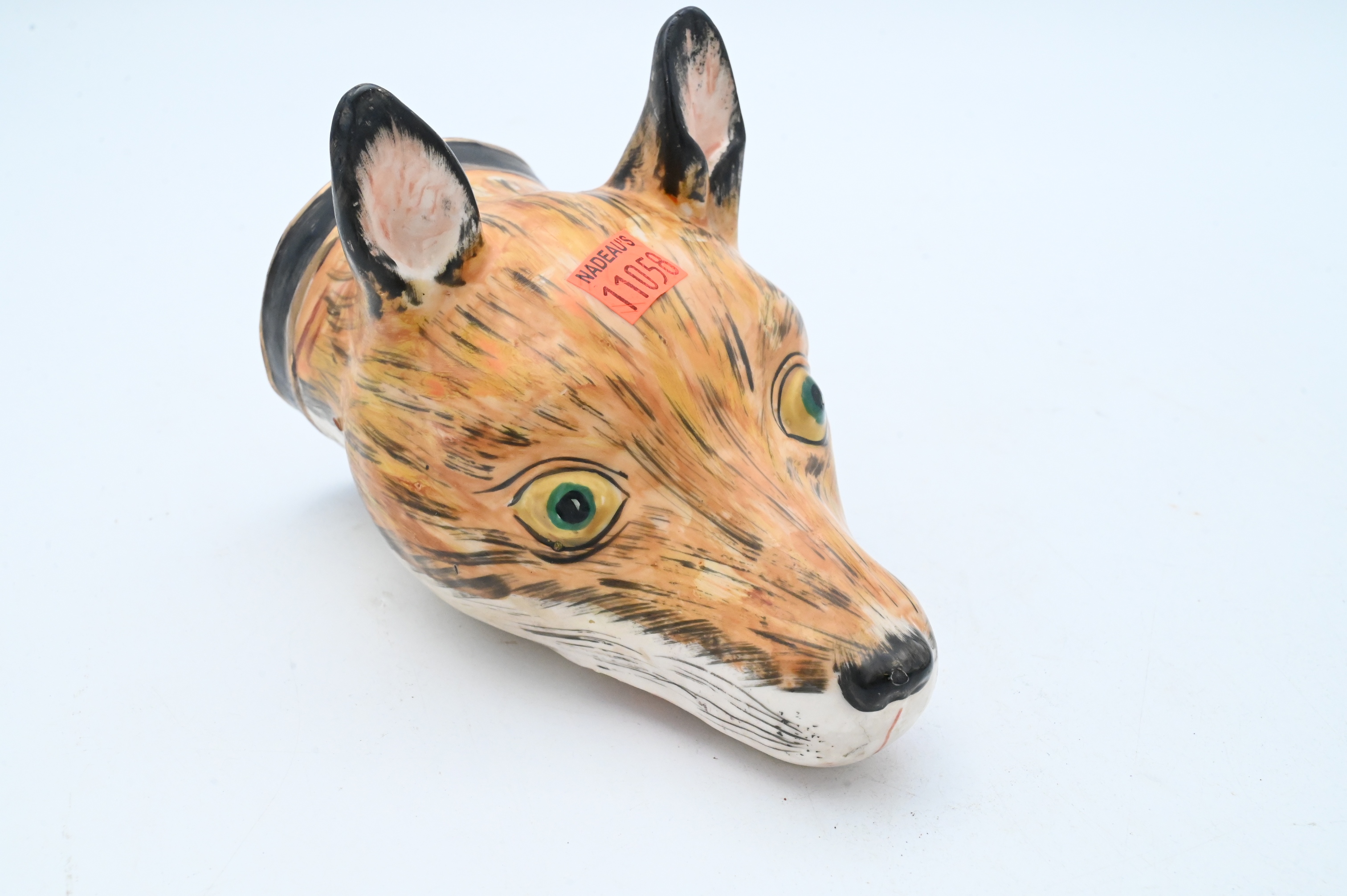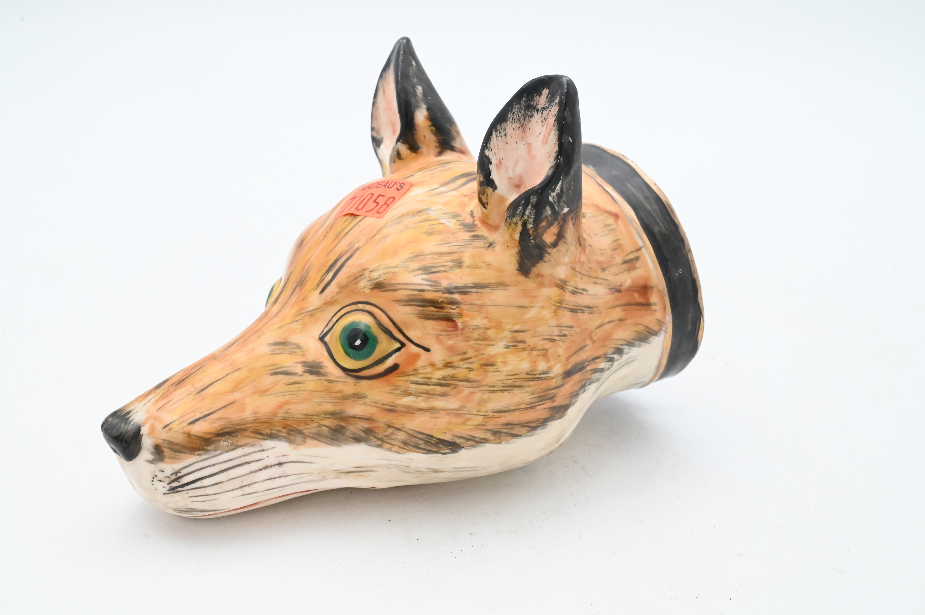 Fox head form ceramic stirrup cup, marked Italy, length 7 1/4 inches, two folk art carved wood Ram’s Head and cow screw nutcrackers