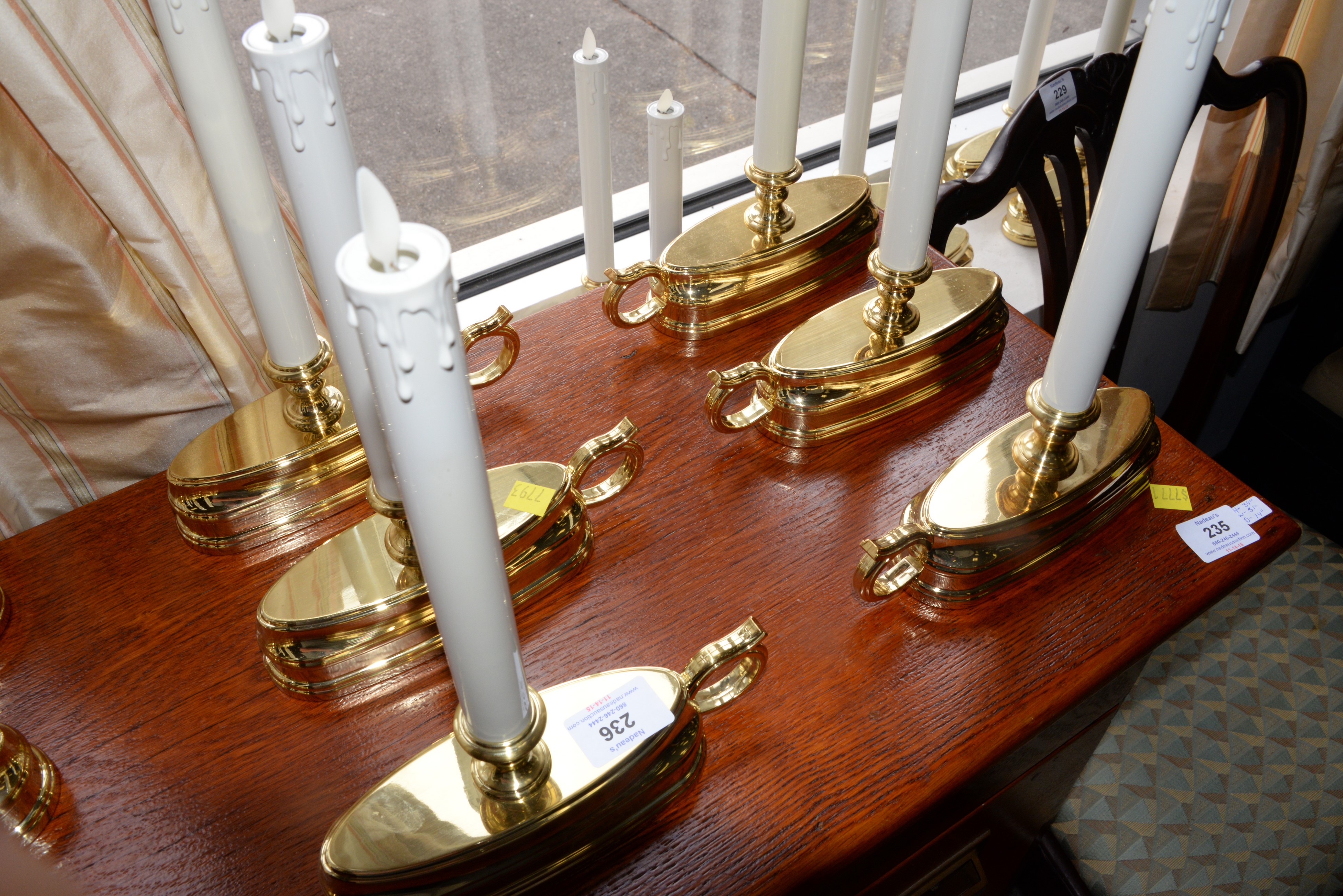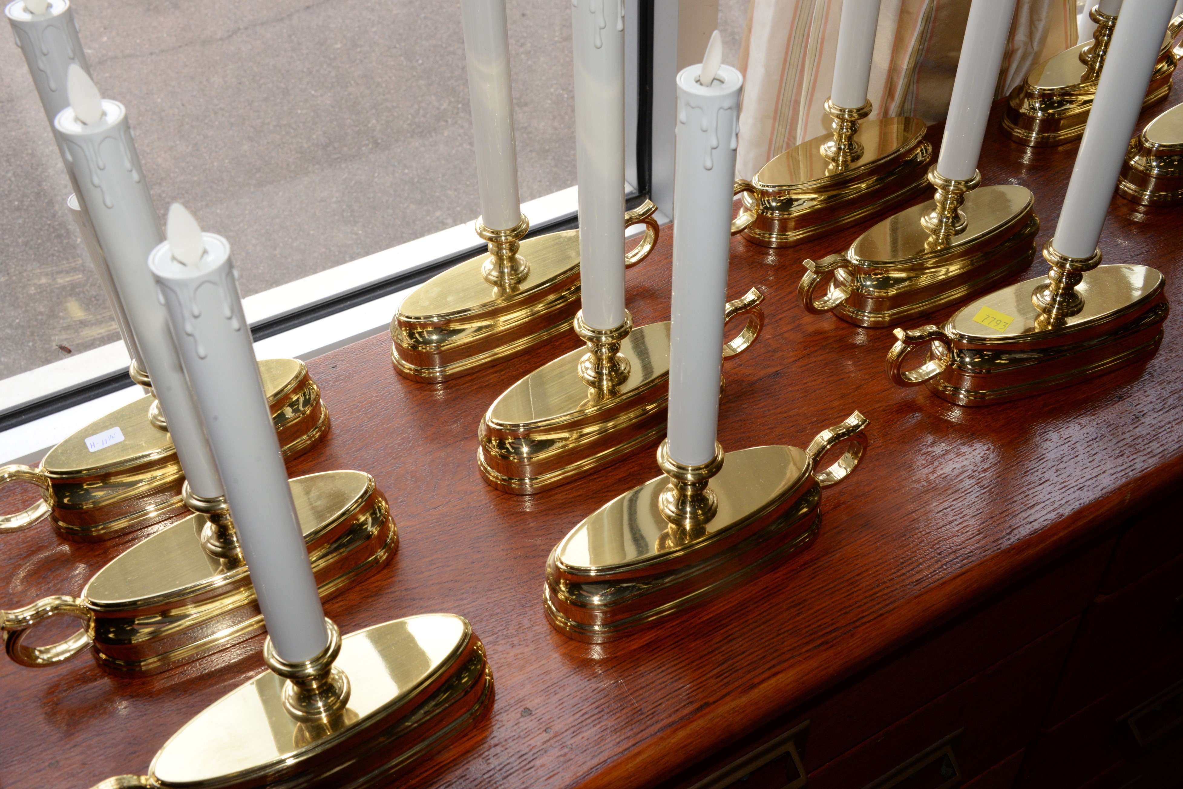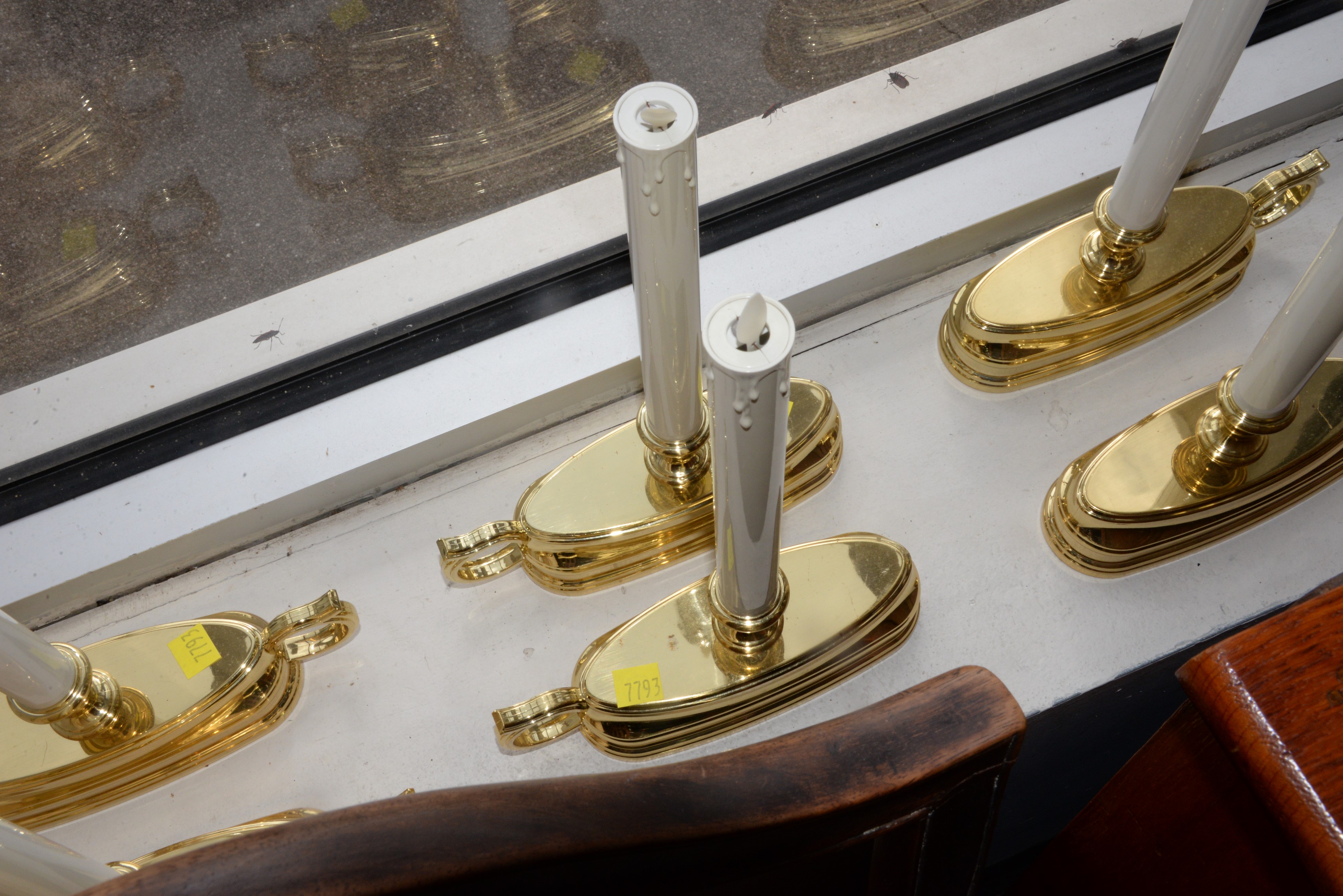 Lot 236: Twenty-seven Luminara window candles, brass color, real flame effect with timer. ht. 12 in.