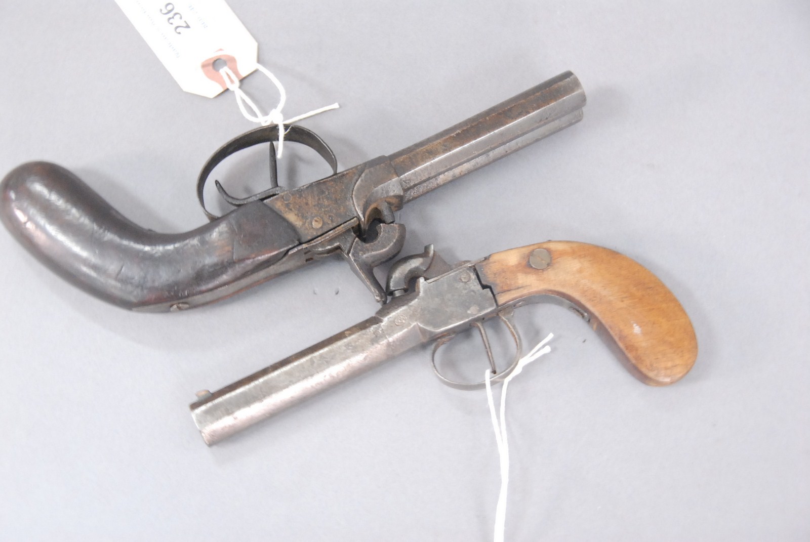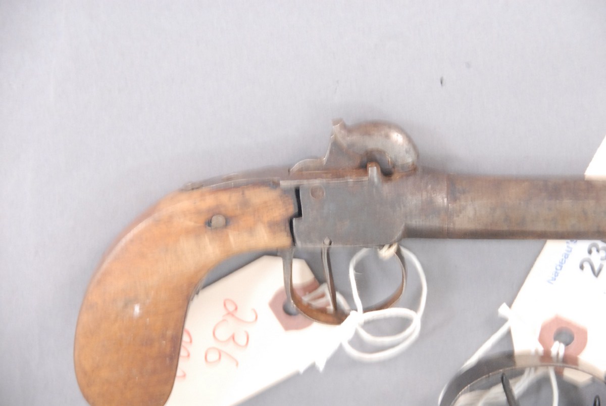 Two Belgian percussion pistols, one single shot, one double bbl.