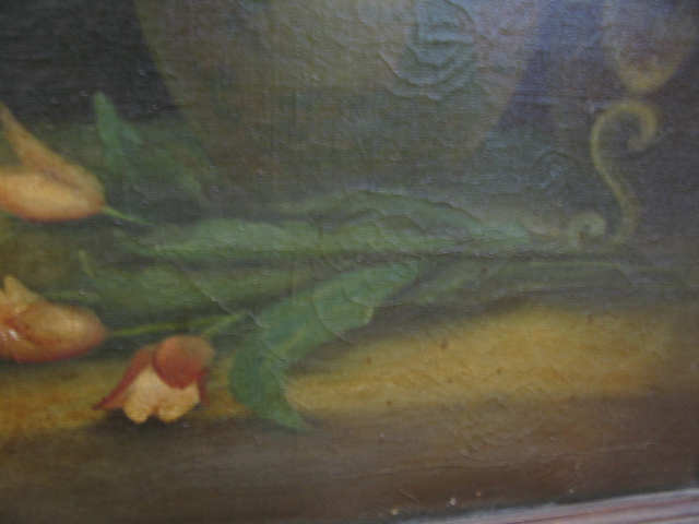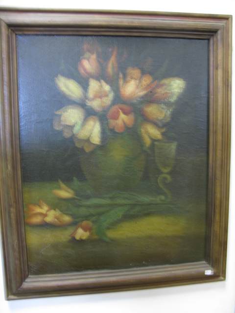 Two oil paintings, still lifes of flowers in vase and one of fruit.