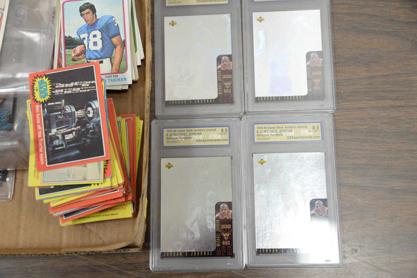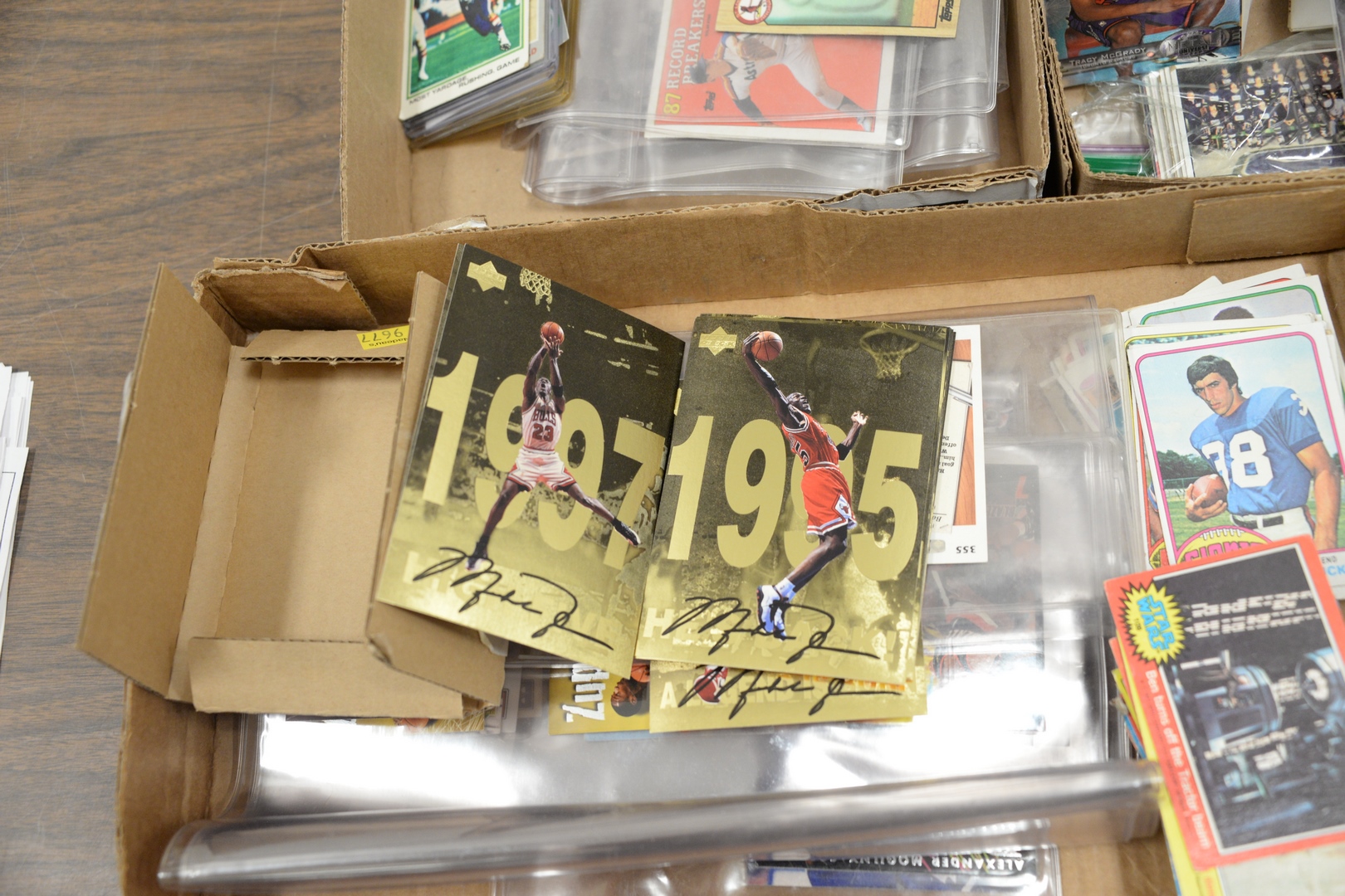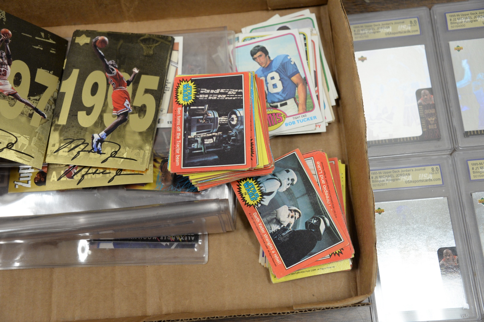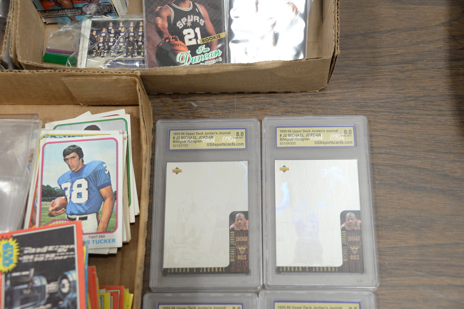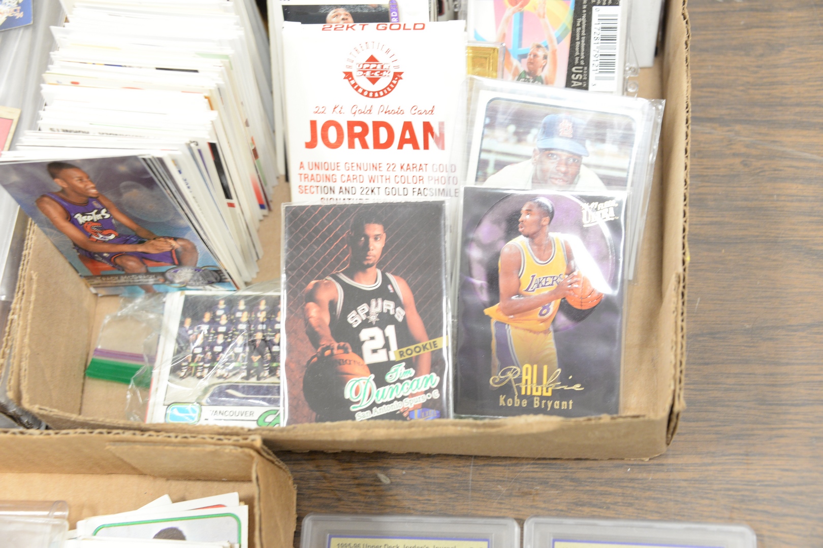 Lot 236: Two tray lots of trading cards to include Kobe Bryant Rookie, Tim Duncan Rookie, graded Michael Jordan cards along with approximatel…