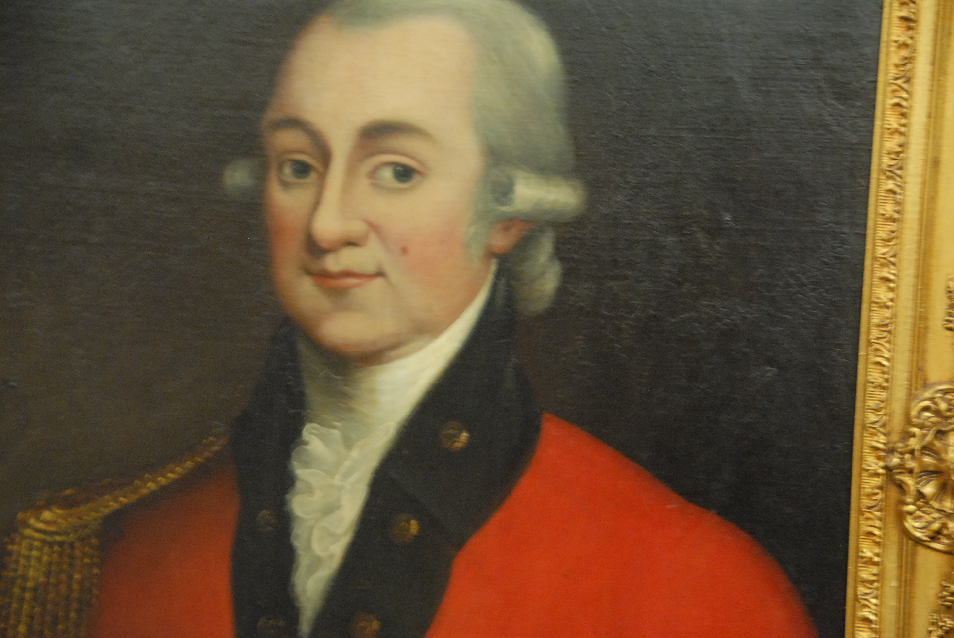 19th Century oil on canvas bust of a man wearing a red coat.