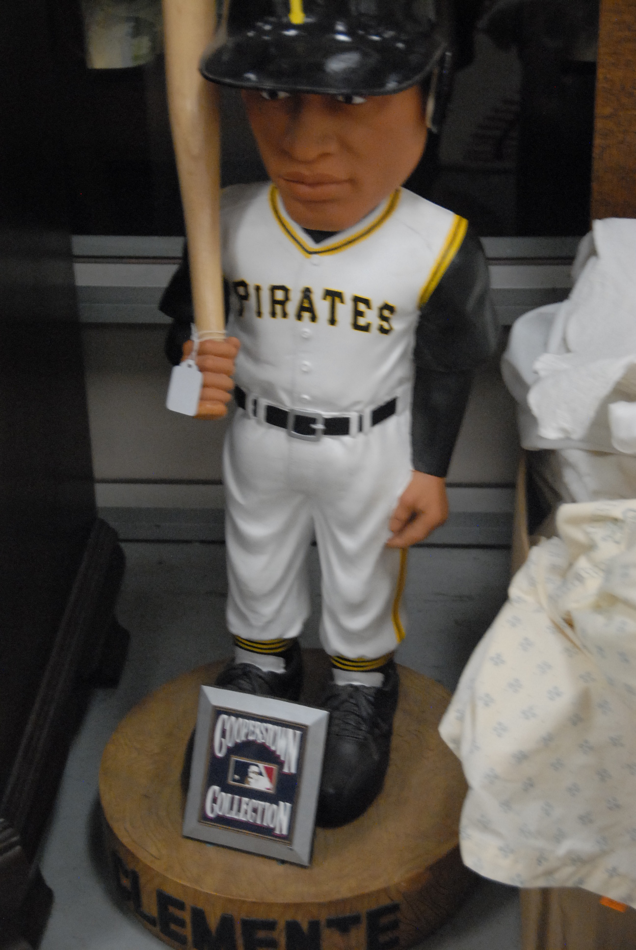 Lot 237: Baseball collection lot including Clemente bobble head composition doll ht. 35 in., two baseball glove lamps, one wall hanging, pitc…