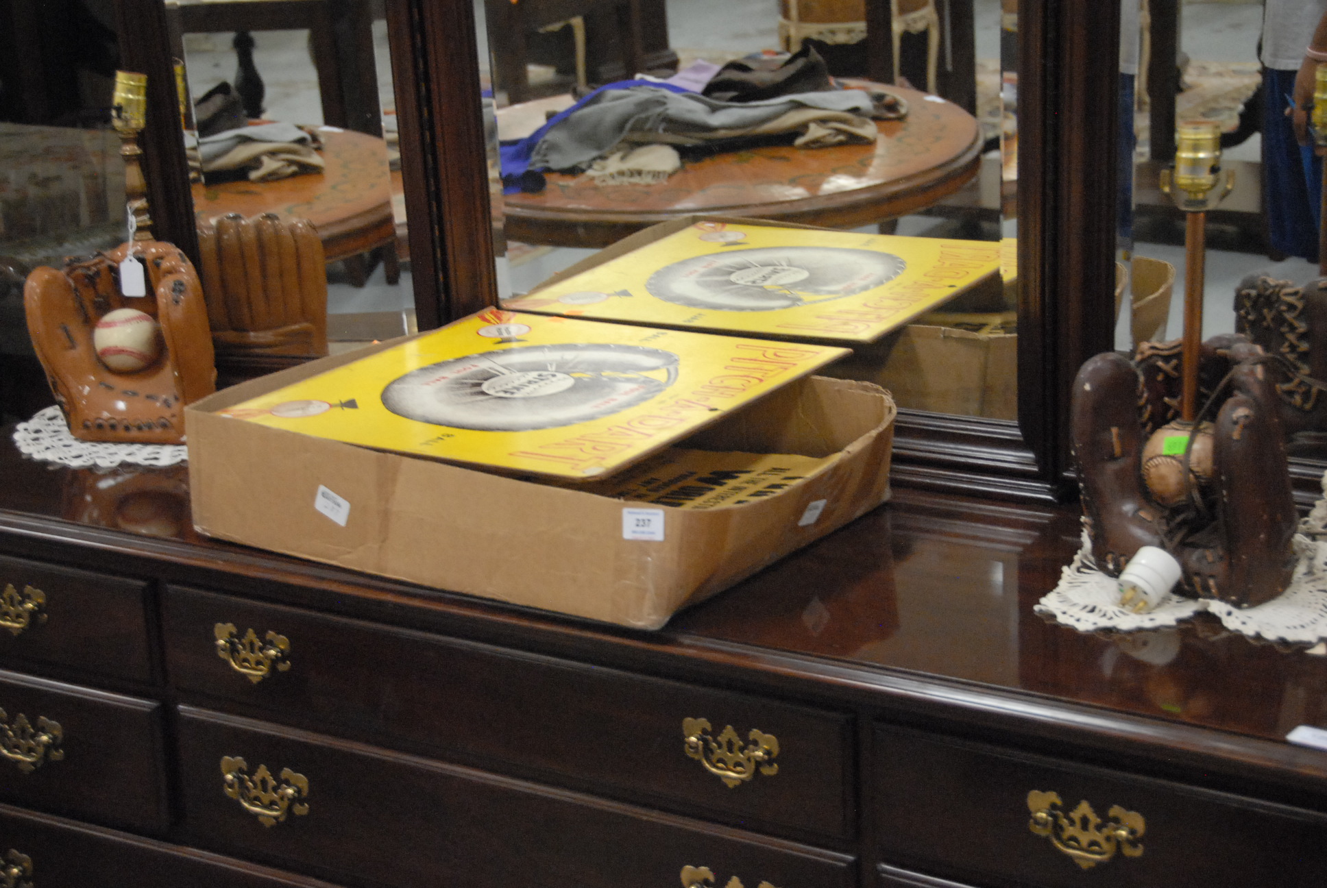 Baseball collection lot including Clemente bobble head composition doll ht. 35 in., two baseball glove lamps, one wall hanging, pitch dart game and score sheets, and baseball small rug.