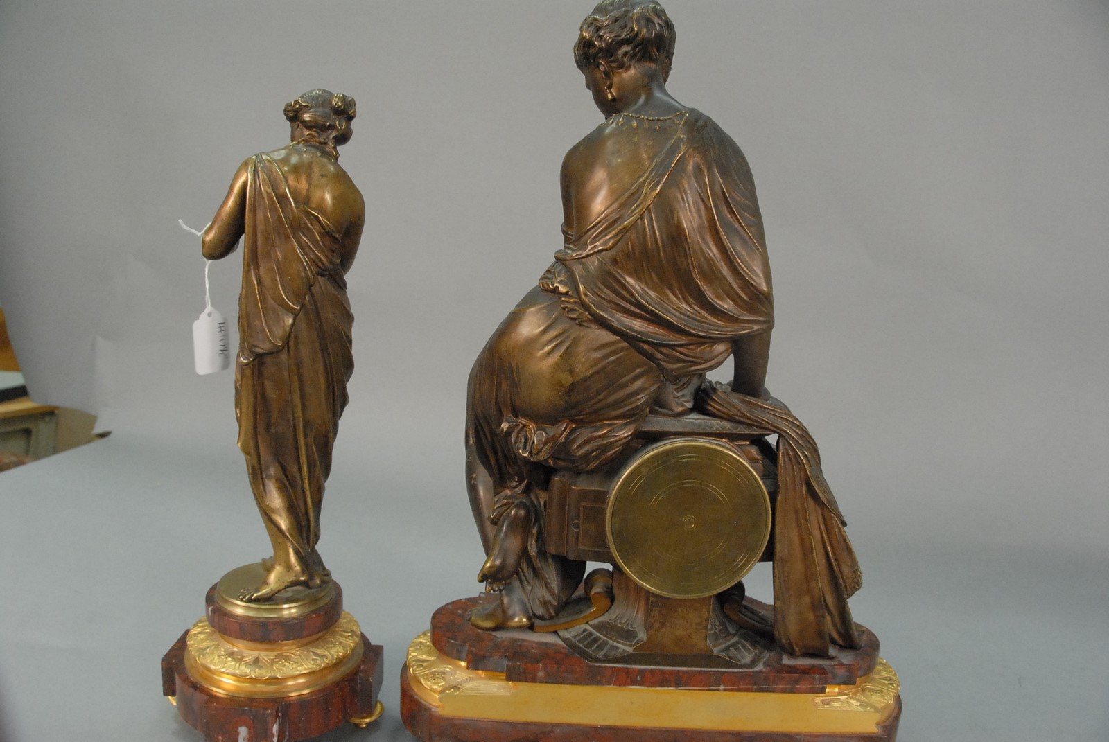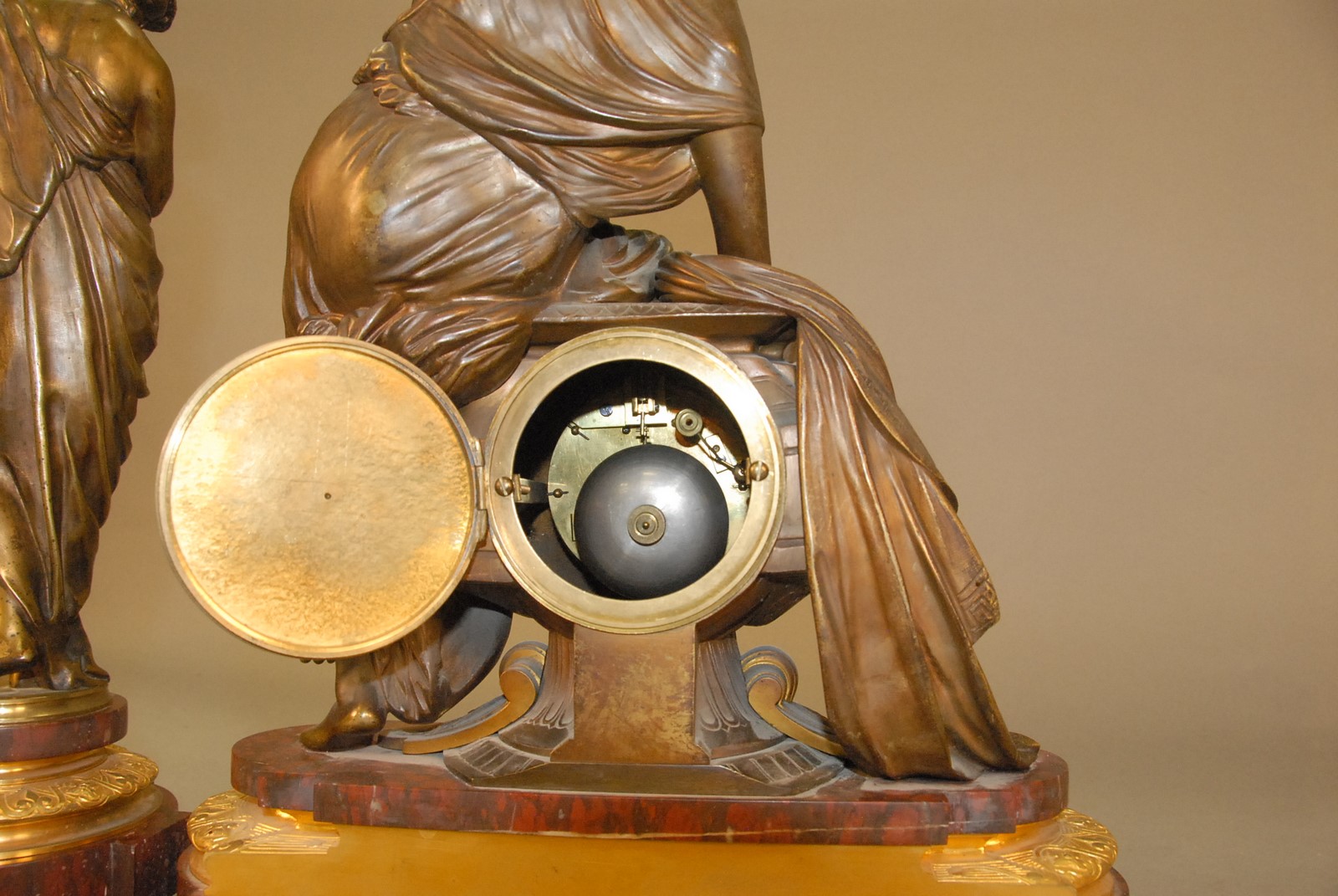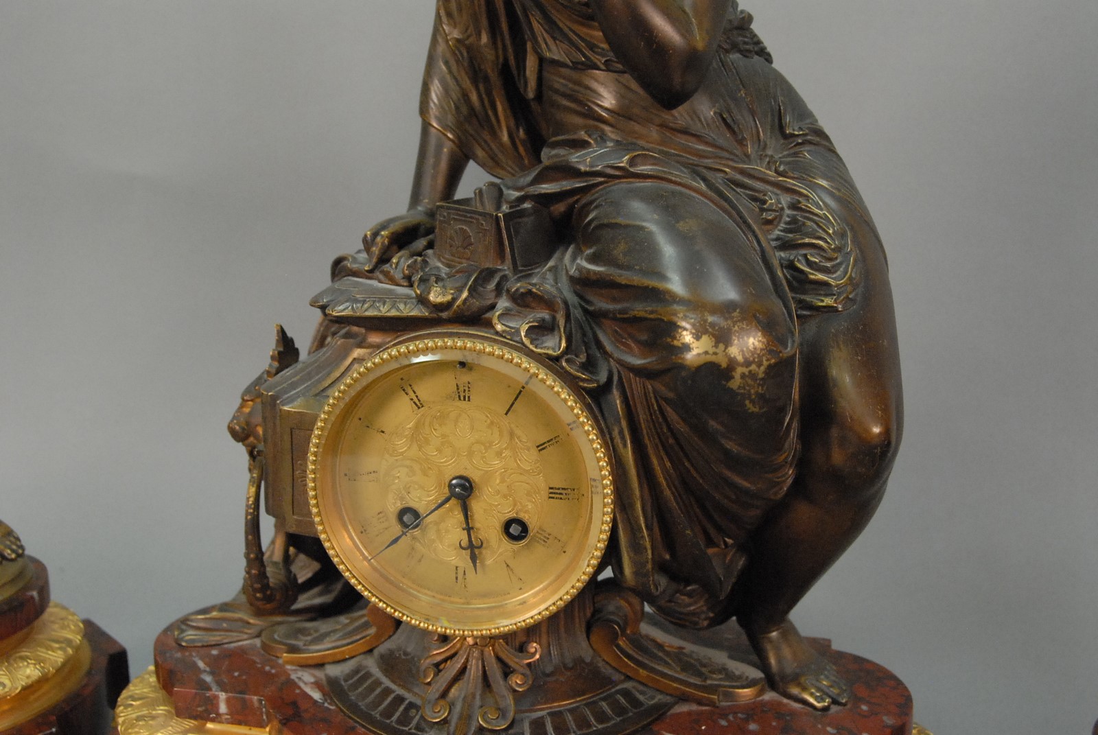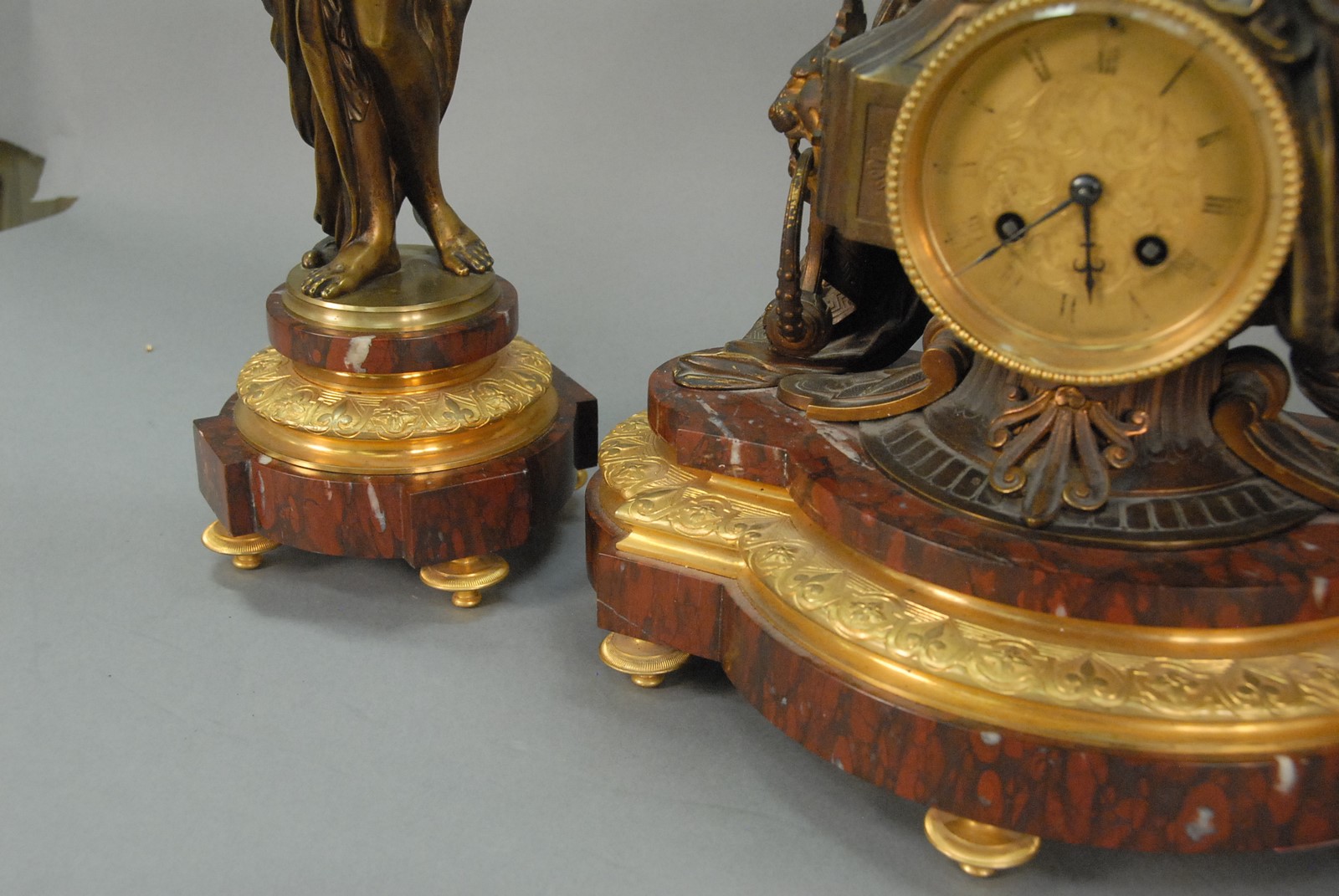 Lot 237: Bronze three piece clock set, clock with figural top along with pair of bronze figures all on rouge marble and gilt bronze bases, clock face marked Shreve Crump & Low, Boston. clock: ht. 20 in. figures: ht. 17 1/2 in.