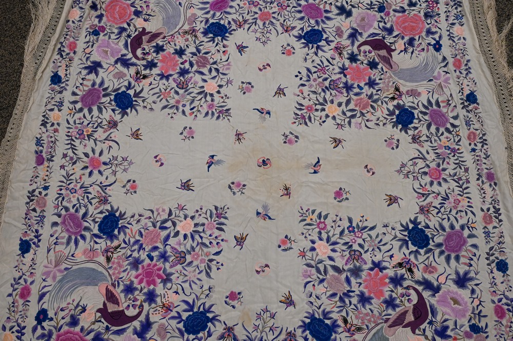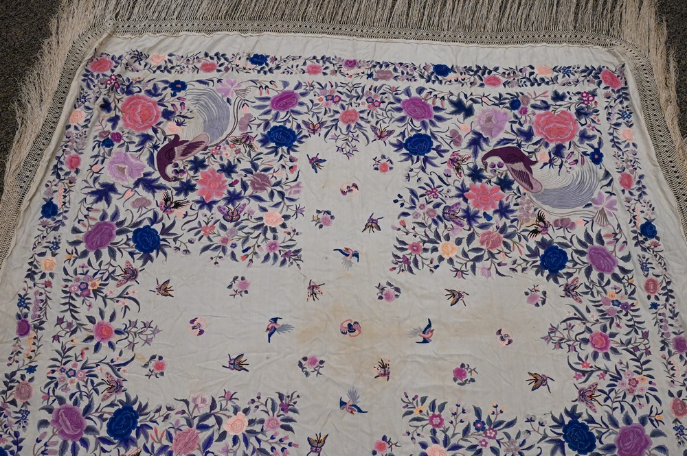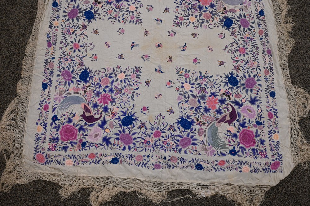Lot 237: Chinese Silk Embroidered Piano Shawl, having birds, butterflies, and bats, approximately 5′ 2″ x 6′ 3″.