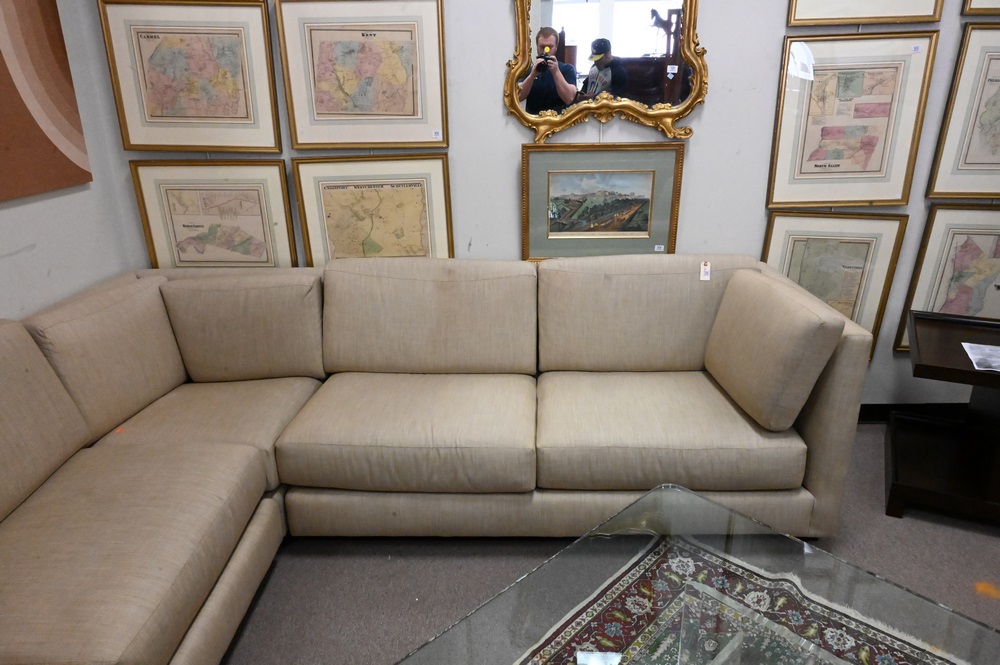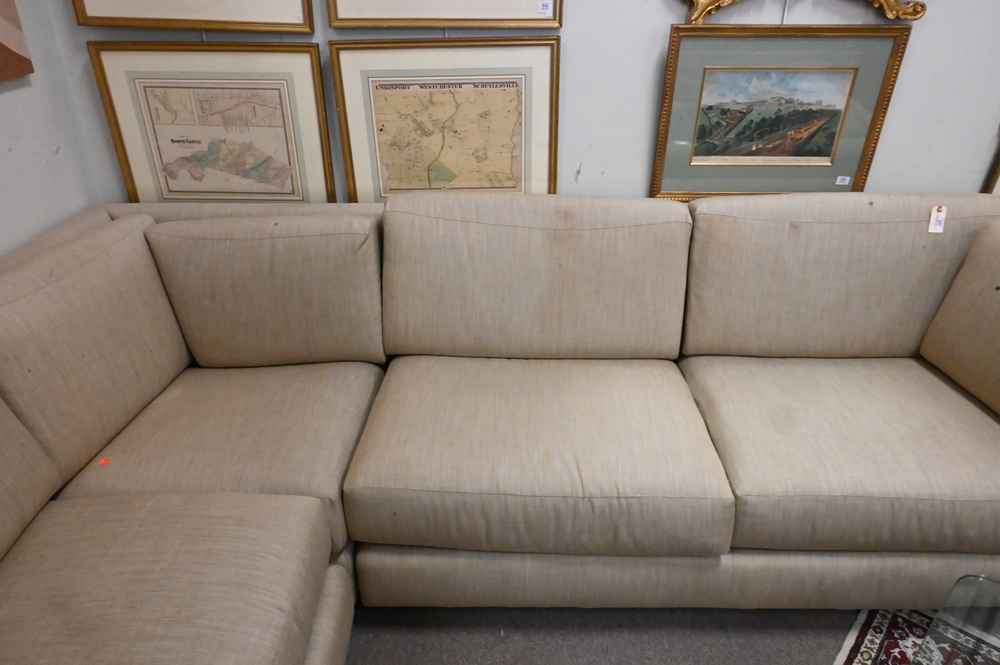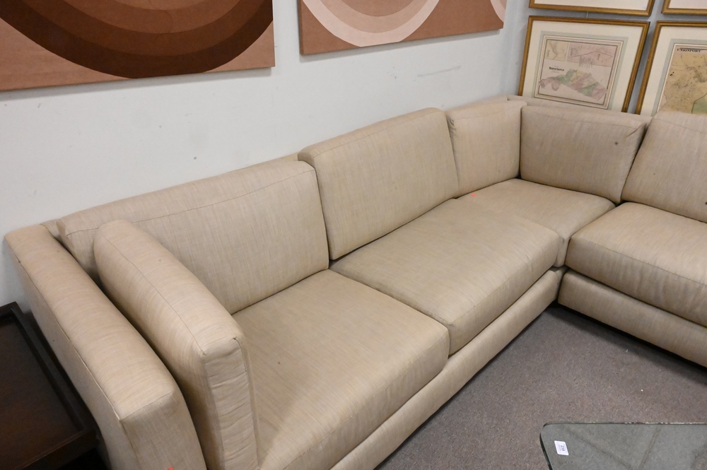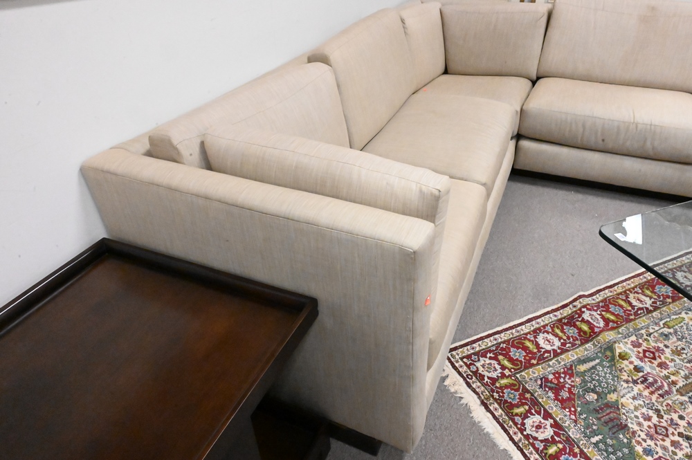 Lot 237: Contemporary Three Part Sectional Sofa, light tan upholstery, on walnut base, one piece is 111 inches long, the other is 72 inches long.