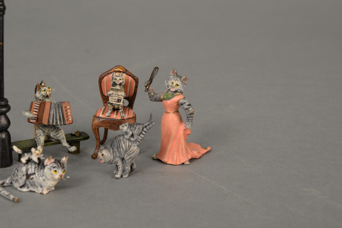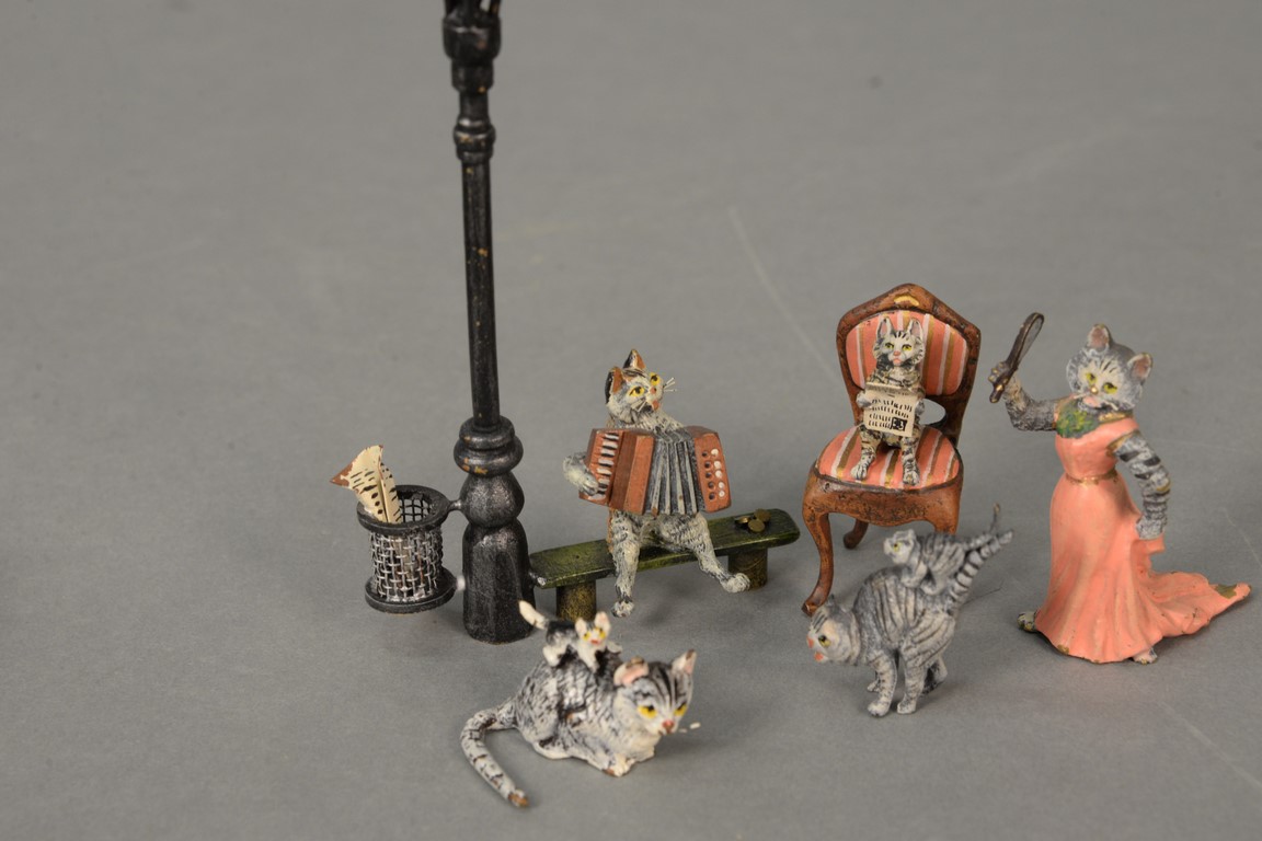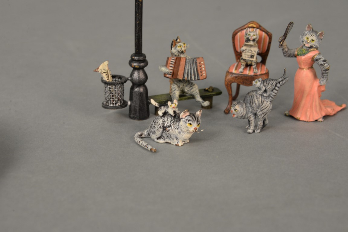 Five miniature Austrian cold painted bronze figural cats to include a cat on a chair, two cats with a kitten on it’s back, a cat wearing a dress, and a cat playing an accordion sitting on a park bench next to a street light.