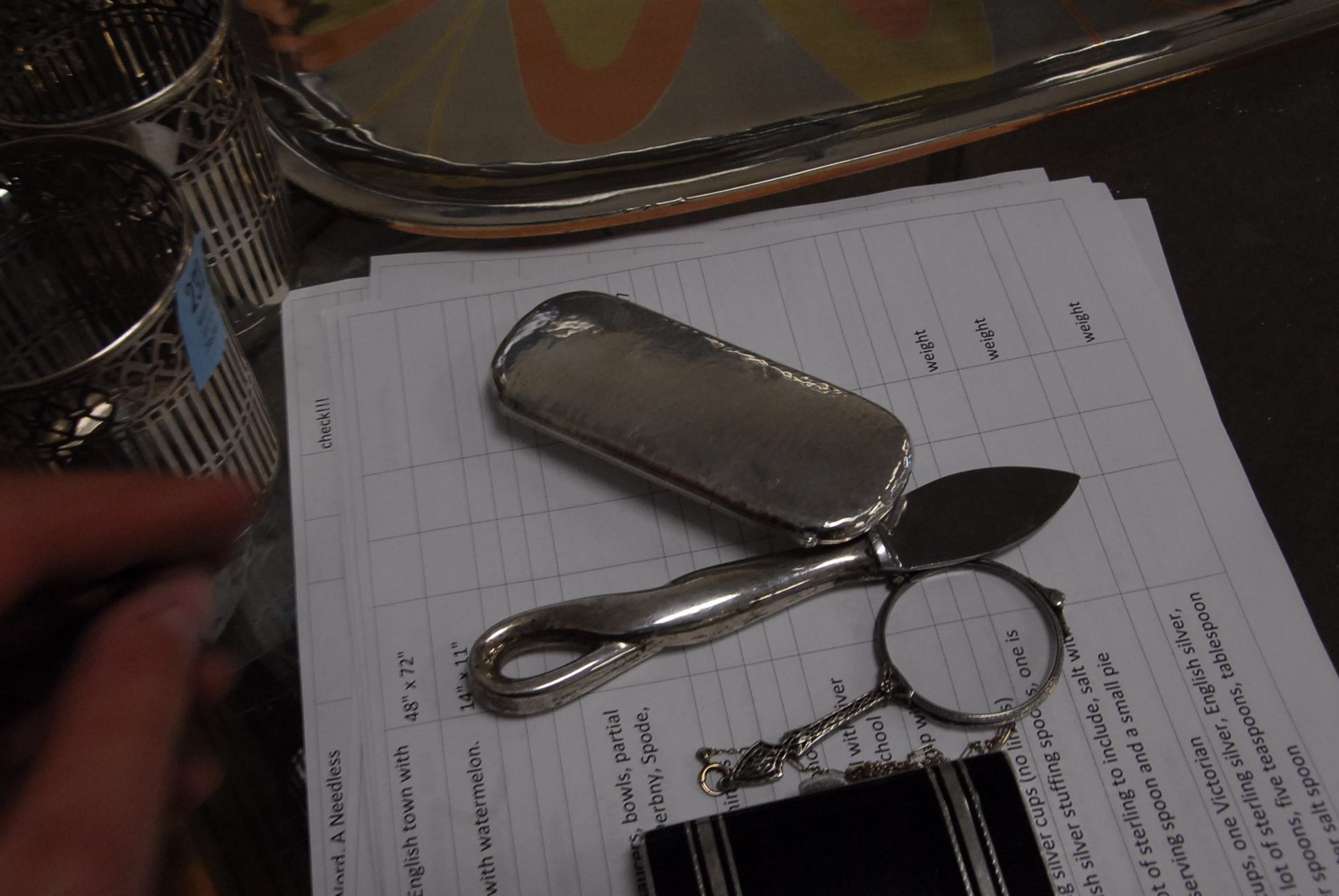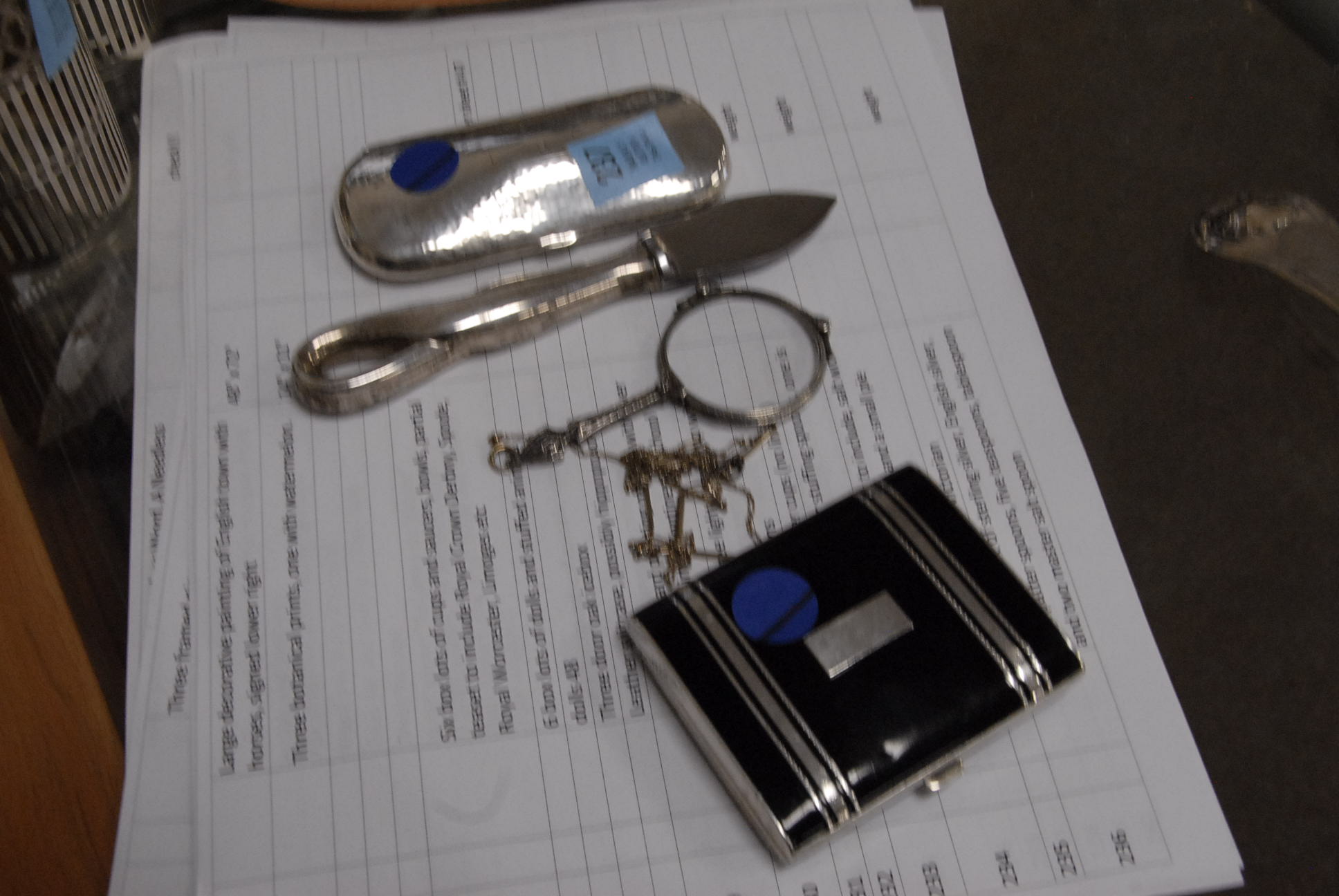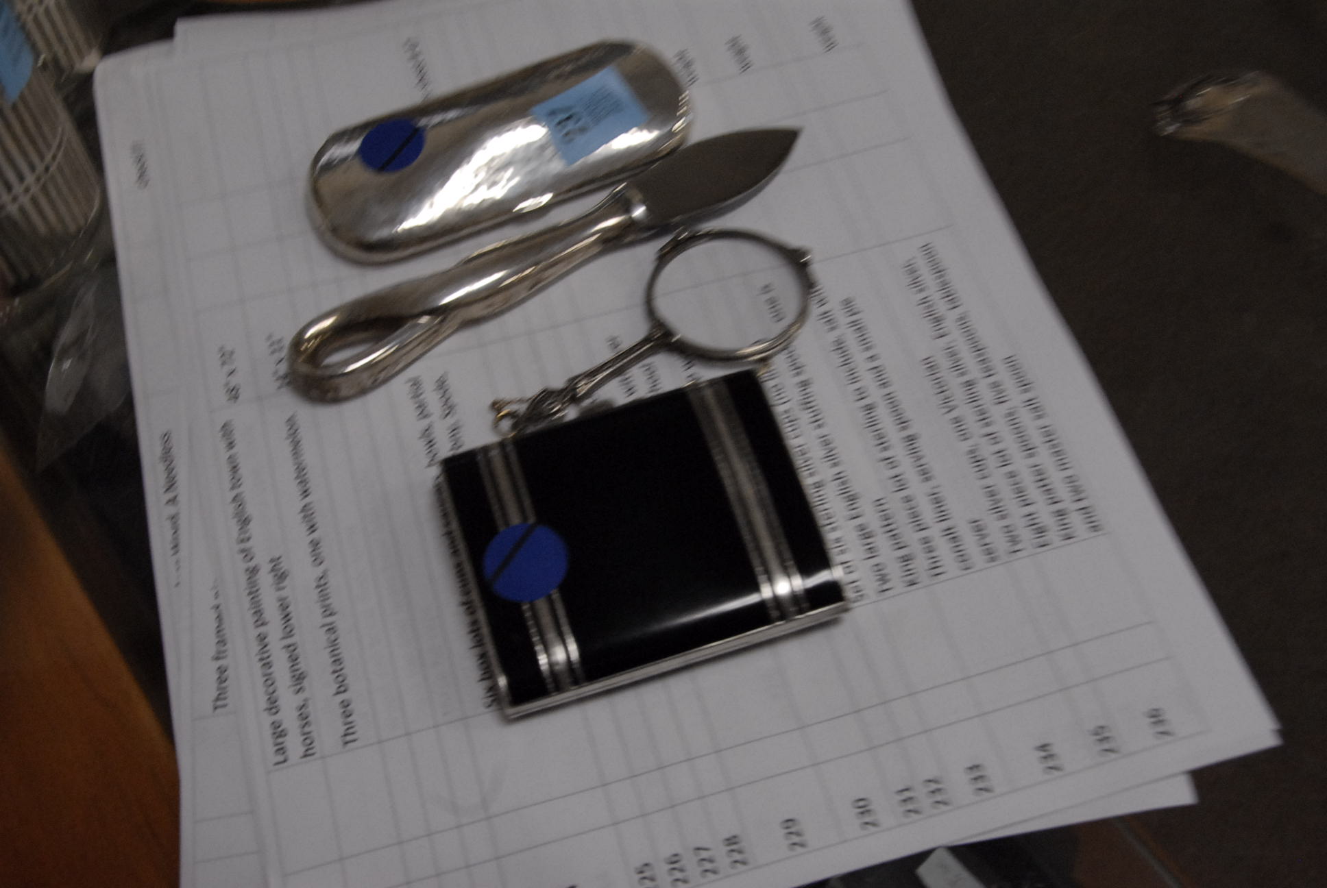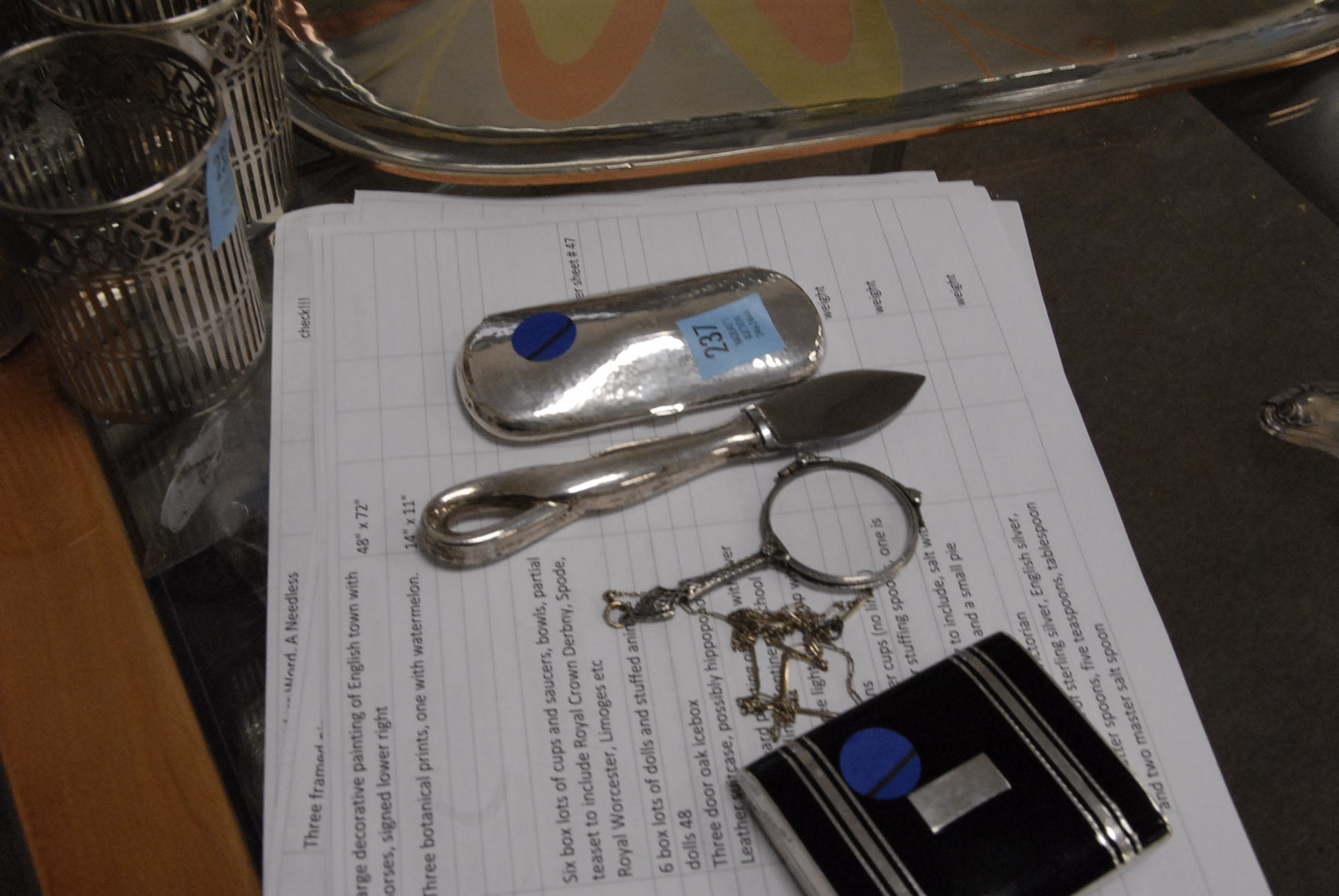 Four piece lot of sterling silver to include eyeglass case, enameled cigarette case, knife handle and longnette