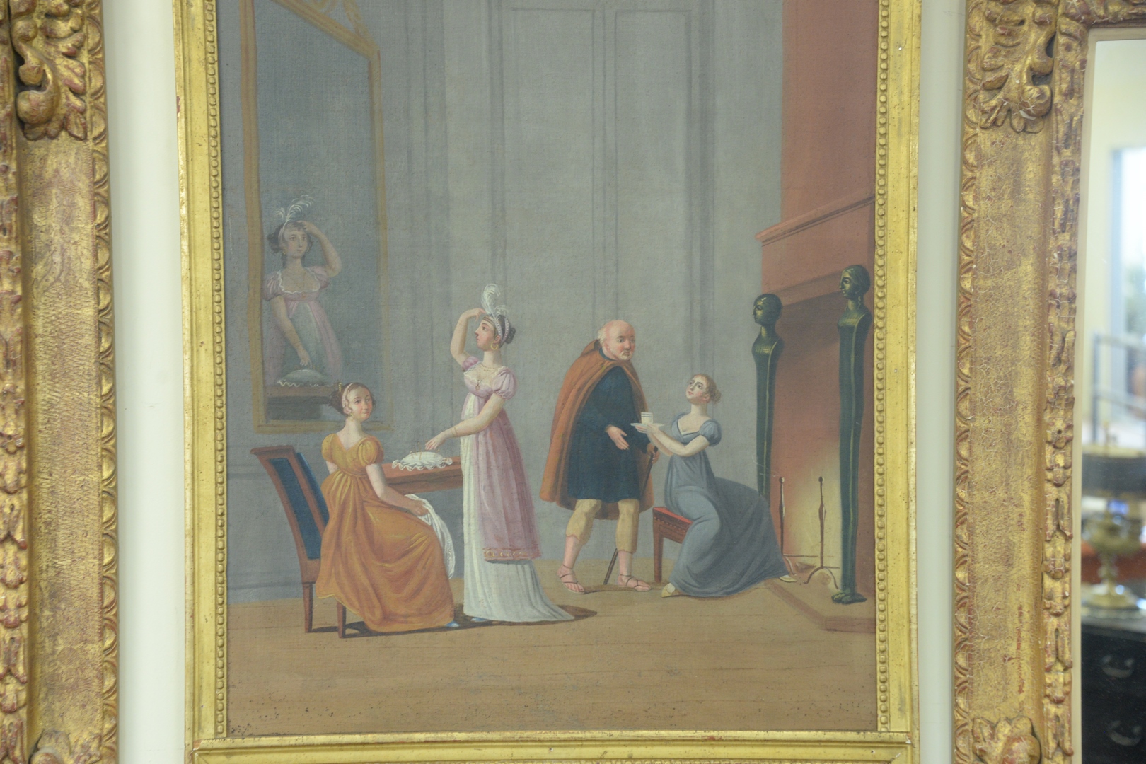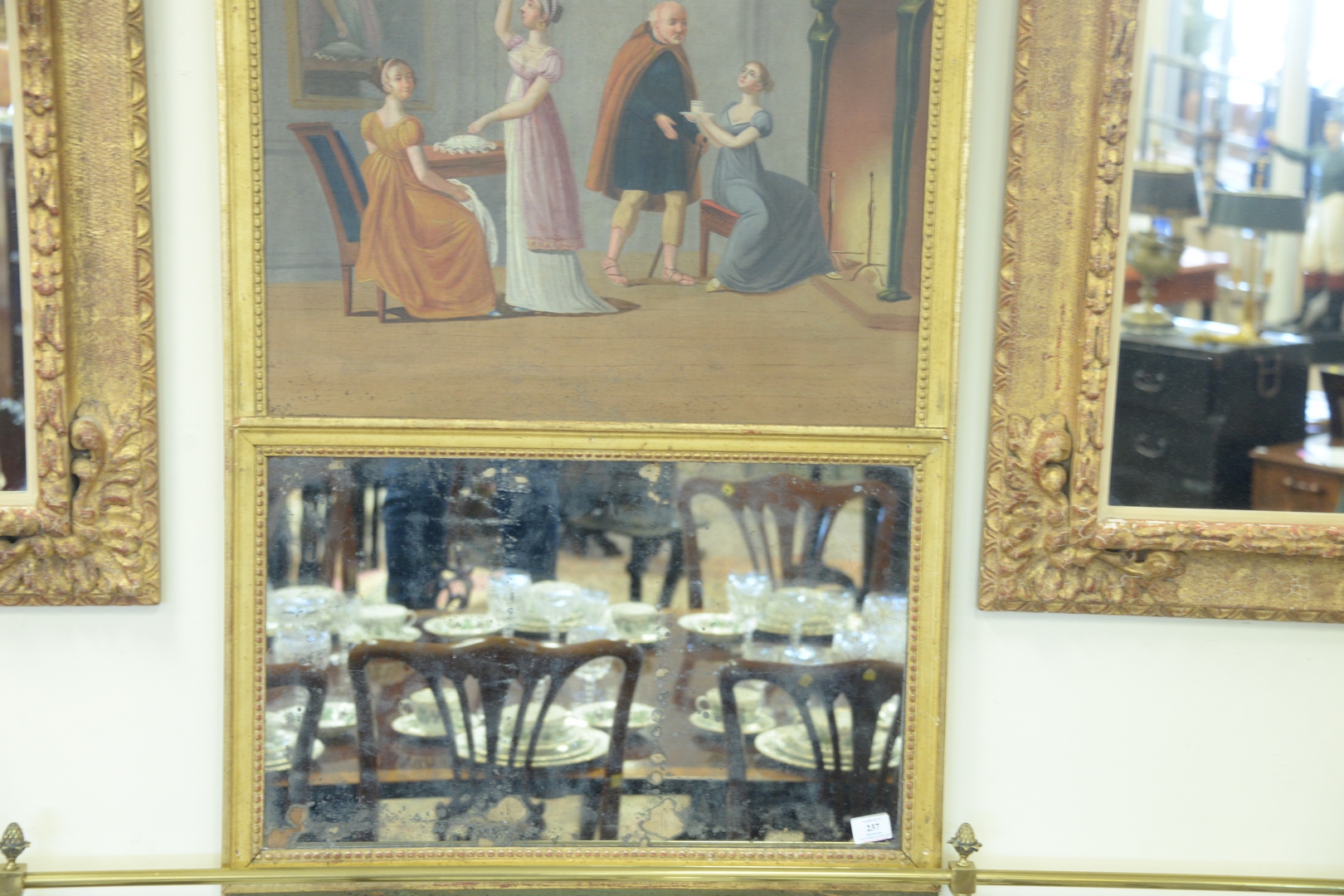 French Trumeau Mirror, oil on canvas, having large painted interior scene with figures