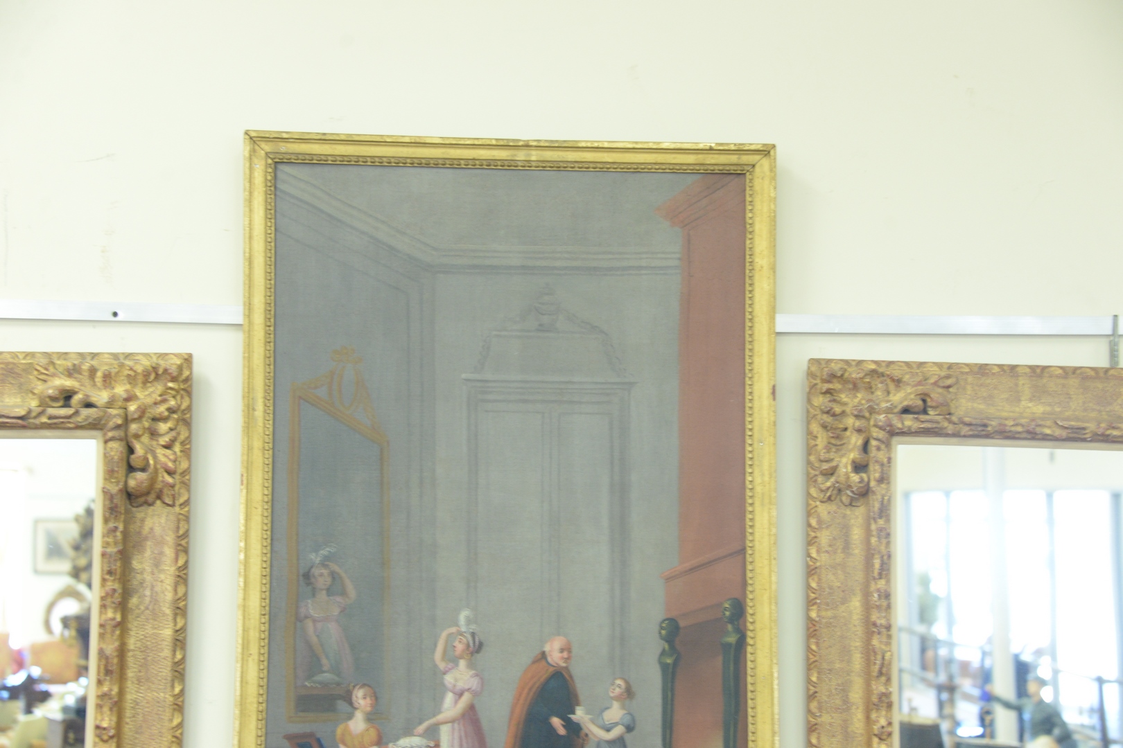 Lot 237: French Trumeau Mirror, oil on canvas, having large painted interior scene with figures 19th century, 62 1/2 x 28 1/2.