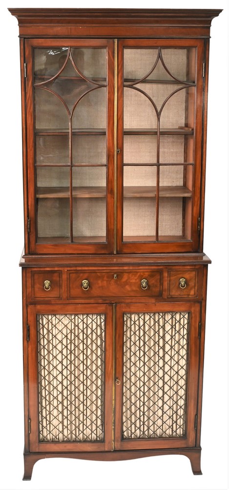 Lot 237: George IV Mahogany Cabinet in Two Parts top section having two glazed doors on lower section with one drawer over two frill work doors all set on French feet 19th century height 84 1/2 inches, width 6 inches, total width 36 inches