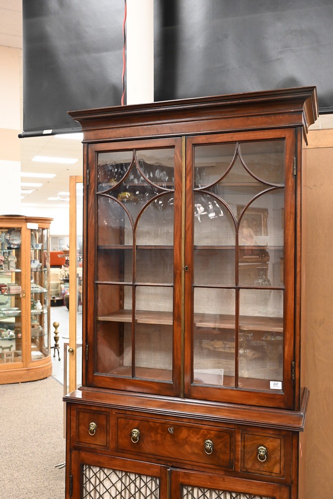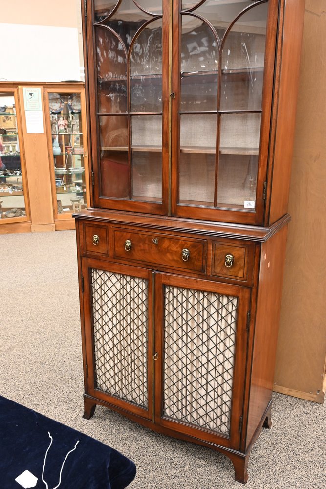 Lot 237: George IV Mahogany Cabinet in Two Parts top section having two glazed doors on lower section with one drawer over two frill work doors all set on French feet 19th century height 84 1/2 inches, width 6 inches, total width 36 inches