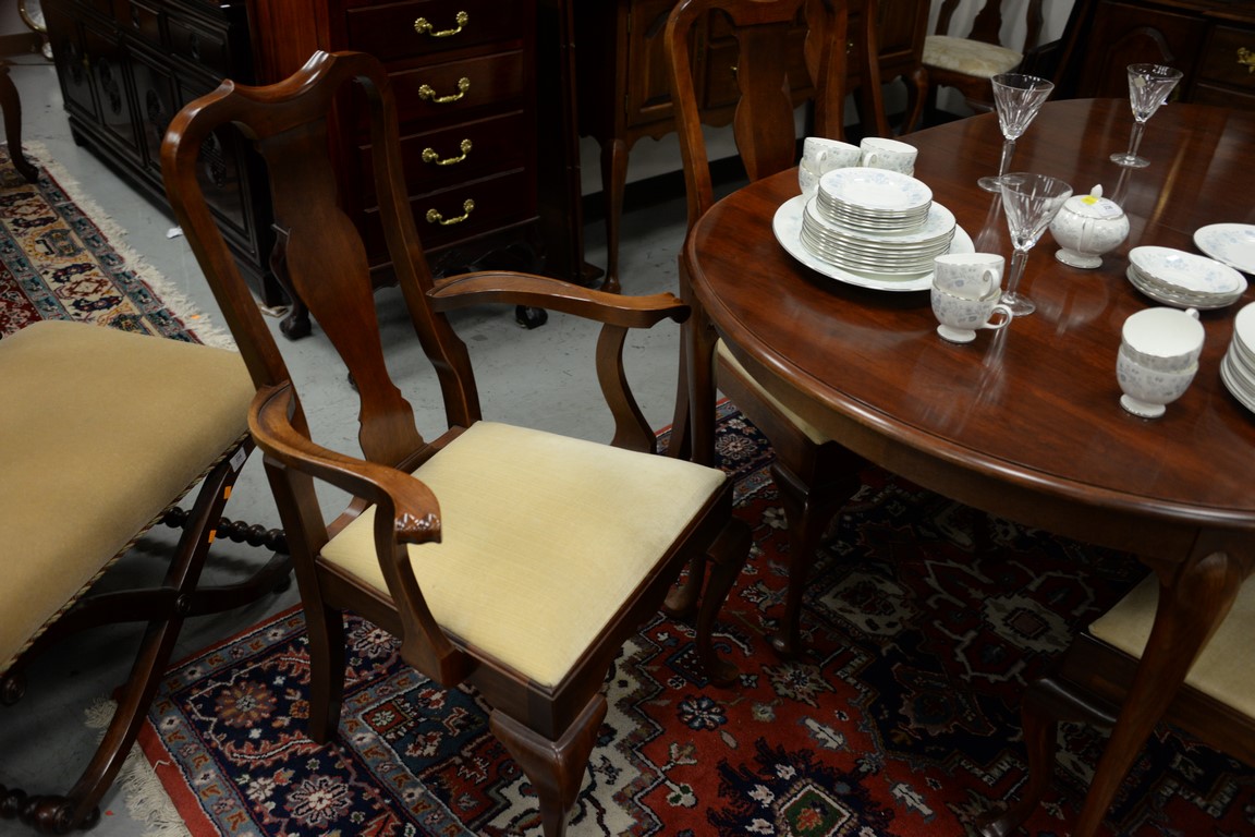 Lot 237: Hitchcock cherry nine piece dining set, Queen style chairs and oval table with two 15 leaves and pads. table: ht. 30 in. top: 44 …