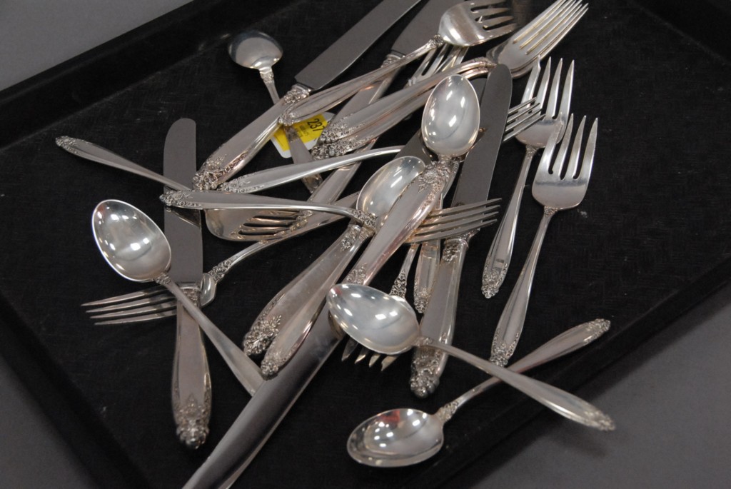 Lot 237: Internation Prelude Pattern sterling silver partial set of flatware, 24 pieces, 22 troy ounces plus six weighted handles.