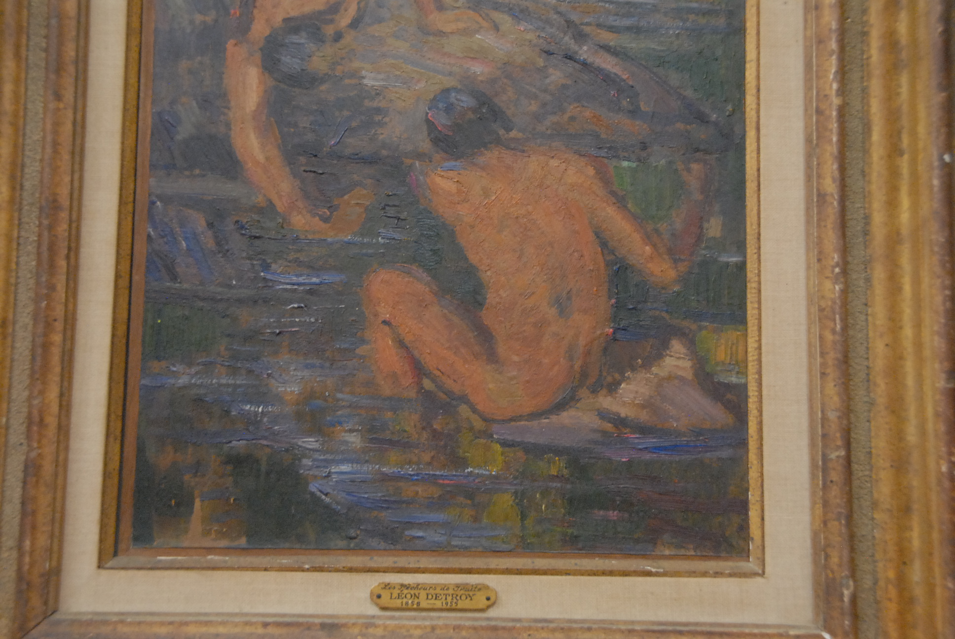 Lot 237: Leon Detroy 1857-1955 LES PECHEURS de FRUITE oil on canvas laid on cribbed panel signed lower left L. Detroy Melvin picture frame 22 1/4 x 13 1/4