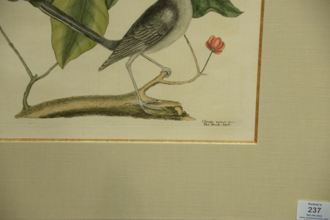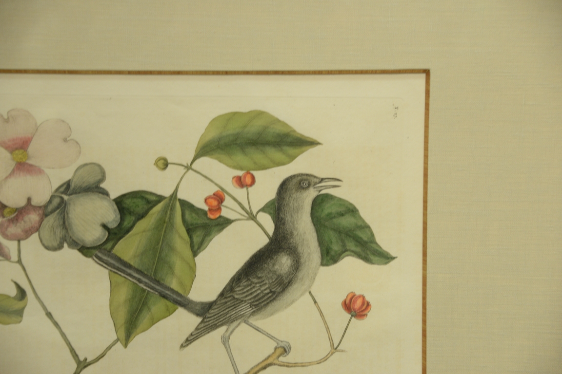 Pair of Mark Catesby hand colored engravings The Hairy Woodpecker, Black Oak The Red Belly’d Woodpecker Plate T19 and The Mock-bird plate T27. plate size each: 10 1/4 x 13 3/4, sight size each: 11 3 /4 x 15 1/4 Provenance: Property from Credit Suisse’s Americana Collection