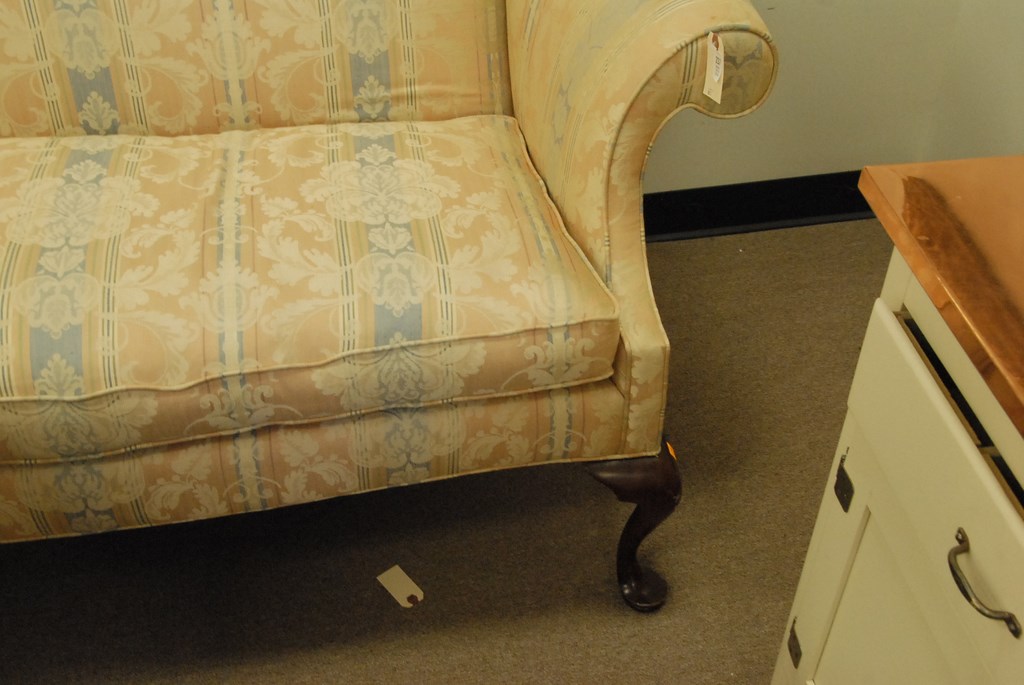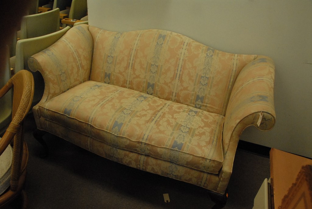 Queen Anne style upholstered seat with camel back, lg. 62 in.