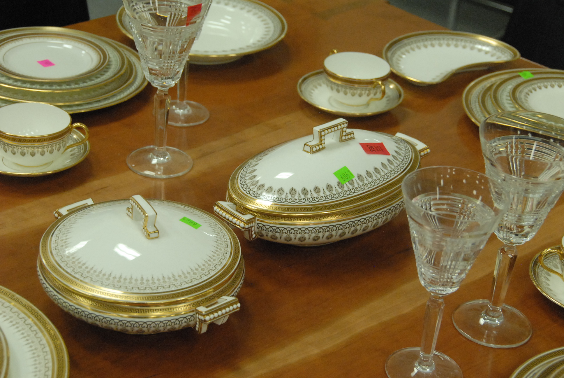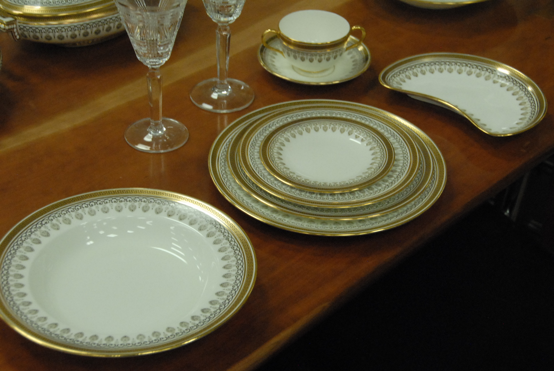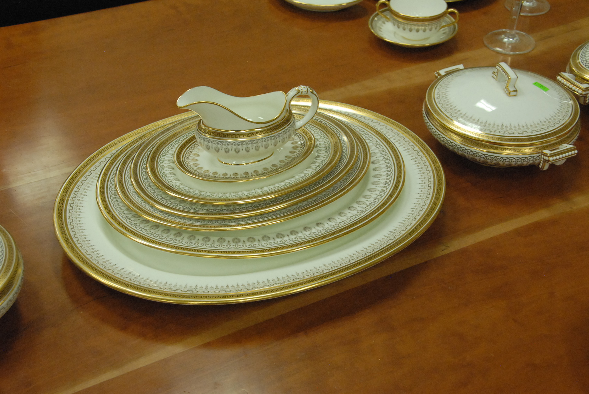 Set of Cauldron china dinnerware with gold greek key design border including dinner plates, luncheon plates, dessert plates, bread plates, bone plates, soup dishes, cups, saucers, graduated serving trays, open vegetable dishes, gravy boats, compote, and more, 126 total pieces.