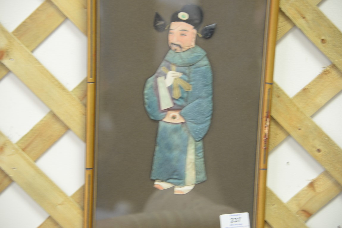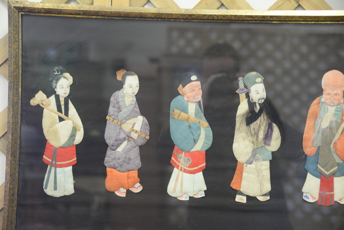 Lot 237: Three framed three dimentional Oriental figures, one having multiple figures painted and made up of silk, cloth, paper, and hair. 2…