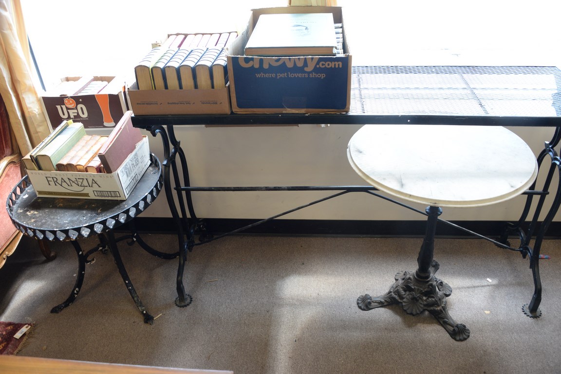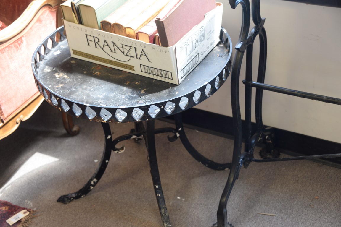 Three piece lot including iron outdoor serving table with mesh metal top and two small round tables. iron table: ht. 33 in. top: 18 x 59