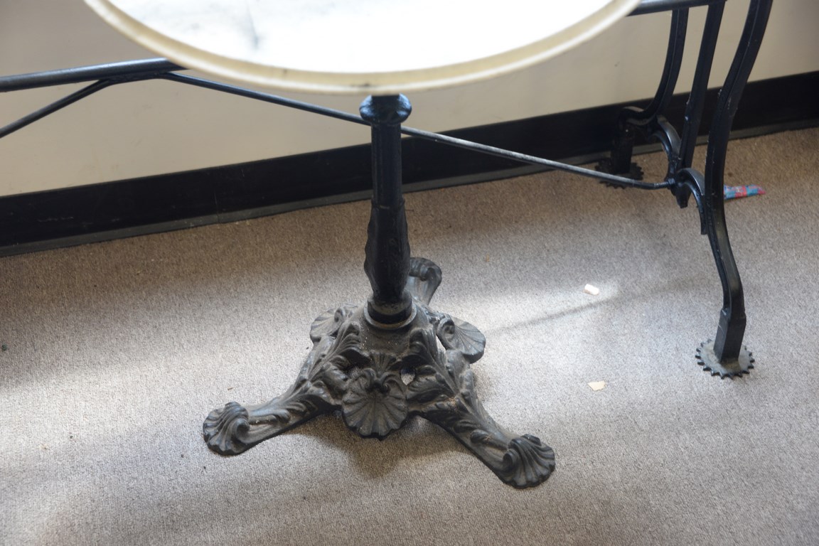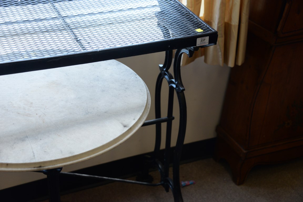 Lot 237: Three piece lot including iron outdoor serving table with mesh metal top and two small round tables. iron table: ht. 33 in. top: 18…