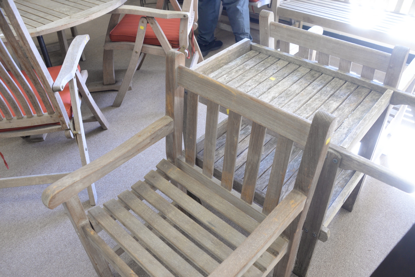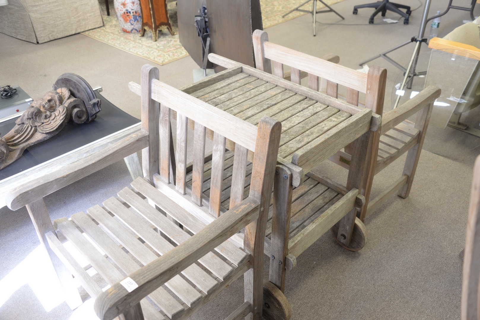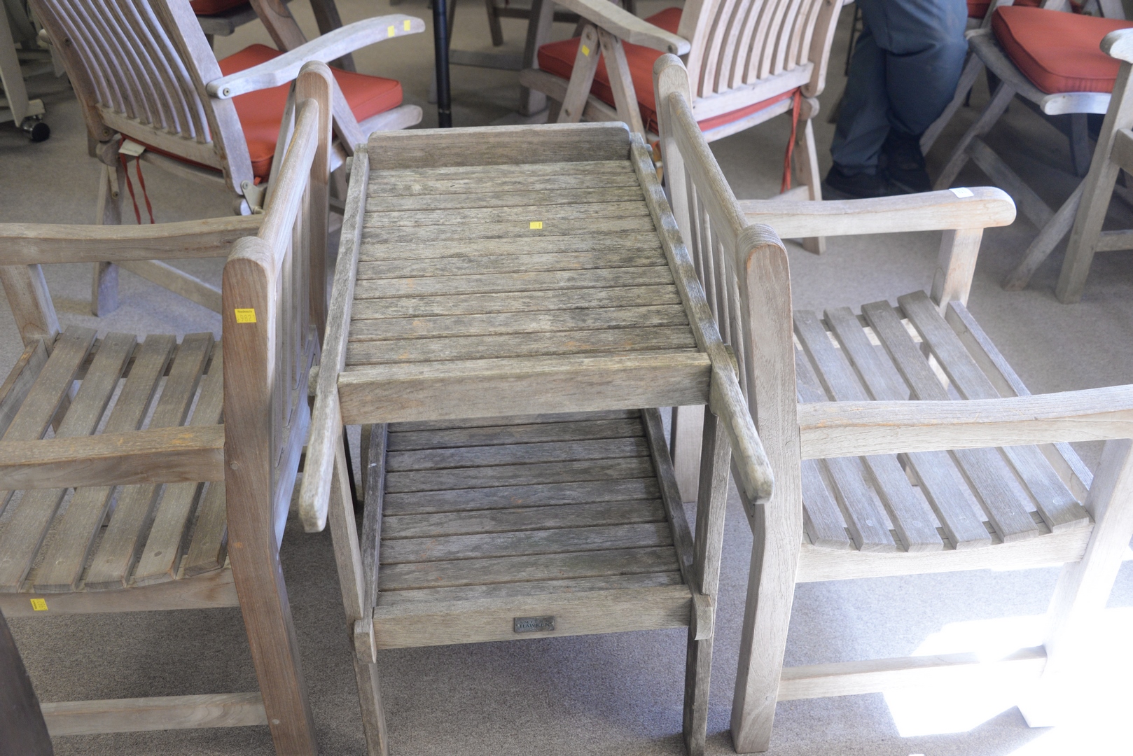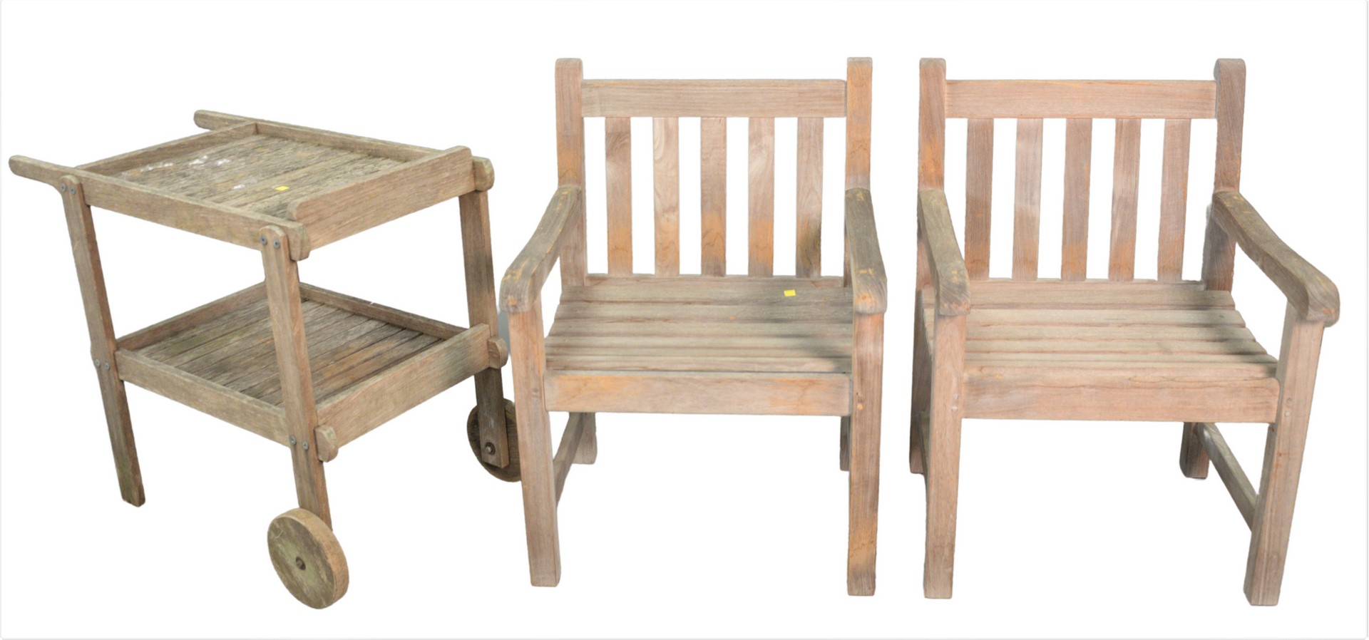 Three Piece Teak Group to include a pair of rockwood teak armchairs, along with a tea cart, width 24 inches, depth 24 inches.