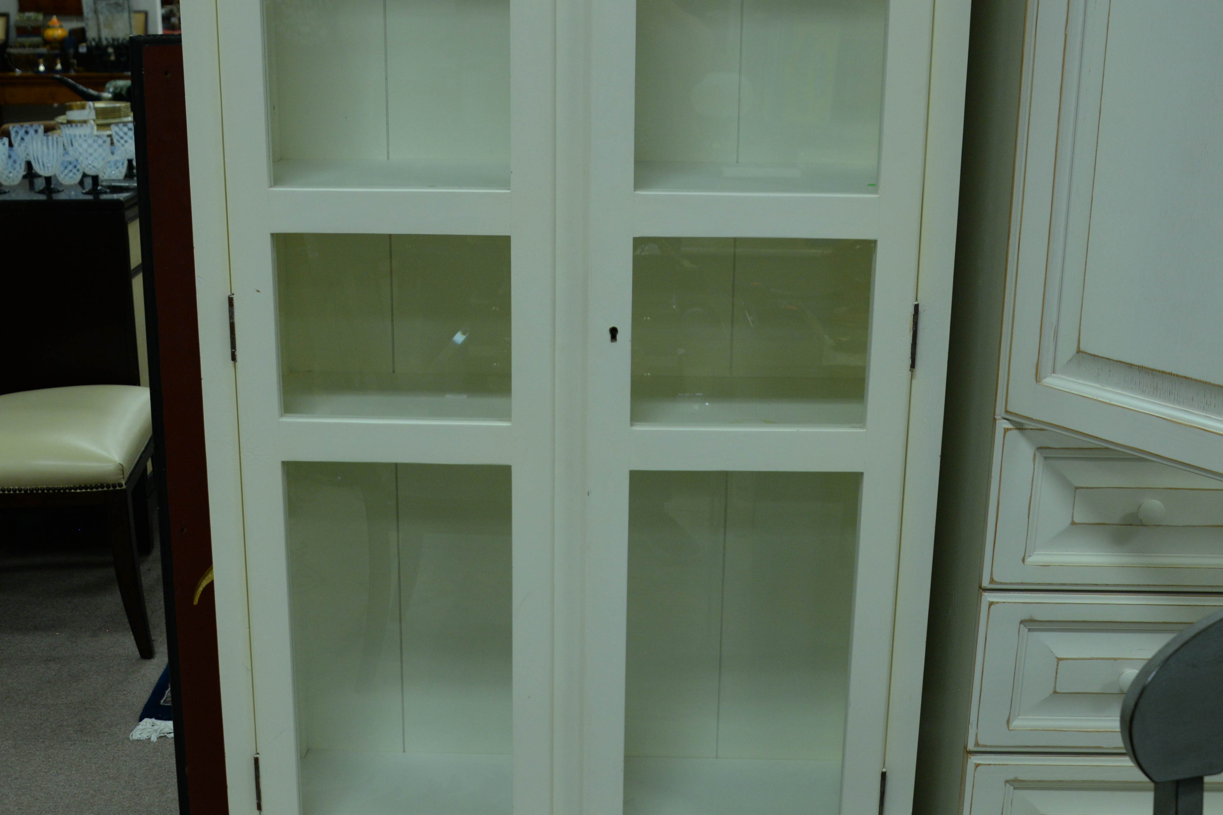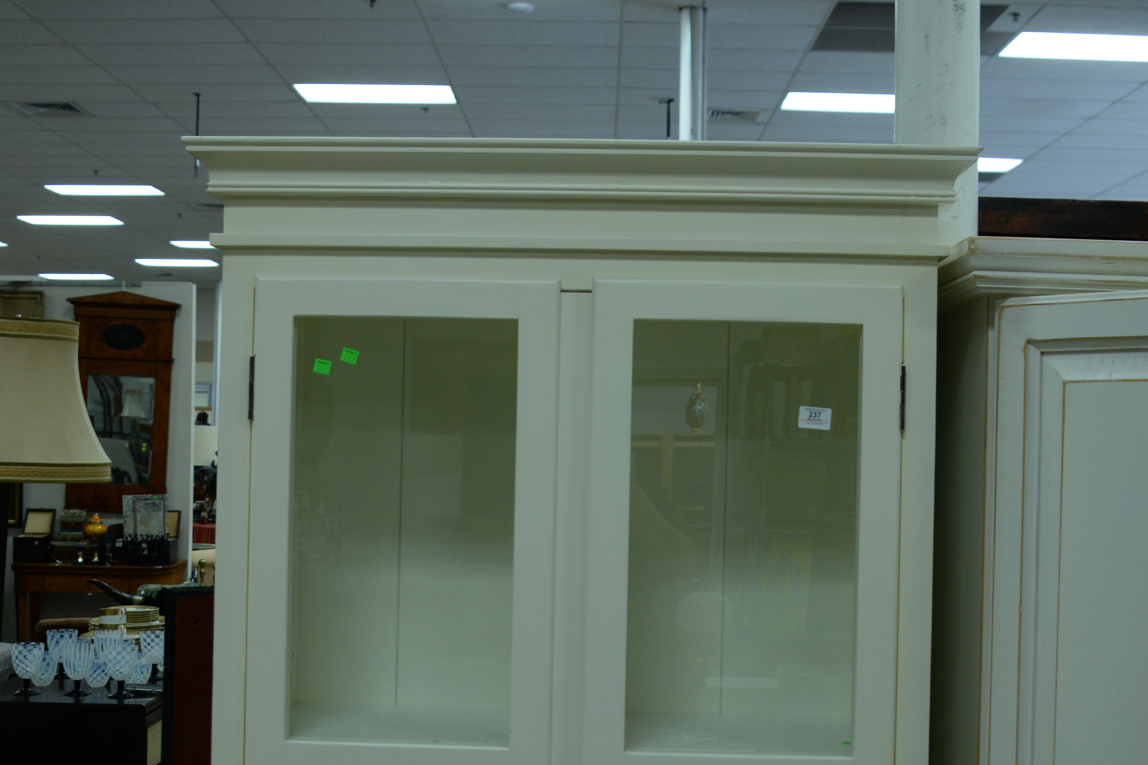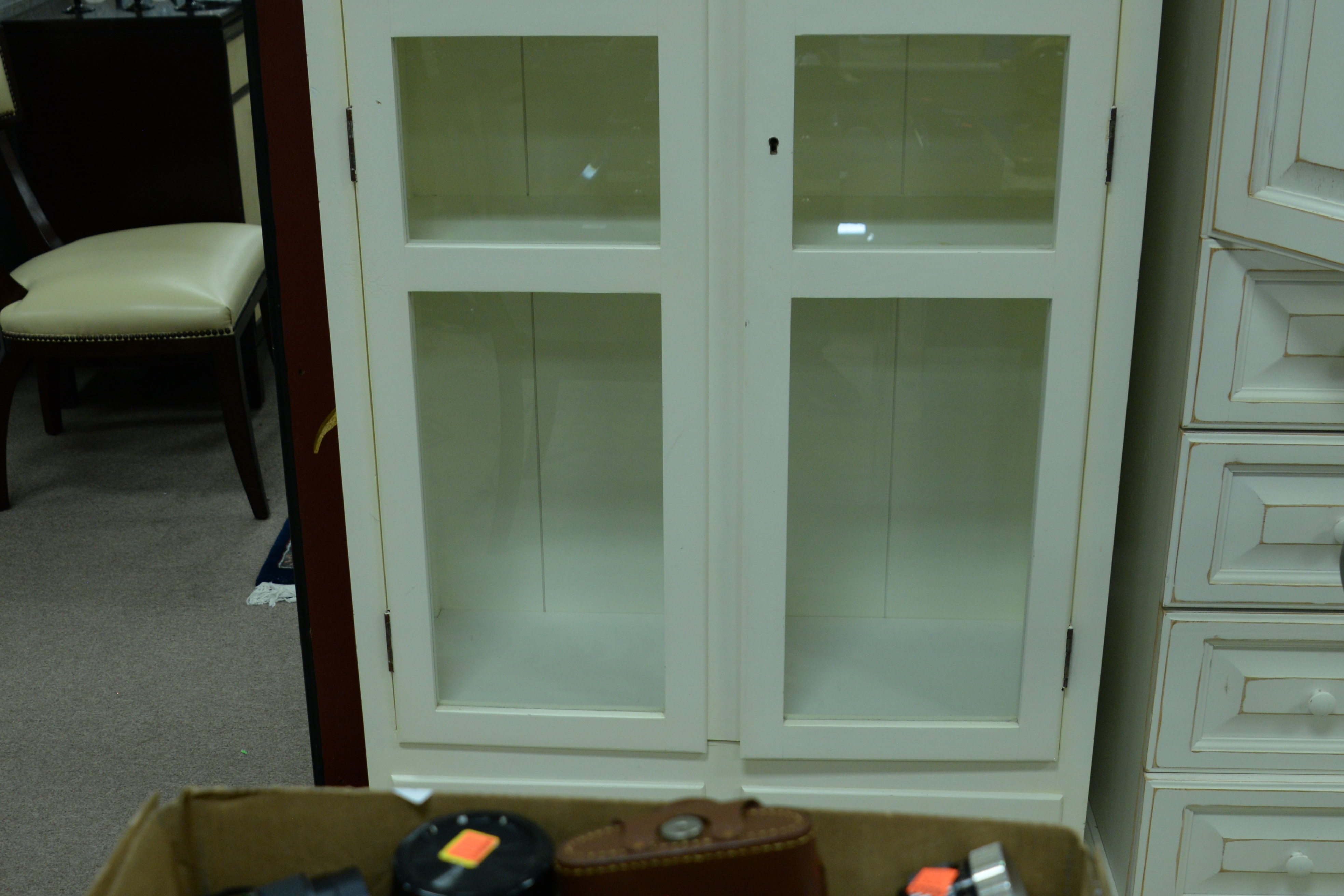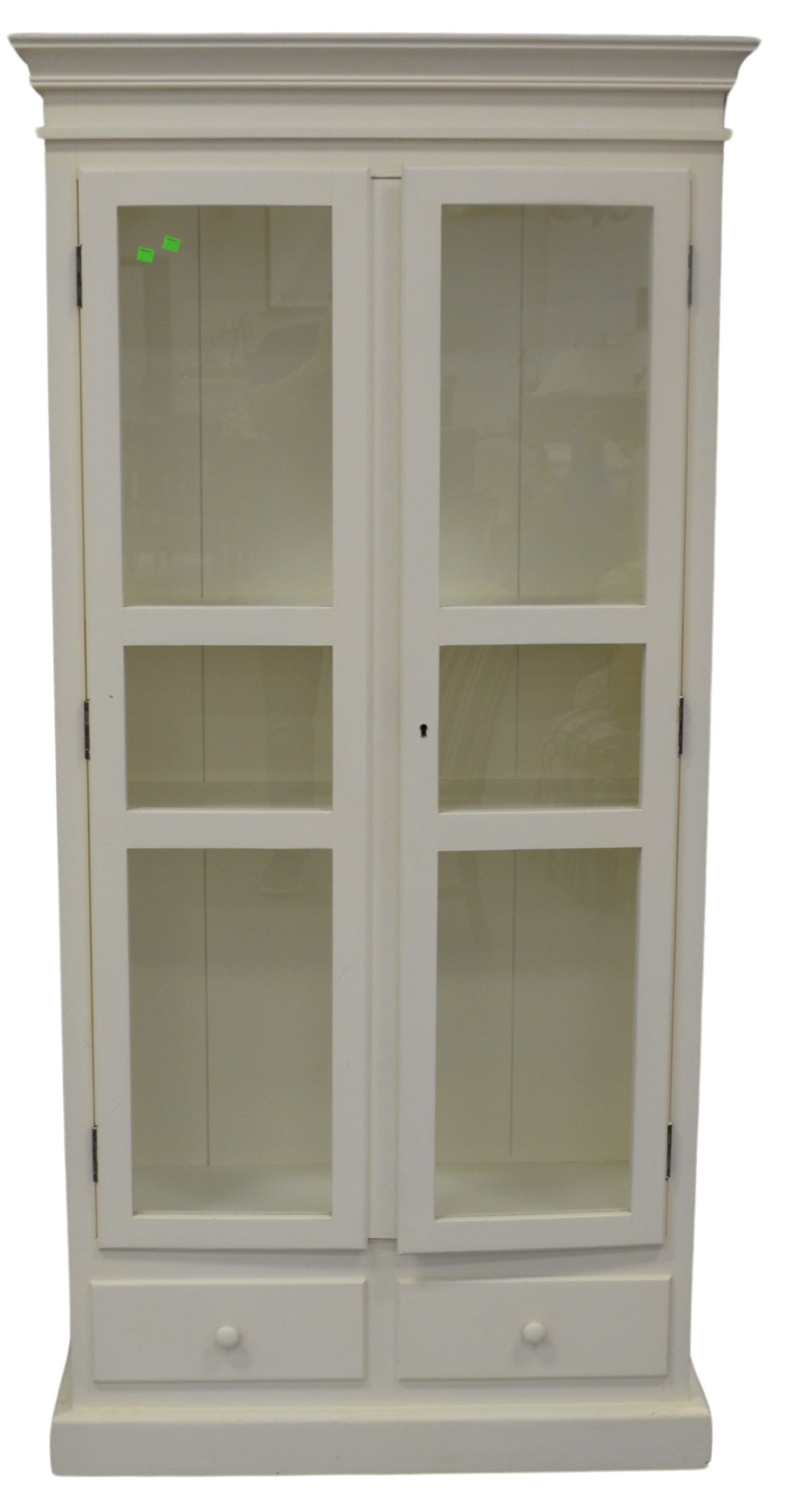 Two Door Painted Cabinet, having two glass doors opening to interior shelving over two drawers, height 72 1/2″, width 33 1/2 inches, depth 12 inches