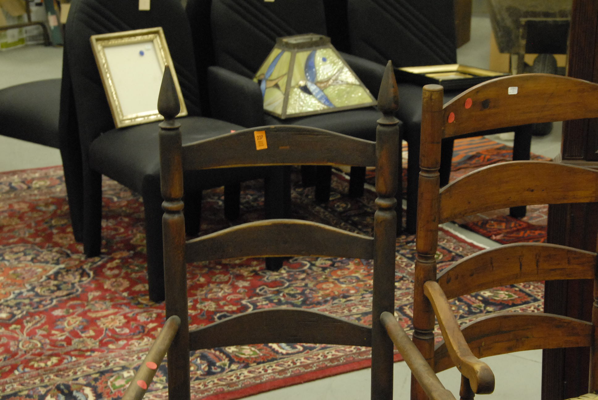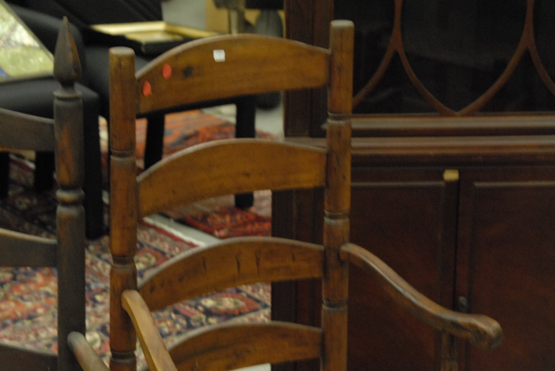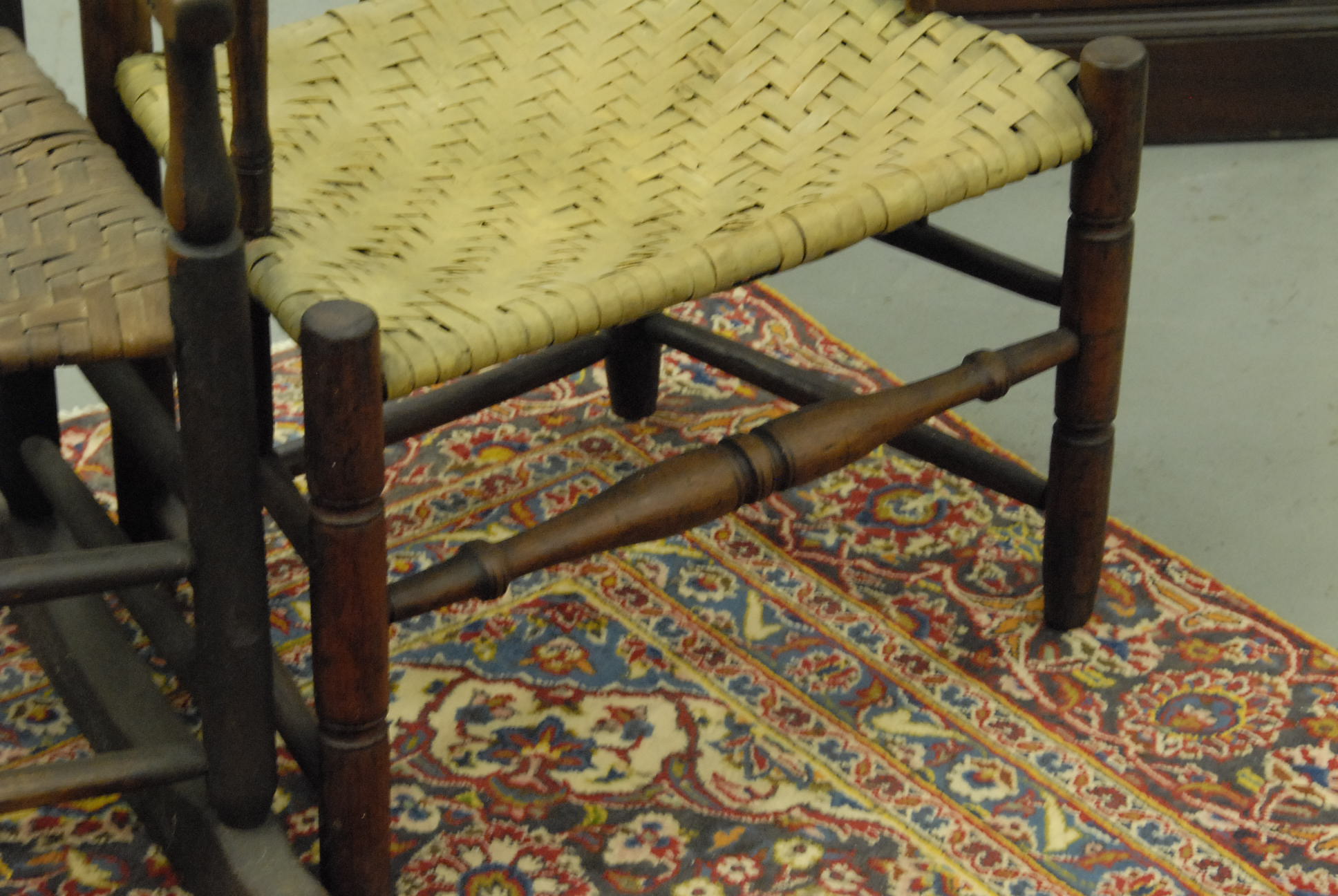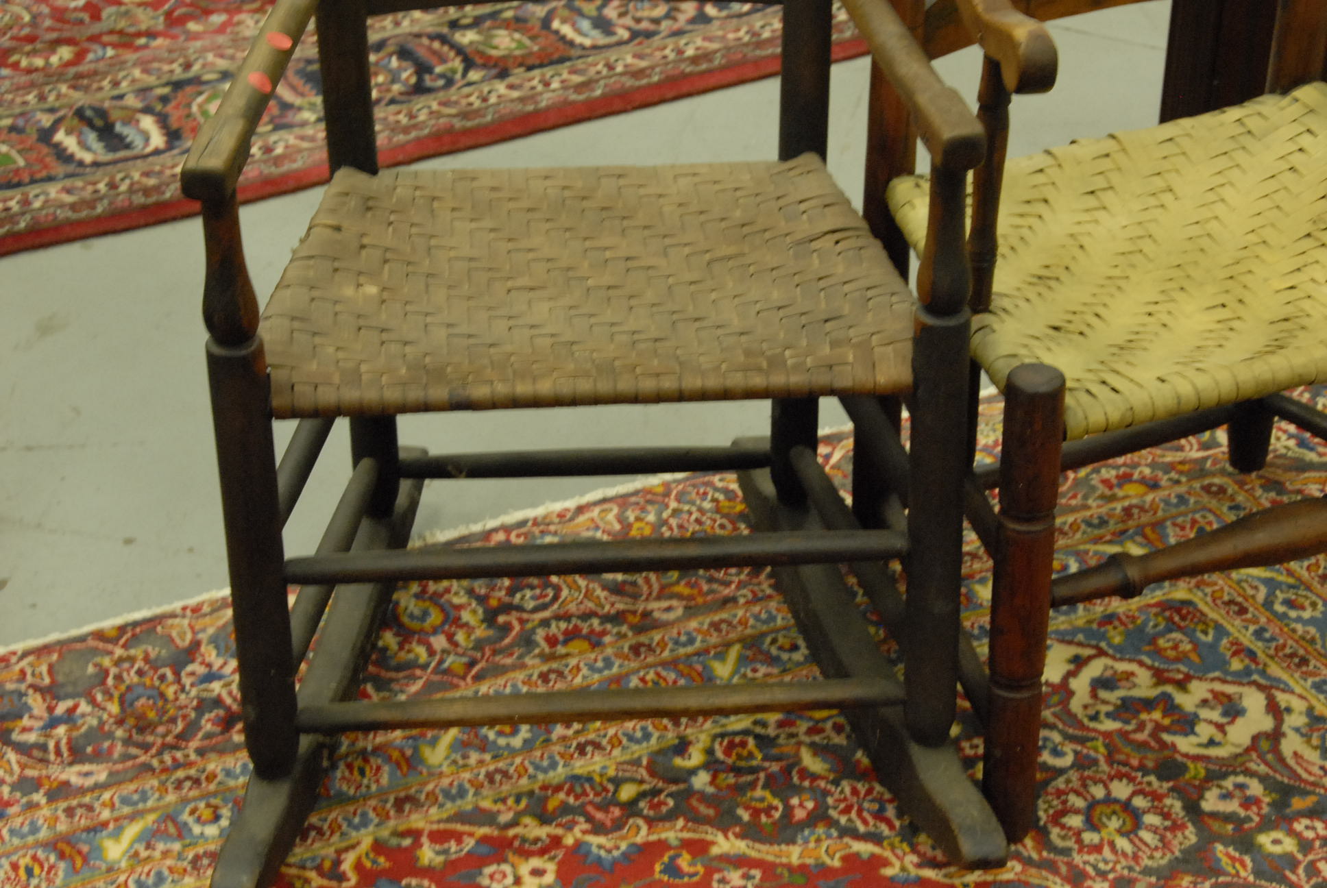 Two primitive ladder back armchairs, one with rockers added to benefit the War Office on Lebanon Green, CT SAR