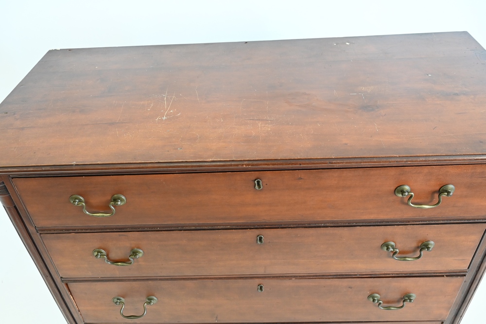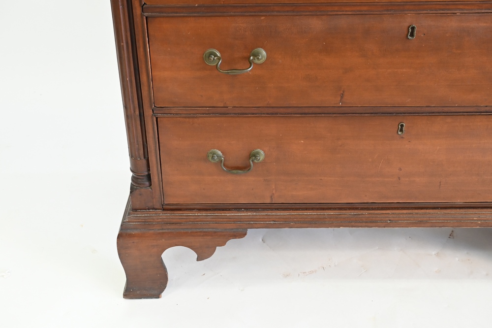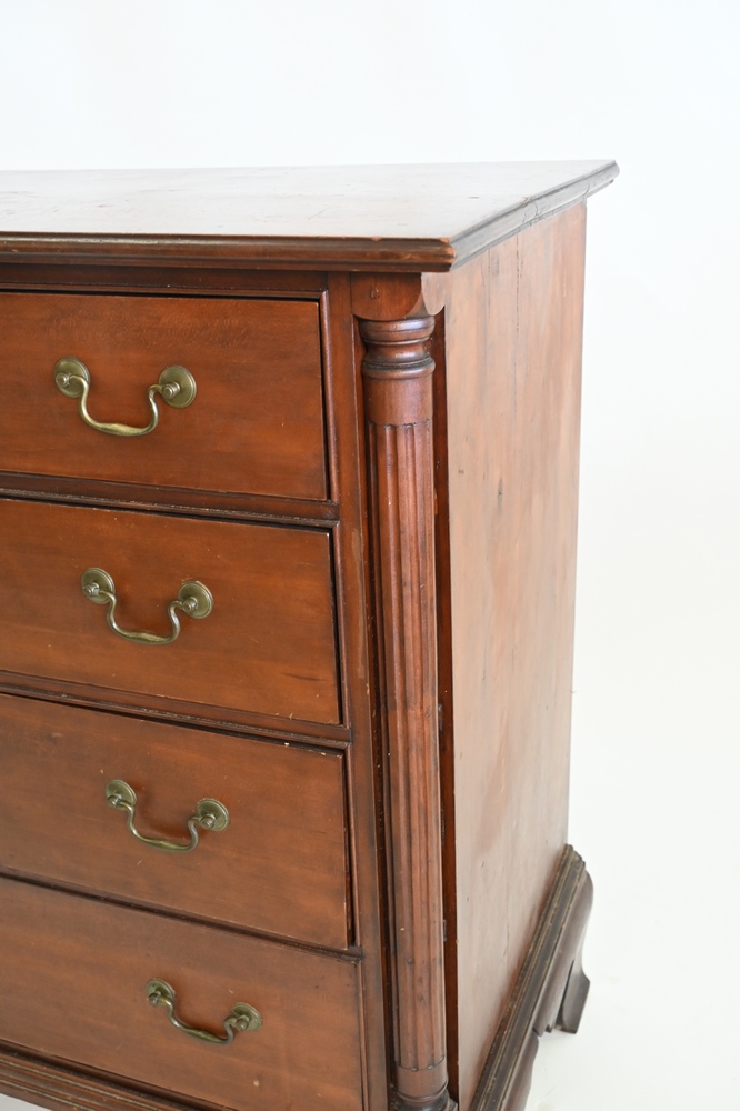 having molded top over four graduated drawers flanked by columns, all set on ogee feet with quadrant base, original brasses, in old finish