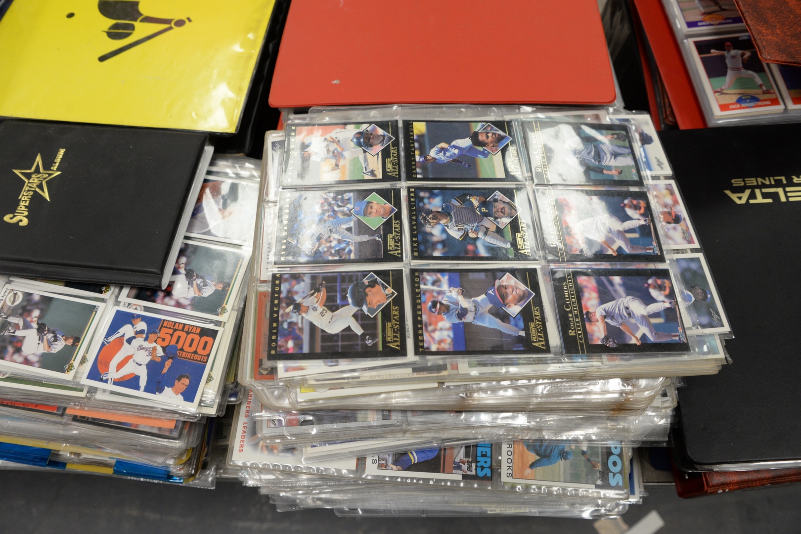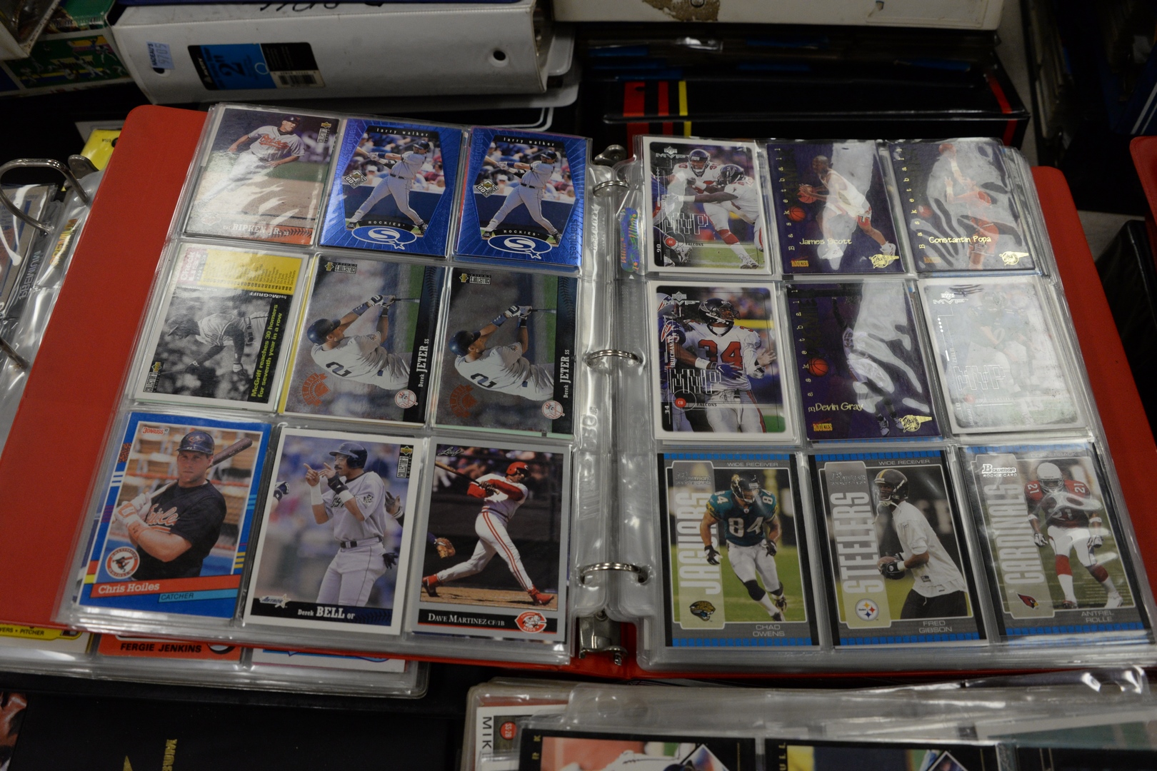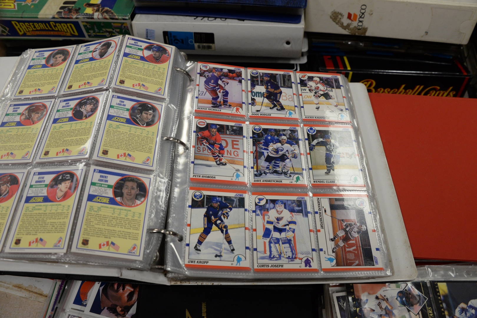 Approximately twenty-eight loose leaf binders of sports cards, to include baseball, football, hockey along with approximately 100 pages not in binders.