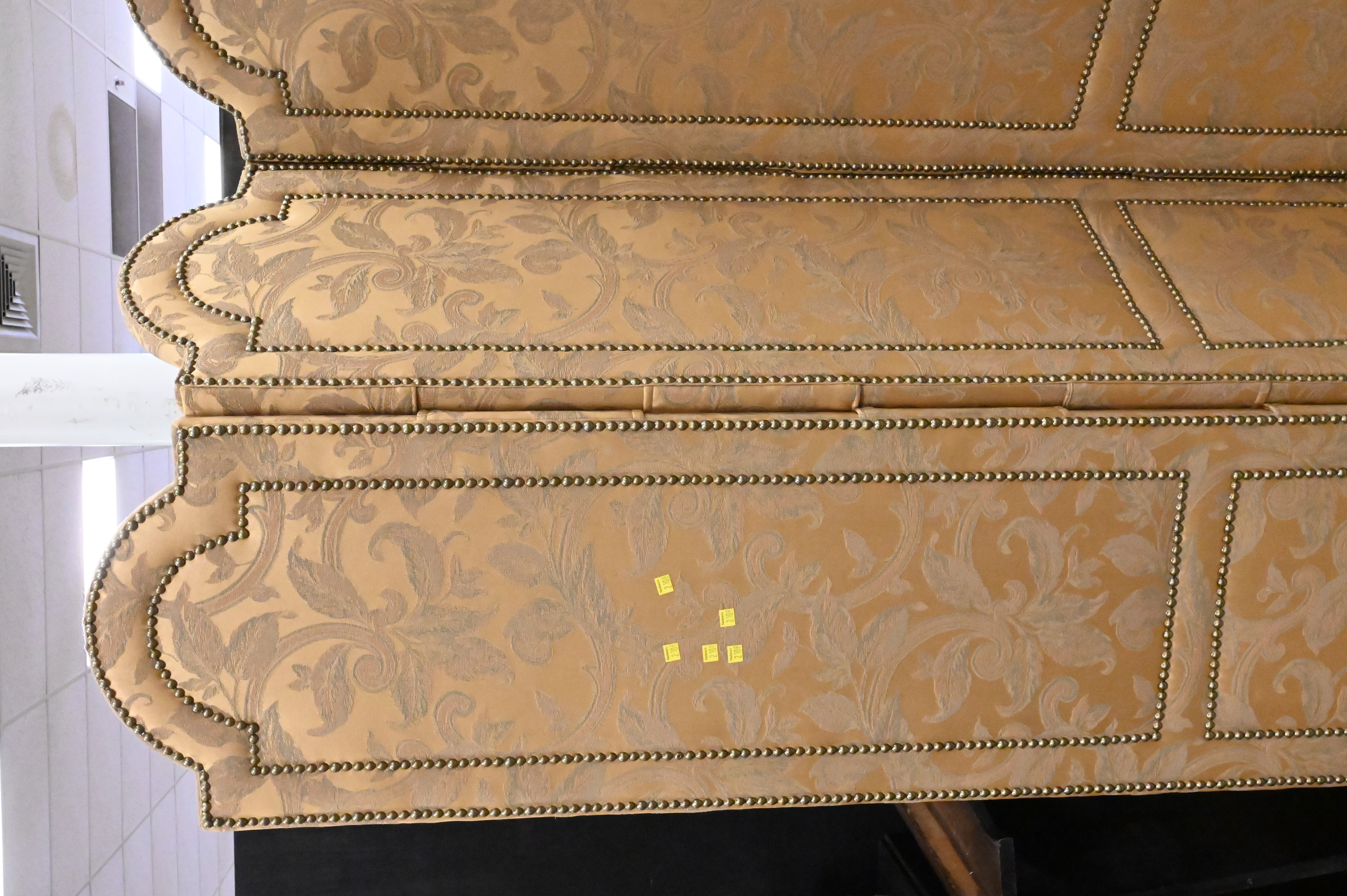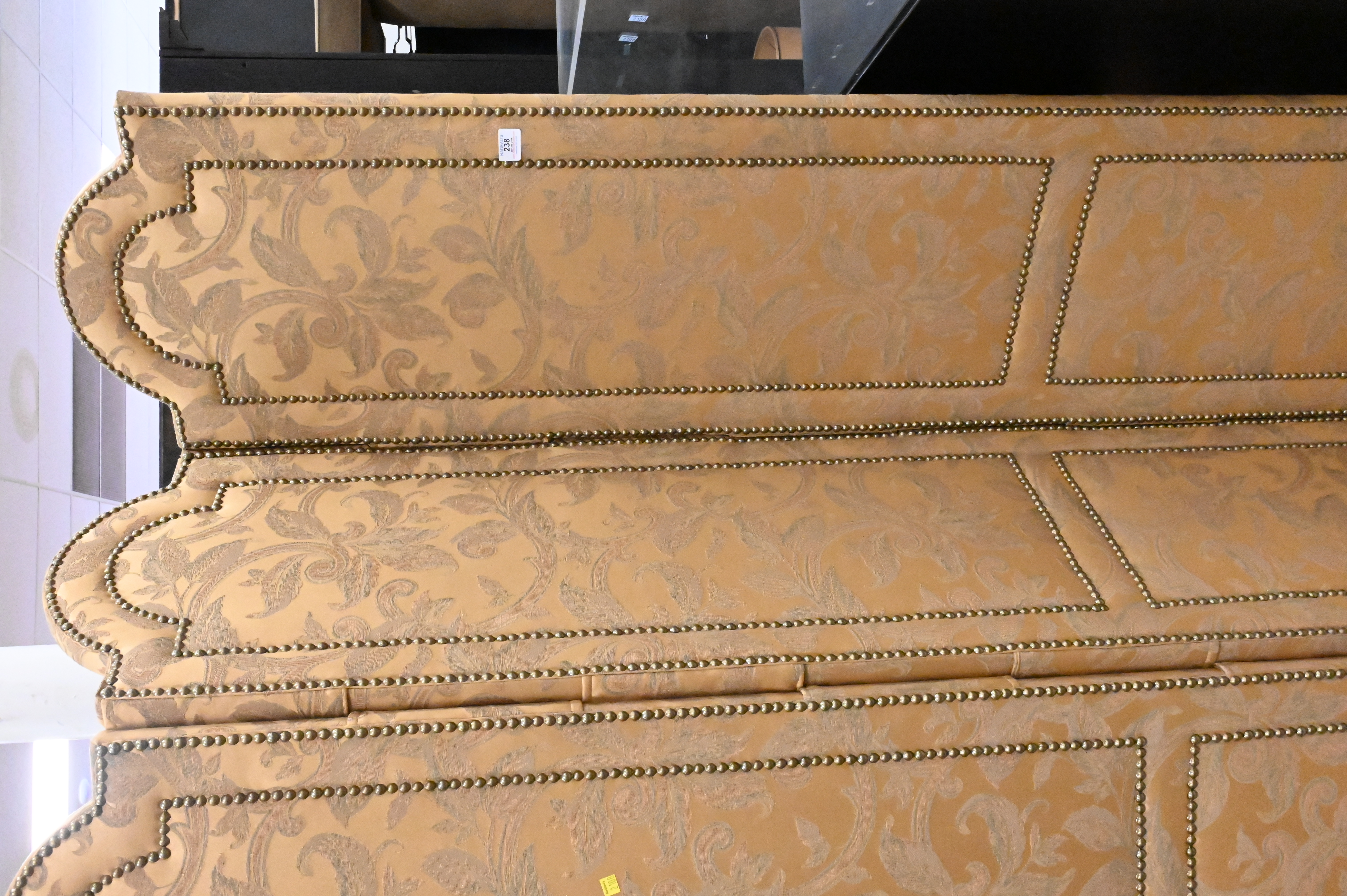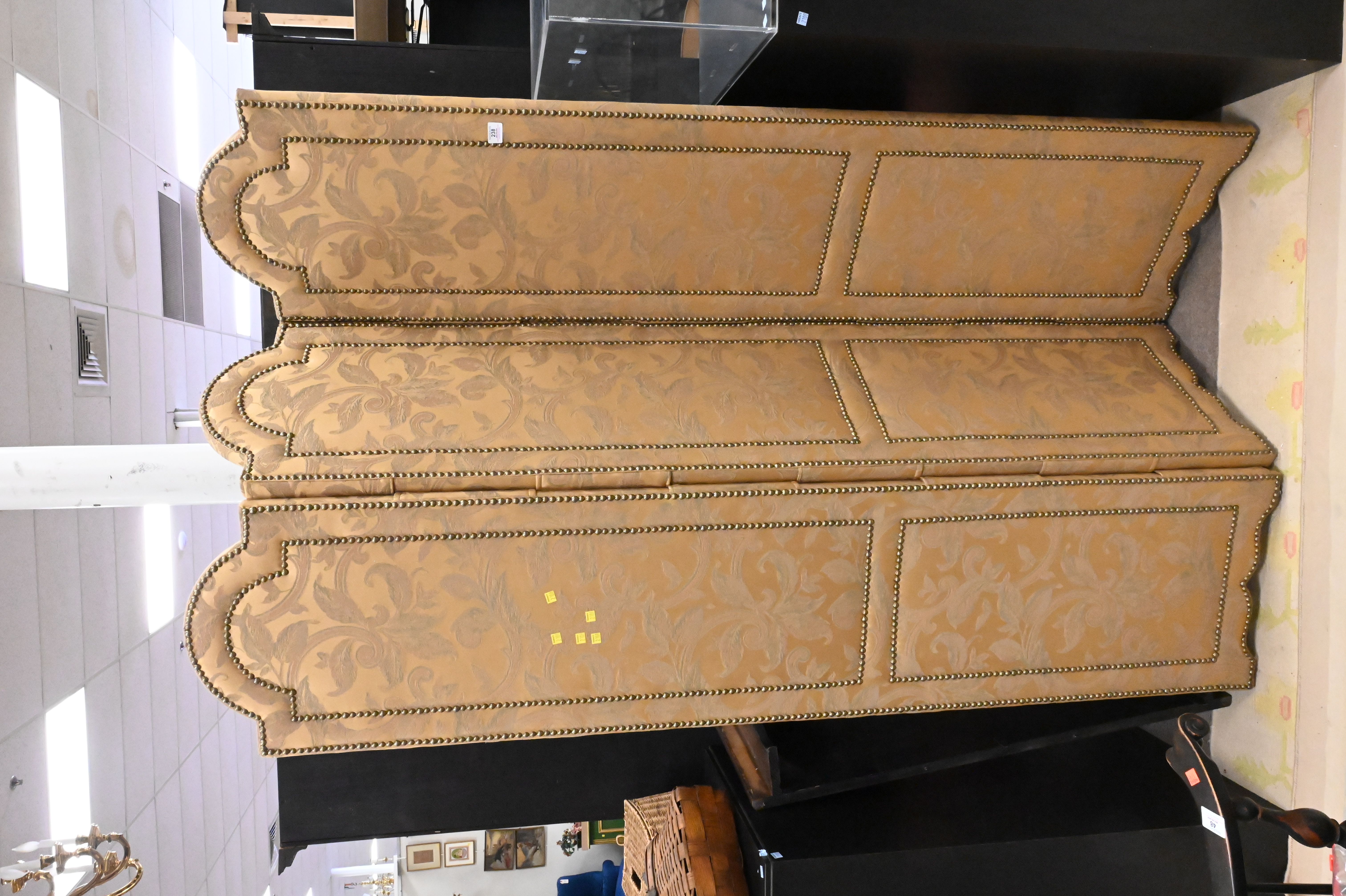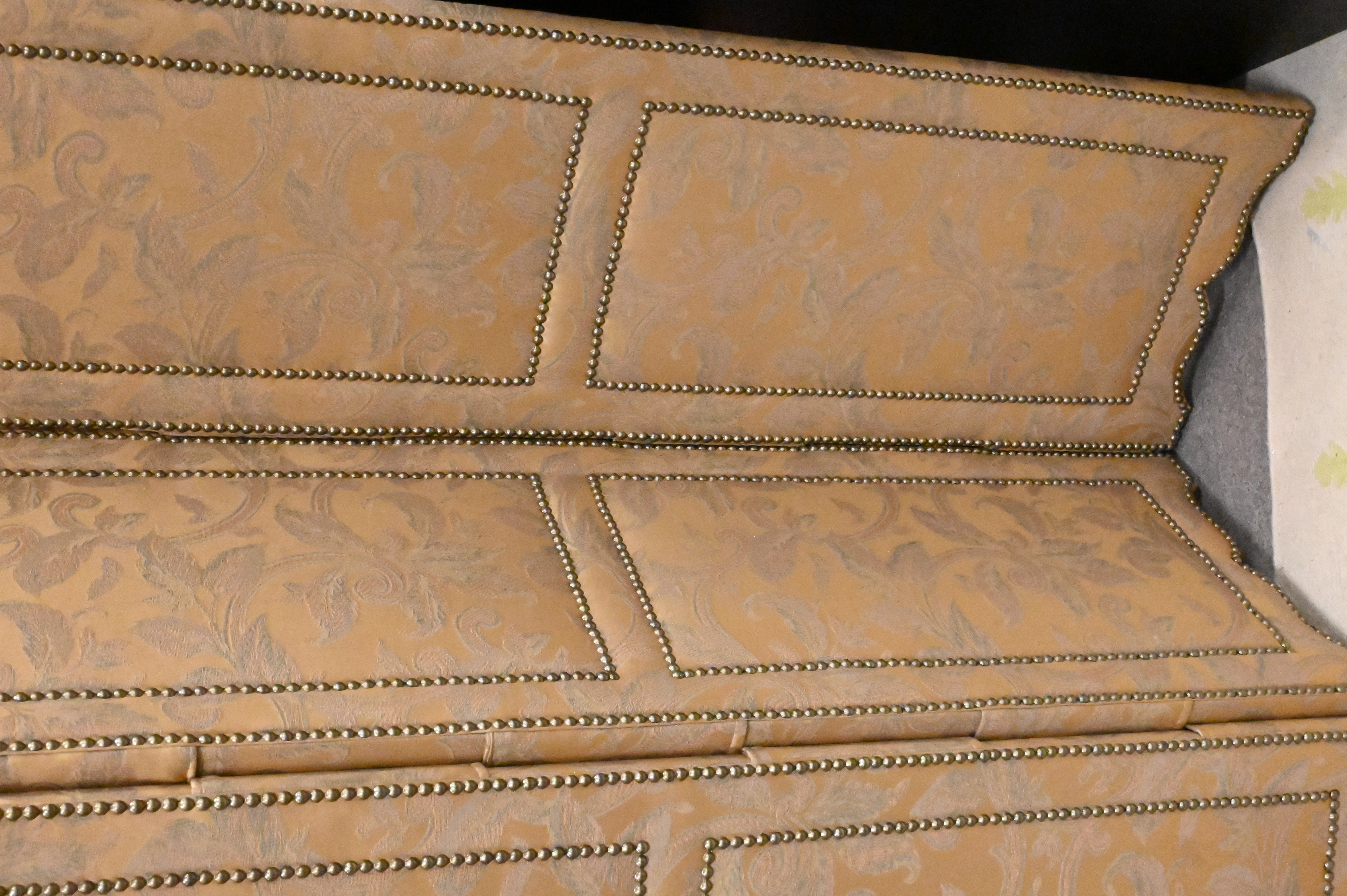 Baroque Style Brass Tacked Floral Damask 3 Panel Dressing Screen, height 81 inches, width 54 inches.