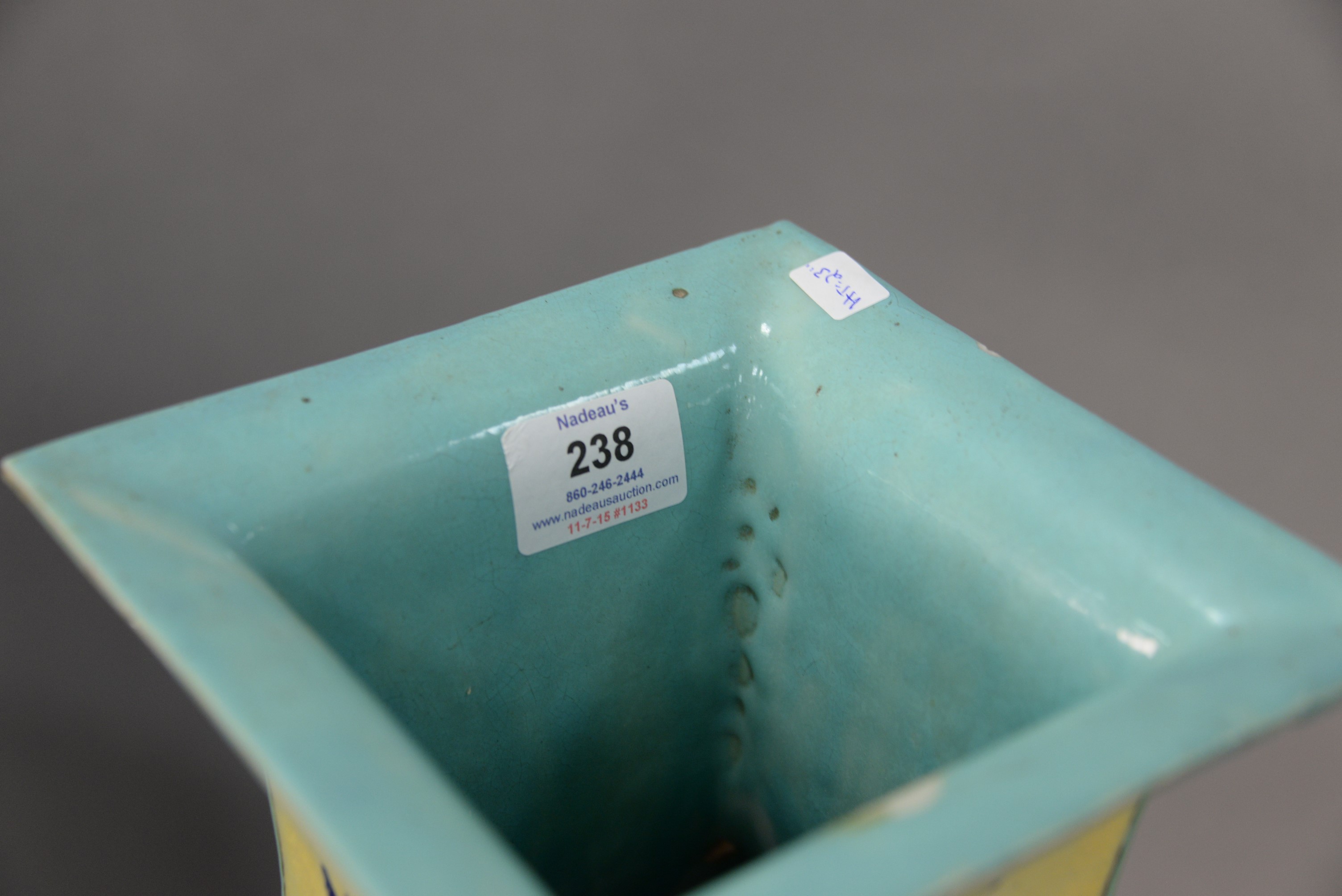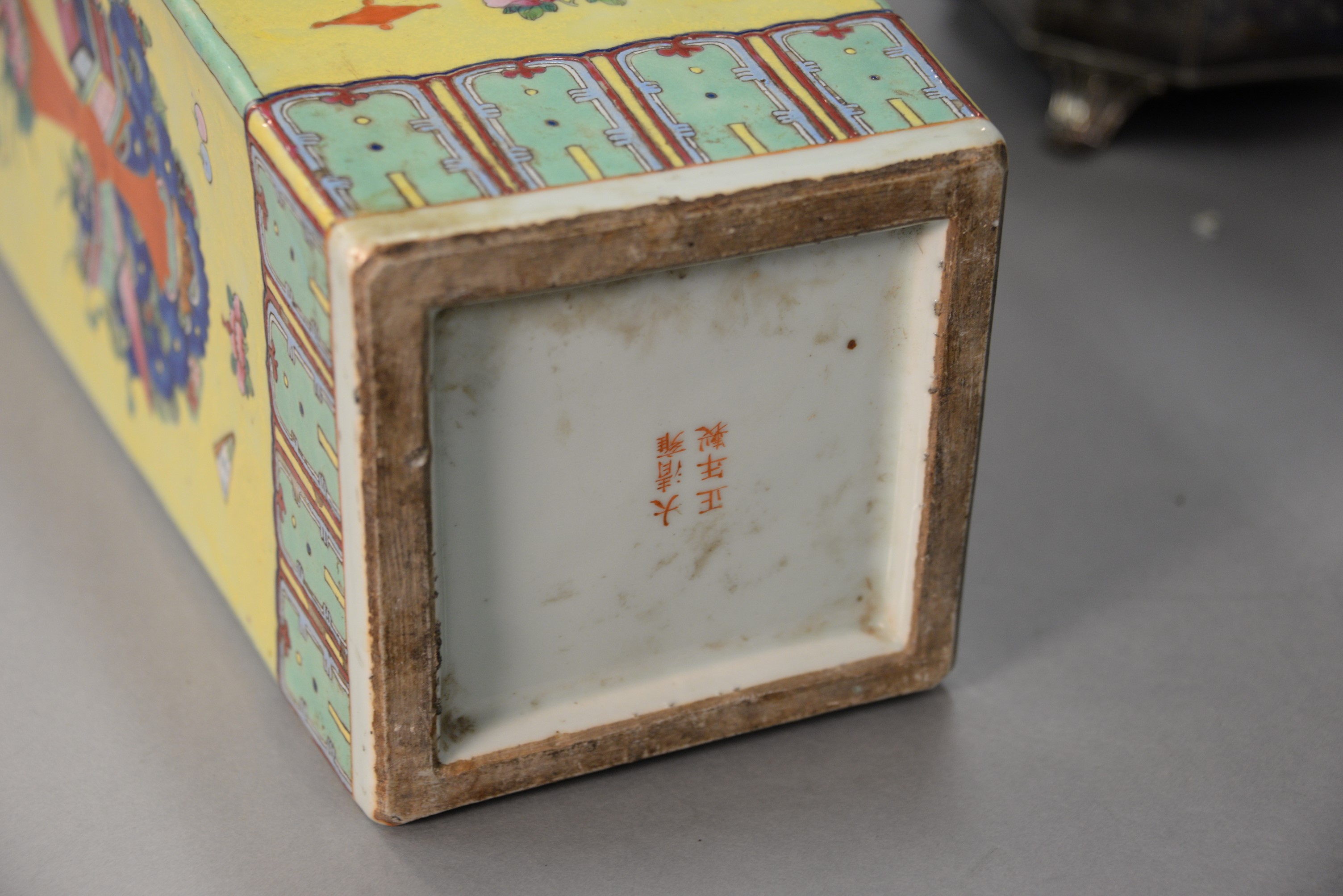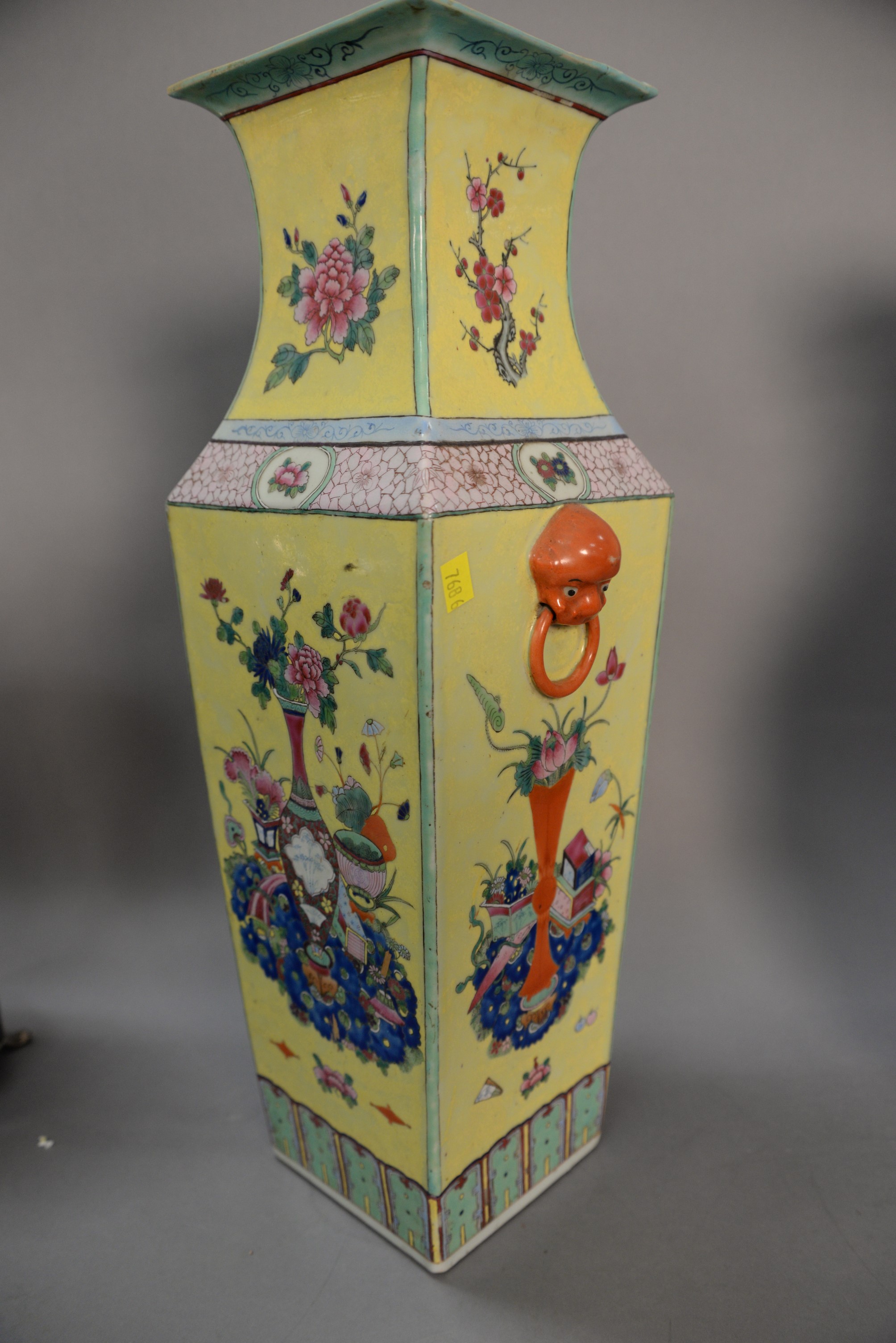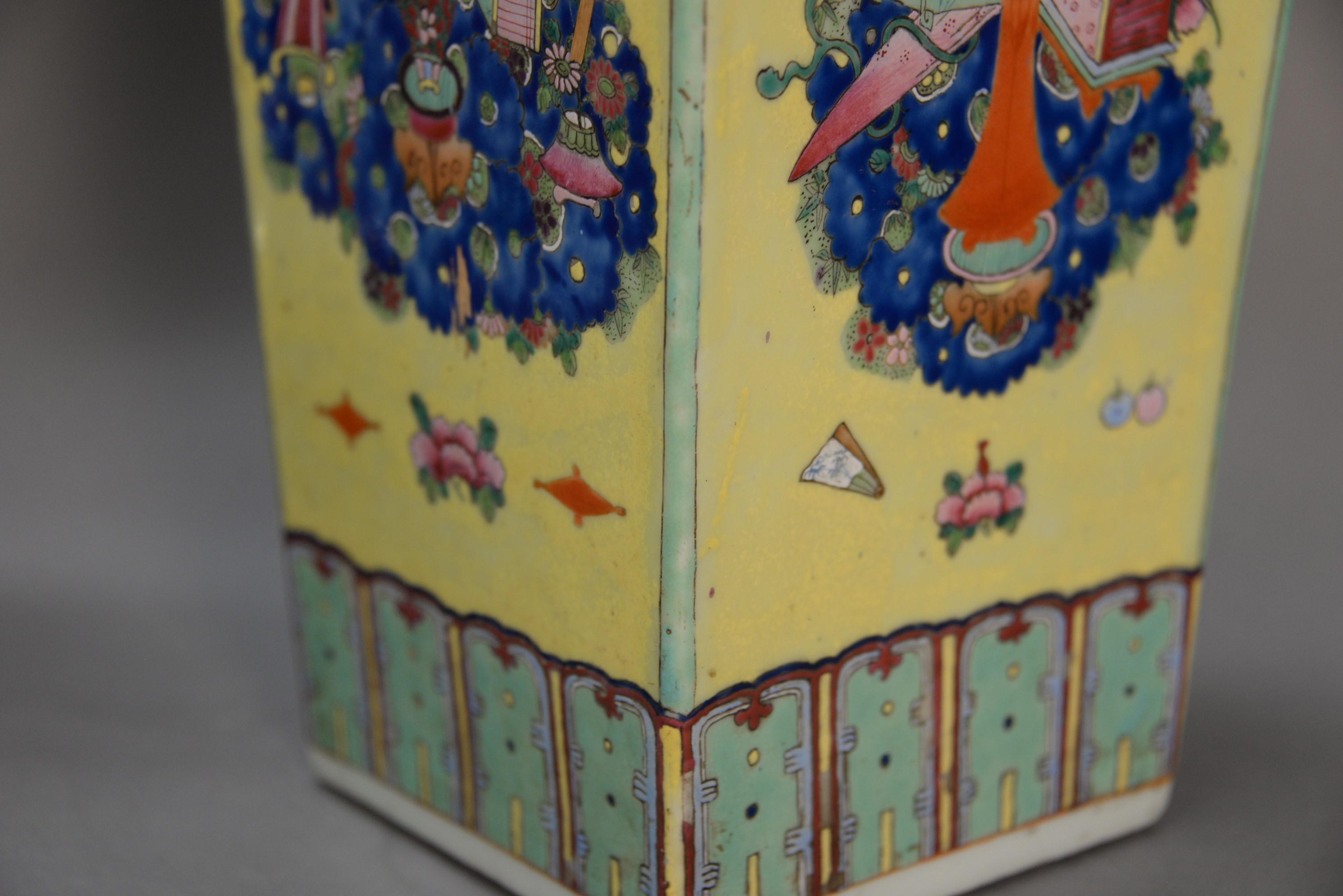 Lot 238: Famille Jaune porcelain vase, square body rising to square flared rim, painted with vases of wild flowers and artifacts, six charact…