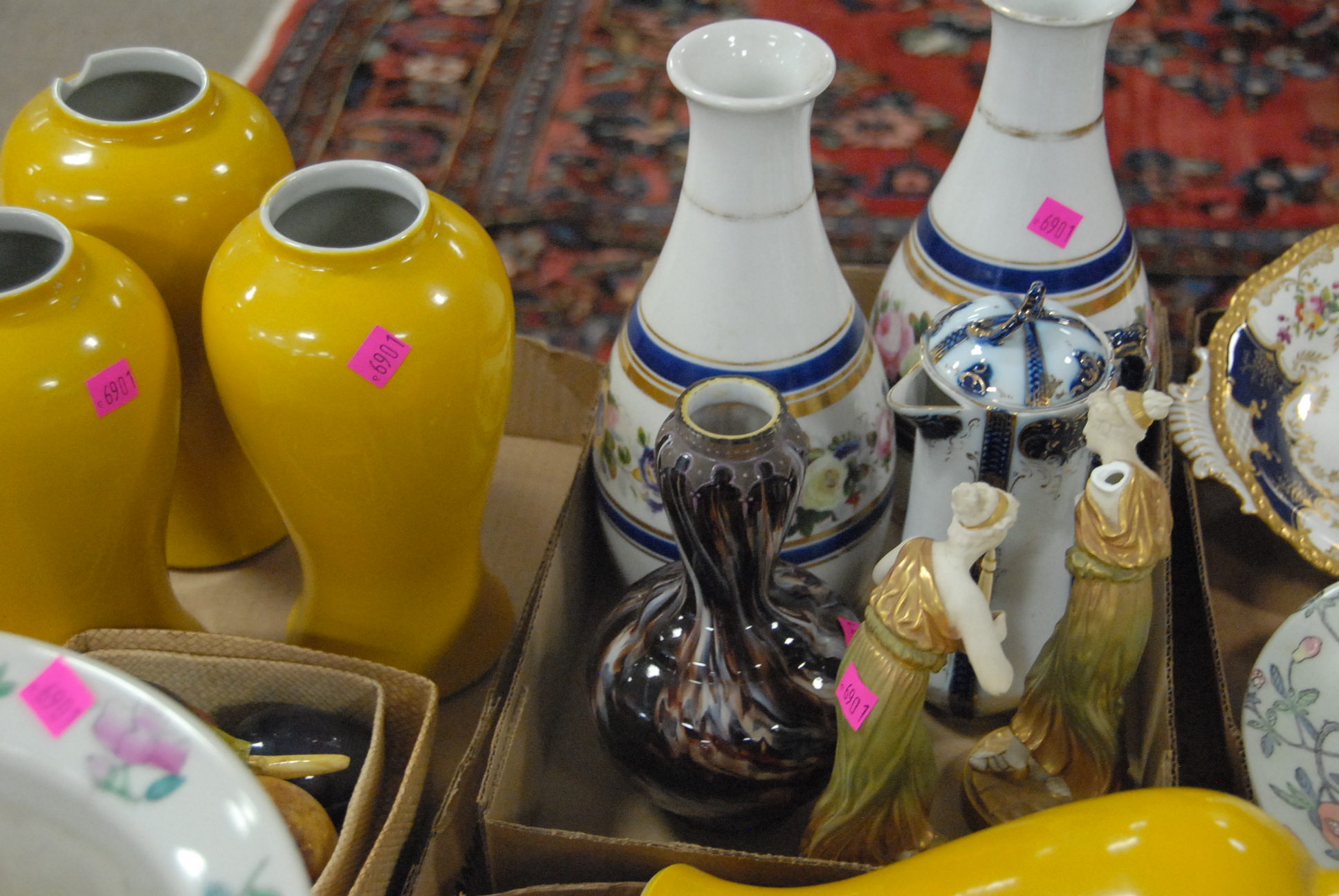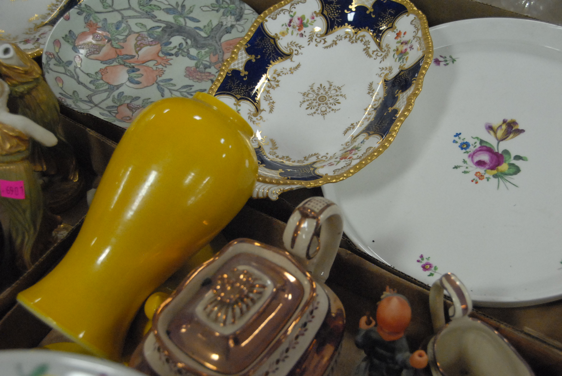 Five box lots to include four Chinese style vases, Hummel, copper luster, two Royal Worcester figures one as is, pair of porcelain vases, Royal Vienna tea pot and small dish, etc.