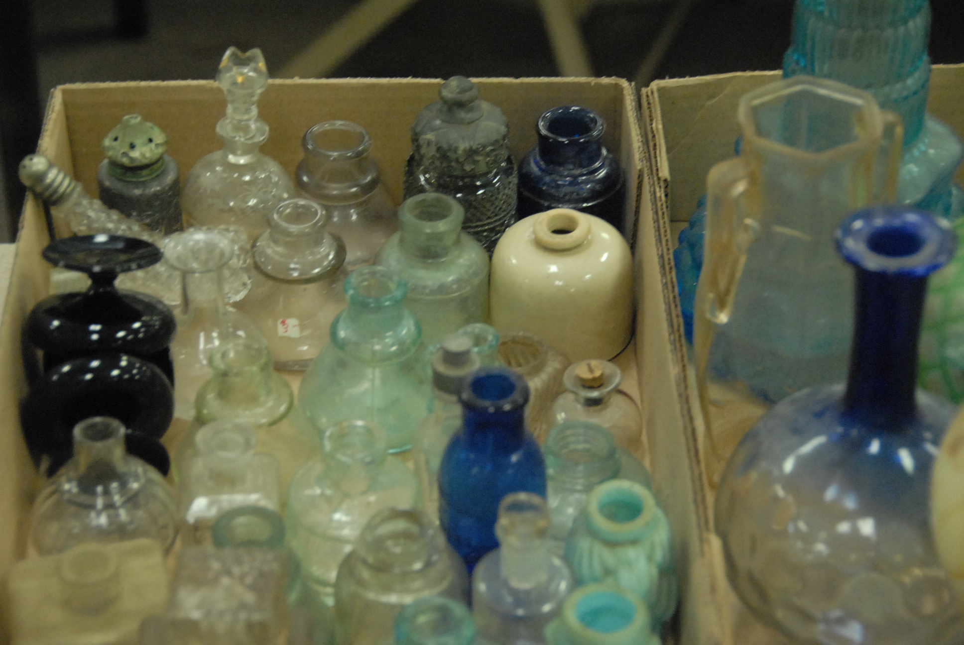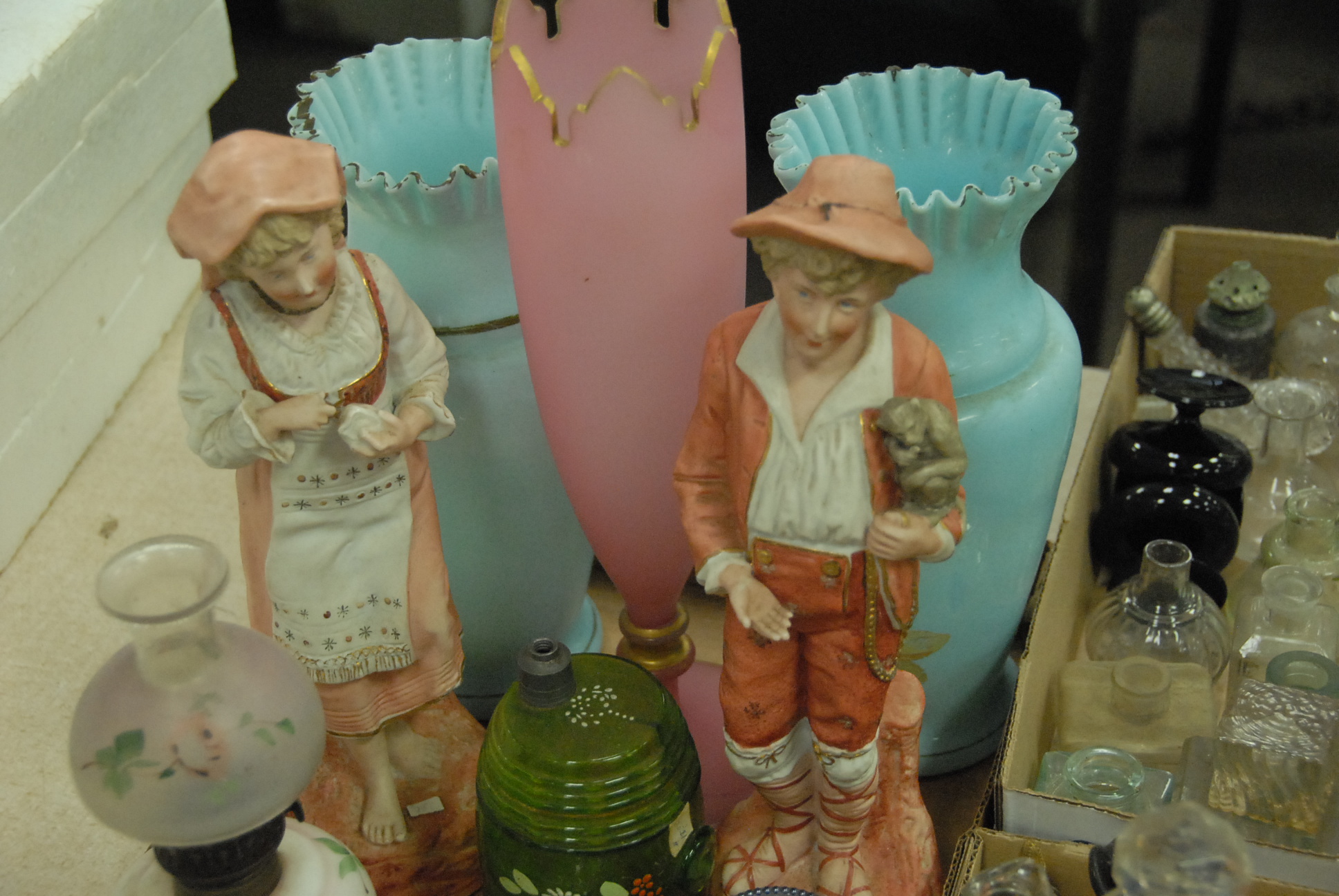 Five boxes to include two Swarovski pigs, inkwells, salt and peppers, Bristol glass vases, art glass vases, decanters, pair of bisque figures, etc.