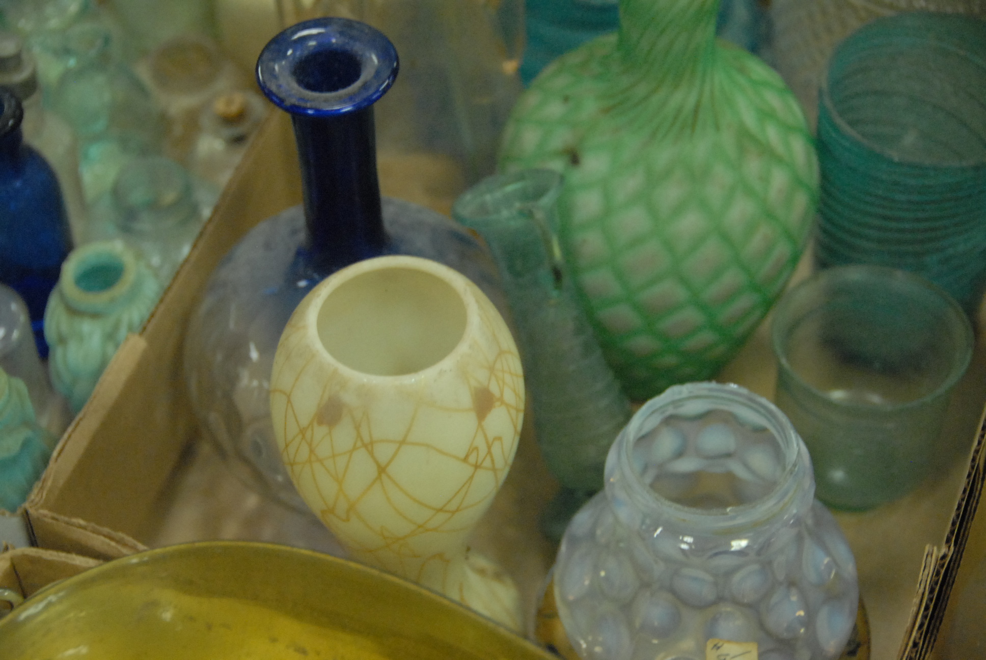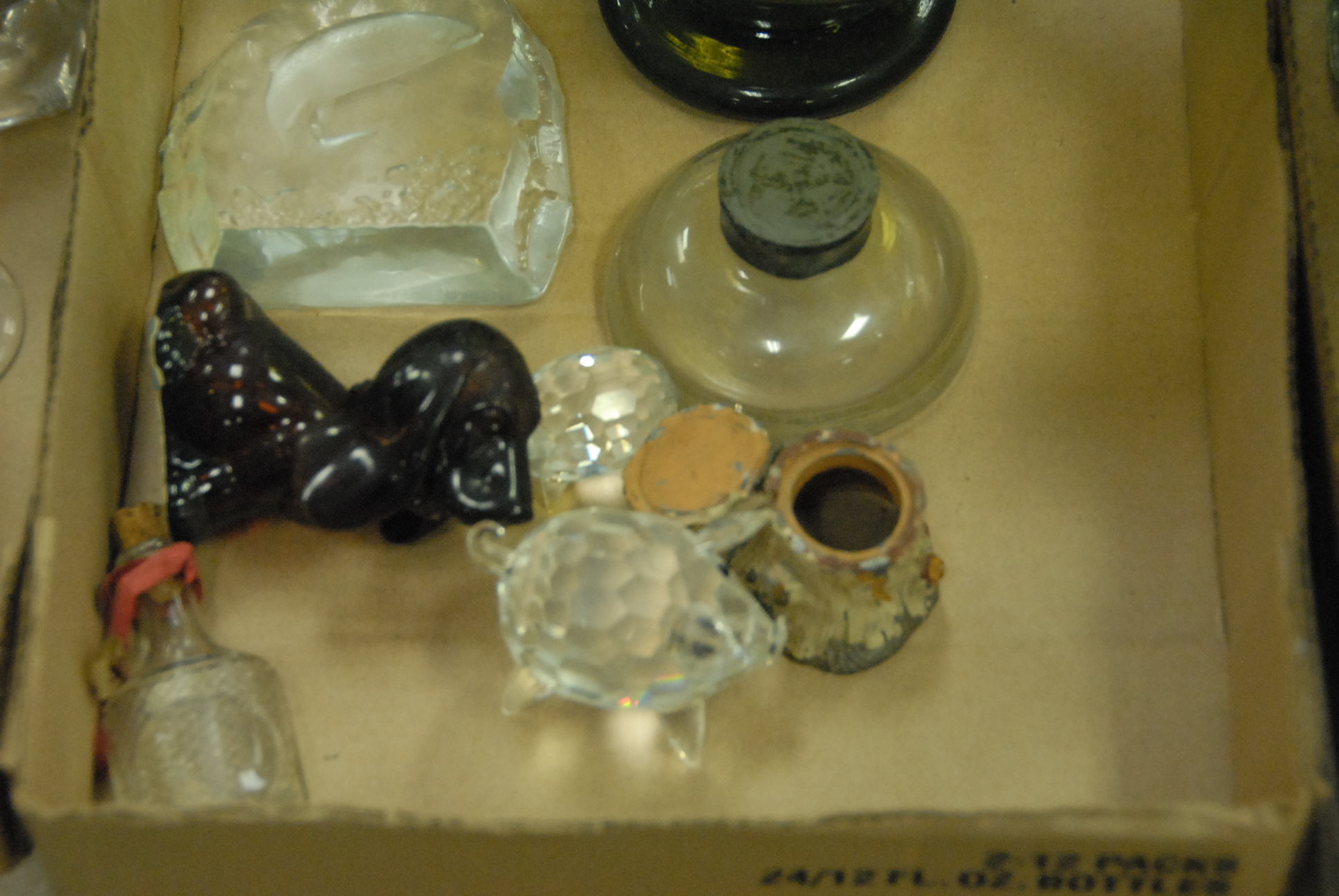Lot 238: Five boxes to include two Swarovski pigs, inkwells, salt and peppers, Bristol glass vases, art glass vases, decanters, pair of bisqu…