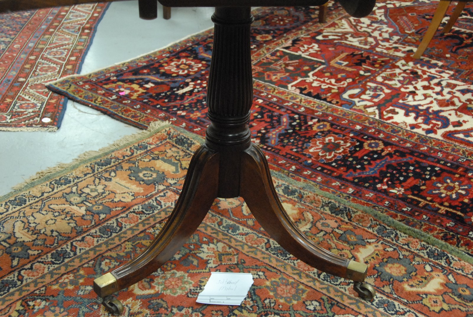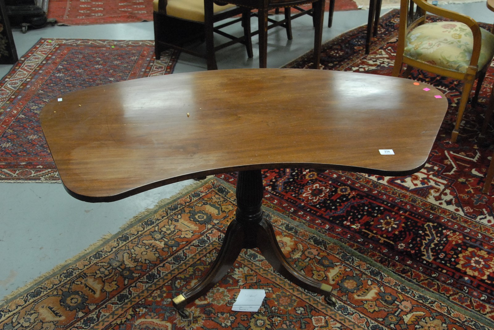 Lot 238: George IV mahogany table with kidney shaped tip top on single pedestal base ending in three downswept members, 19th century. ht. 29 in. top: 24 x 51
