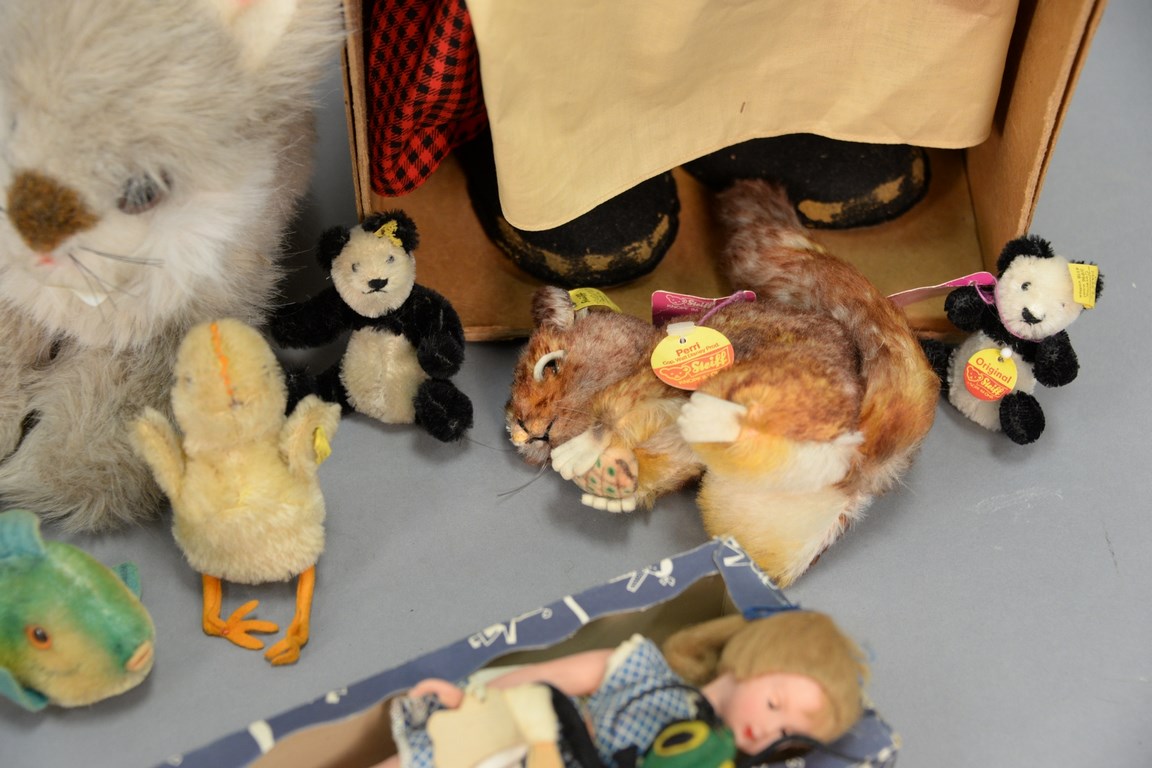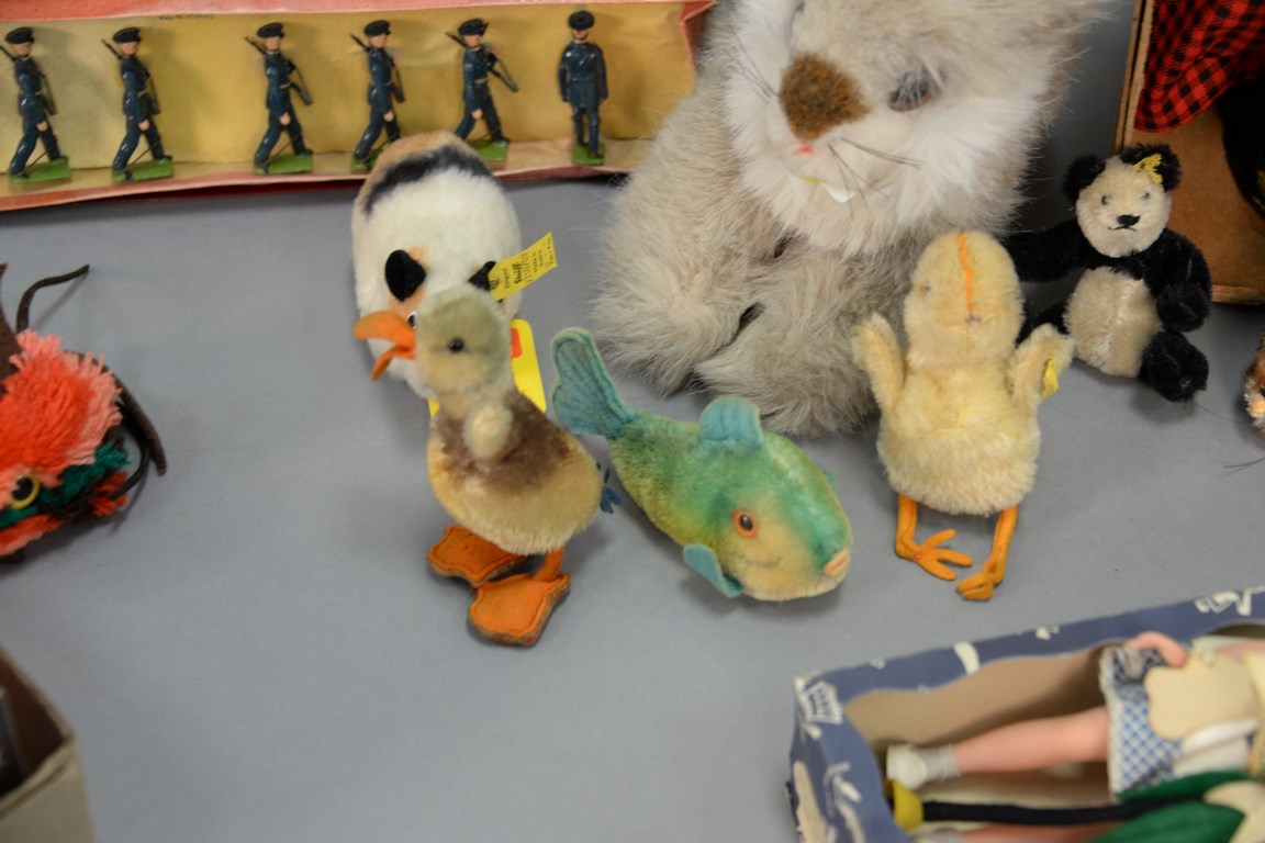 Group lot to include two ducks, two fish, swinny, large rabbit Perri, two miniature panda bears, Britain Lead Soldiers in a box, books, and large Steiff Micki. Steiff: ht. 19 1/2 in.