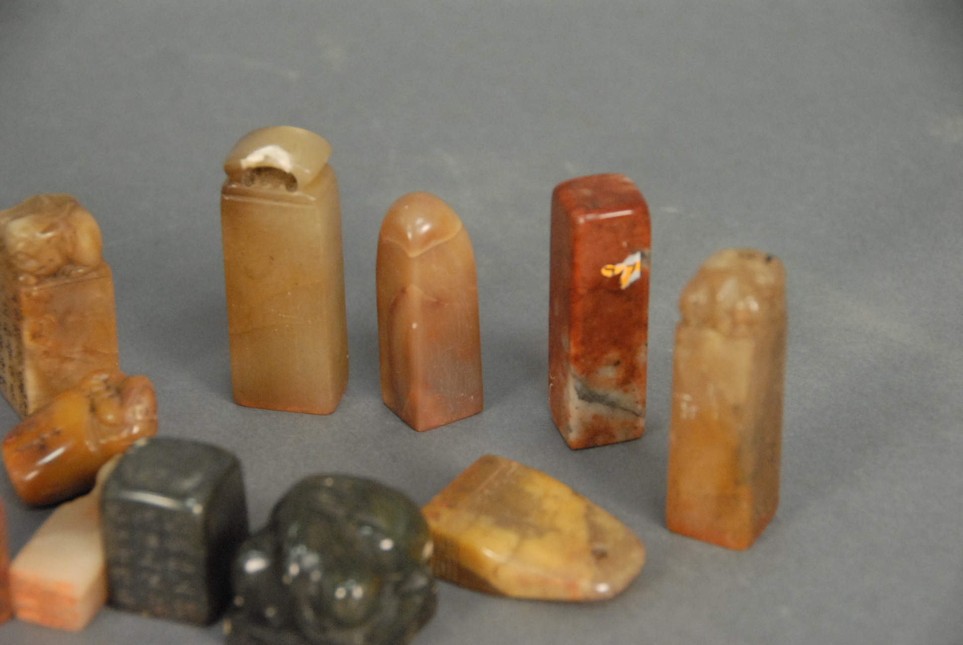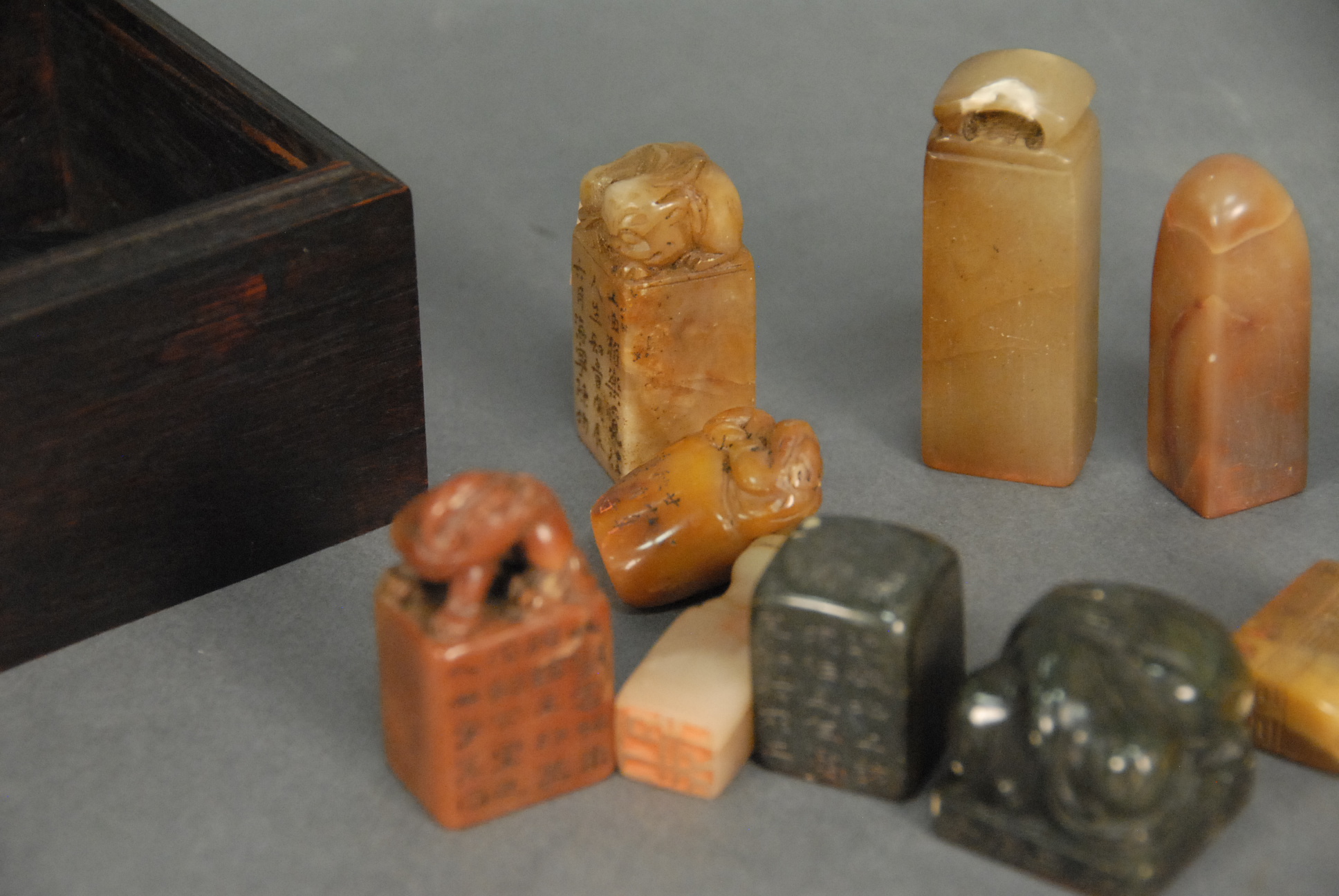 Lot 238: Hardwood box with twelve hard stone seals, some with carved foo dogs on top, 1in. – 2 1/4in.