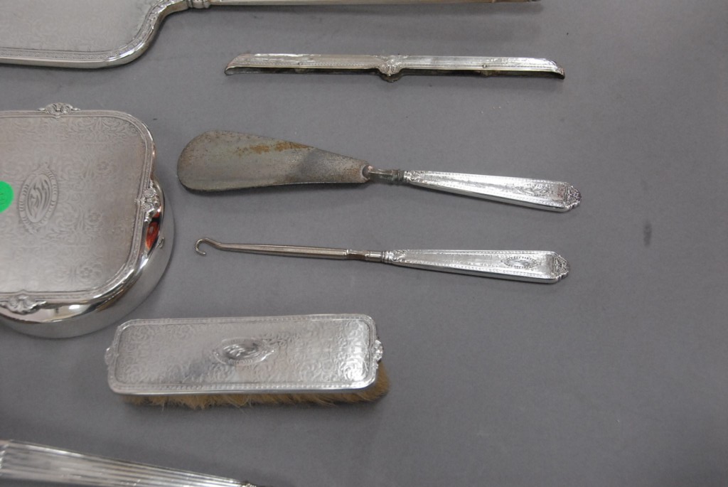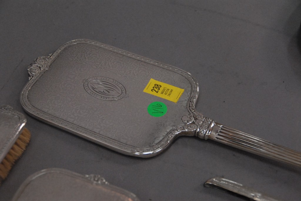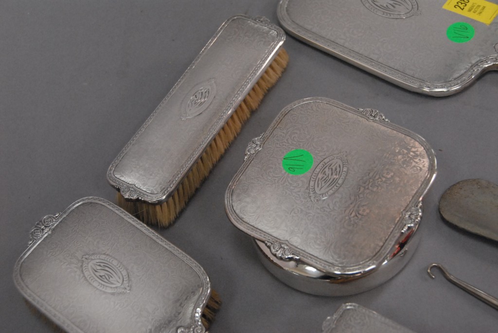 Lot 238: International eight piece sterling silver dresser set three brushes, mirror, covered powder jar, silver rim part of a comb, shoe ho…