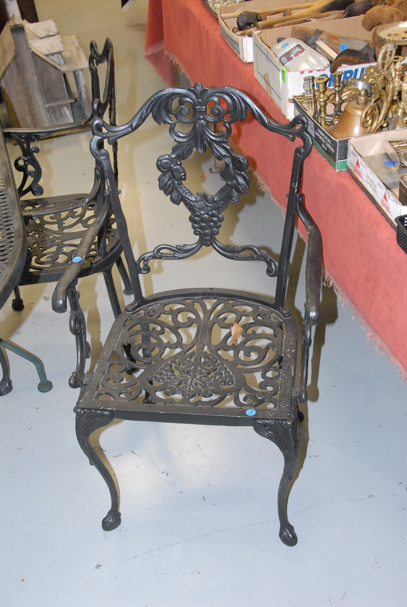 Iron mesh outdoor oval table and four metal armchairs.