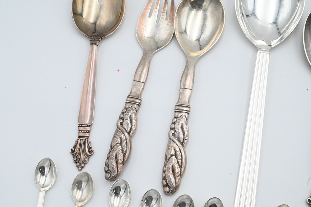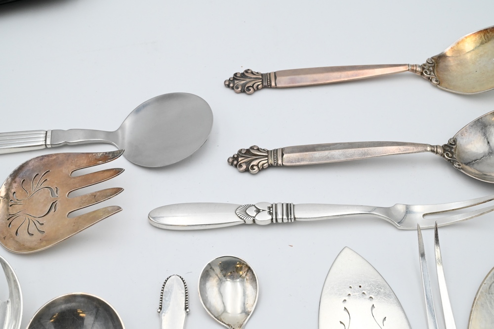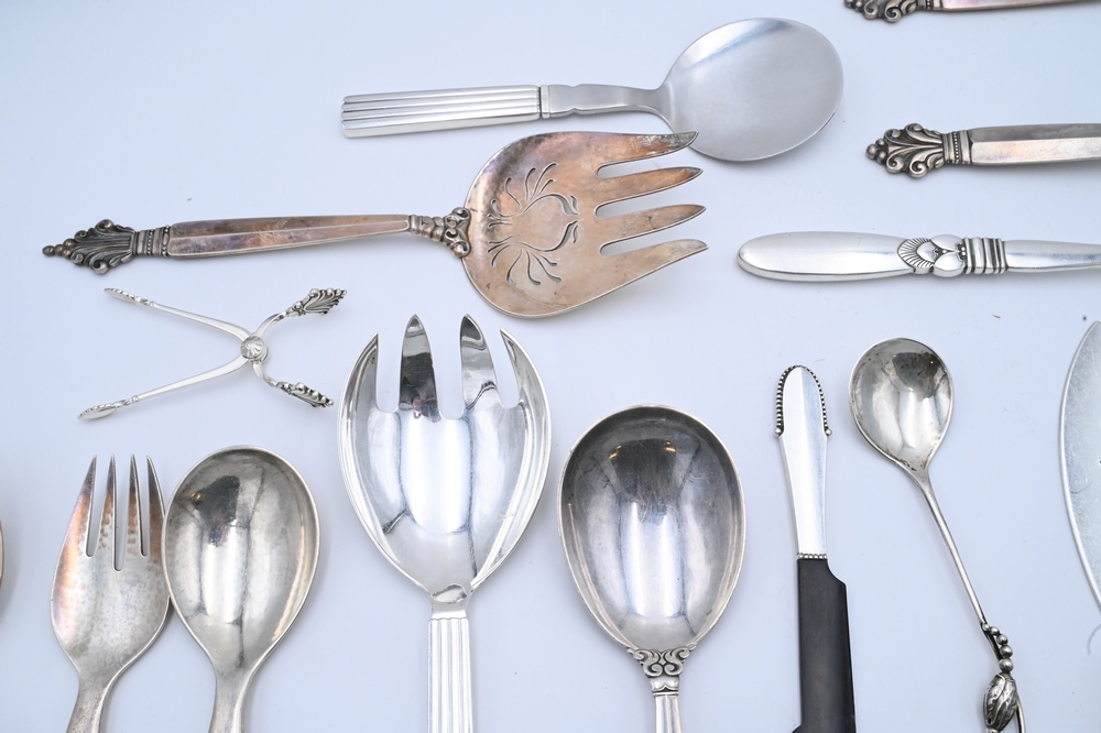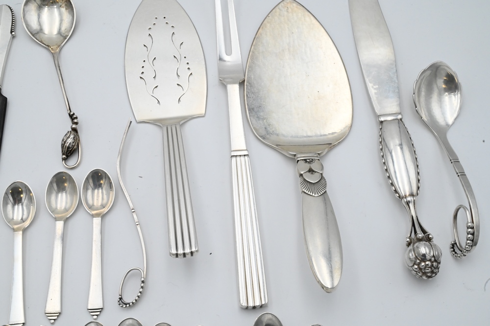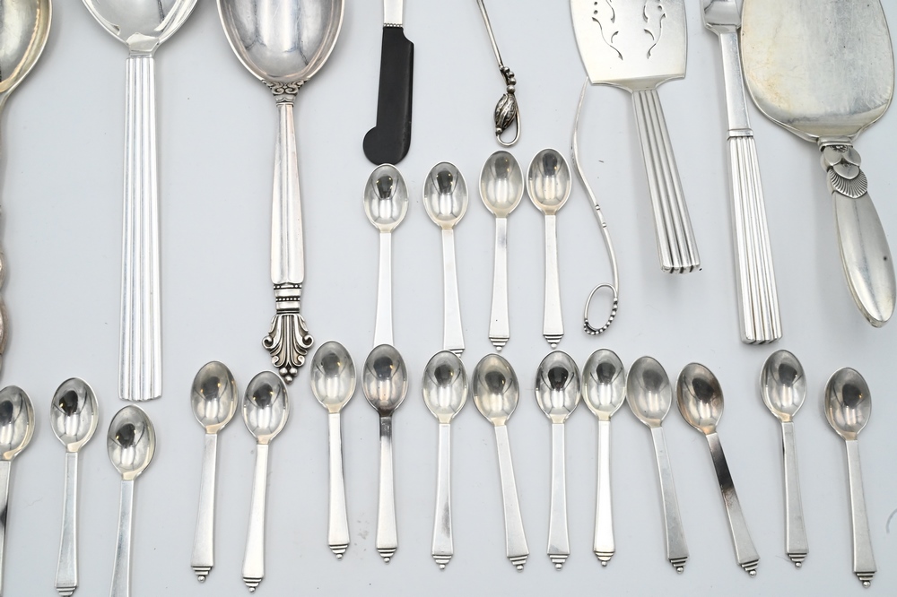 Large Group of Georg Jensen Sterling Silver Flatware and Serving Pieces, to include 4 “Bernadotte” serving pieces; 1 beaded master butter knife; 2 “Cactus” serving pieces; 2 “Ornamental” serving pieces fork and spoon; 3 “Blossom” pieces; 6 “Acanthus” serving pieces; set of “Pyramid” demitasse spoons, etc., 41.9 t.oz weighable plus 8 handles.