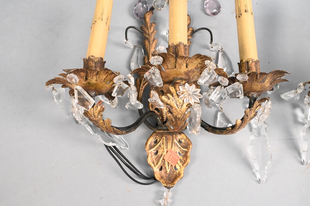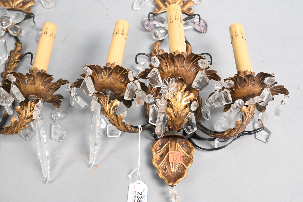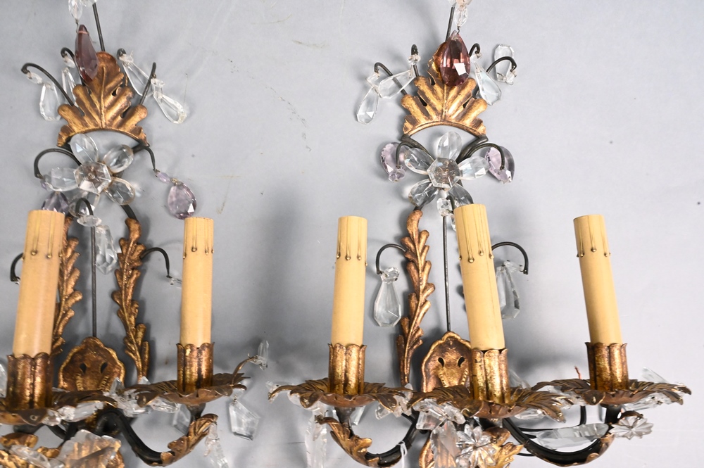 Pair of Metal and Crystal Sconces, electrified, height 22 inches.