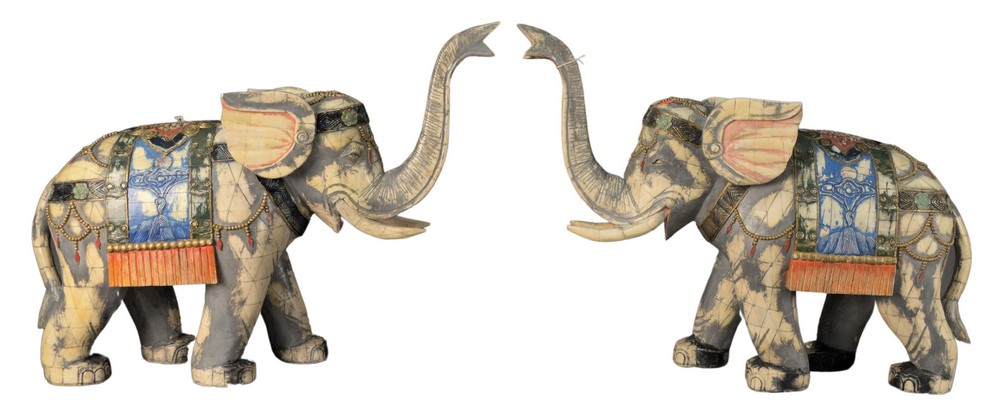 Lot 238: Pair of Wood Carved and Pain Decorated Elephant Forms, height 22 1/2 inches, length 28 inches.