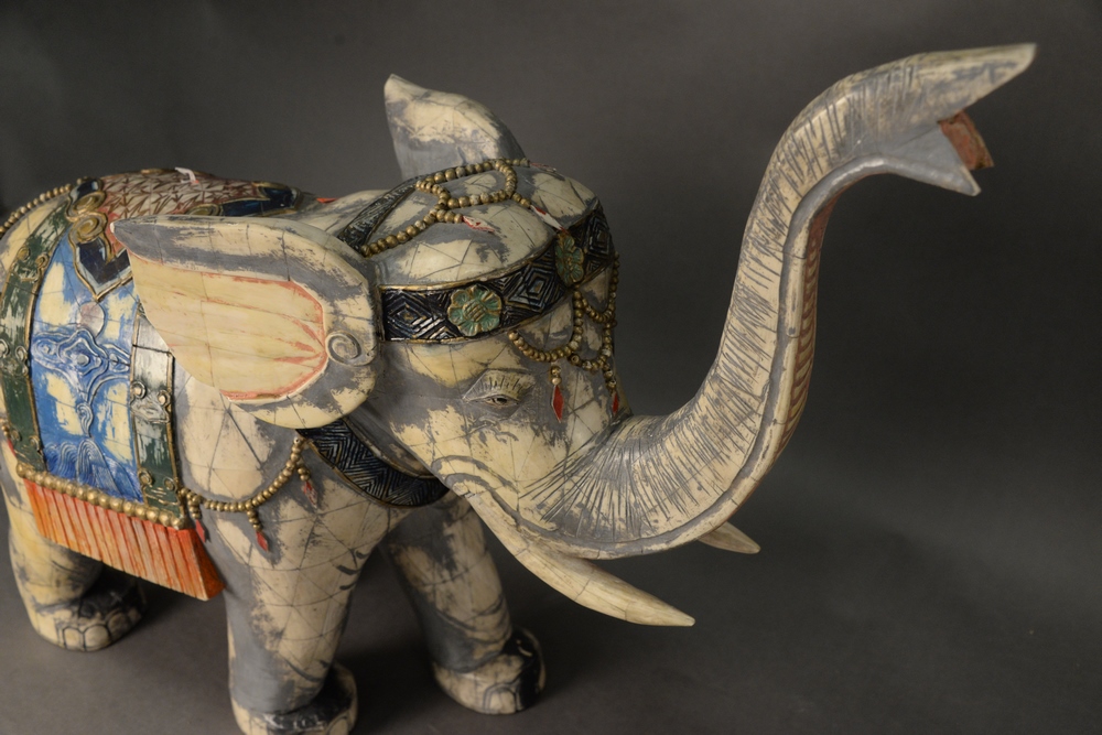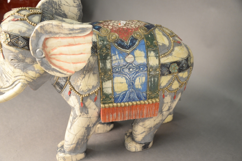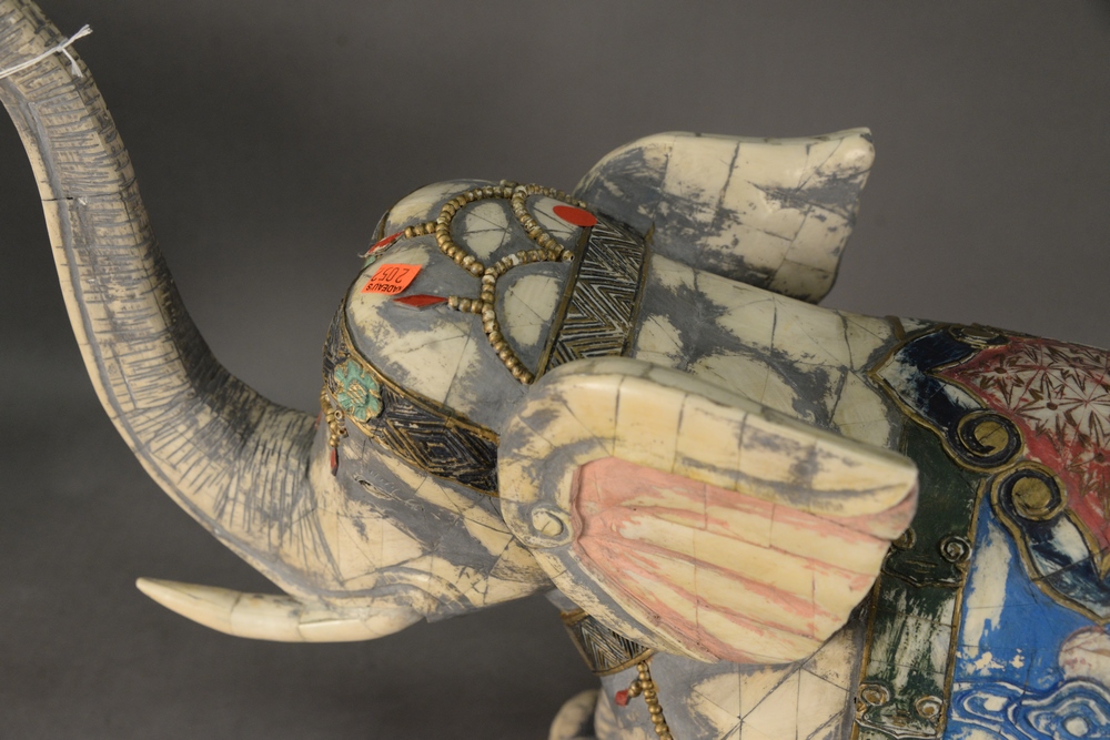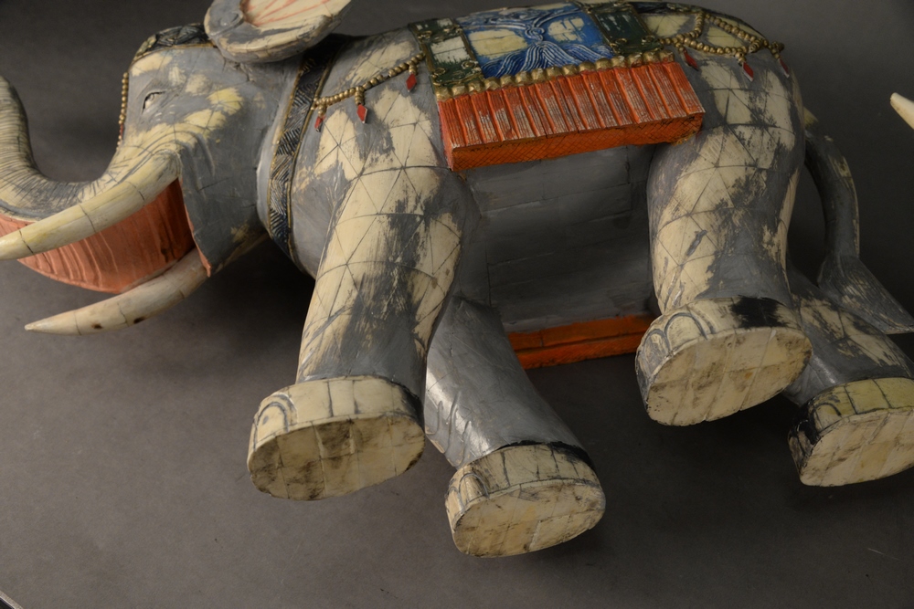 Lot 238: Pair of Wood Carved and Pain Decorated Elephant Forms, height 22 1/2 inches, length 28 inches.