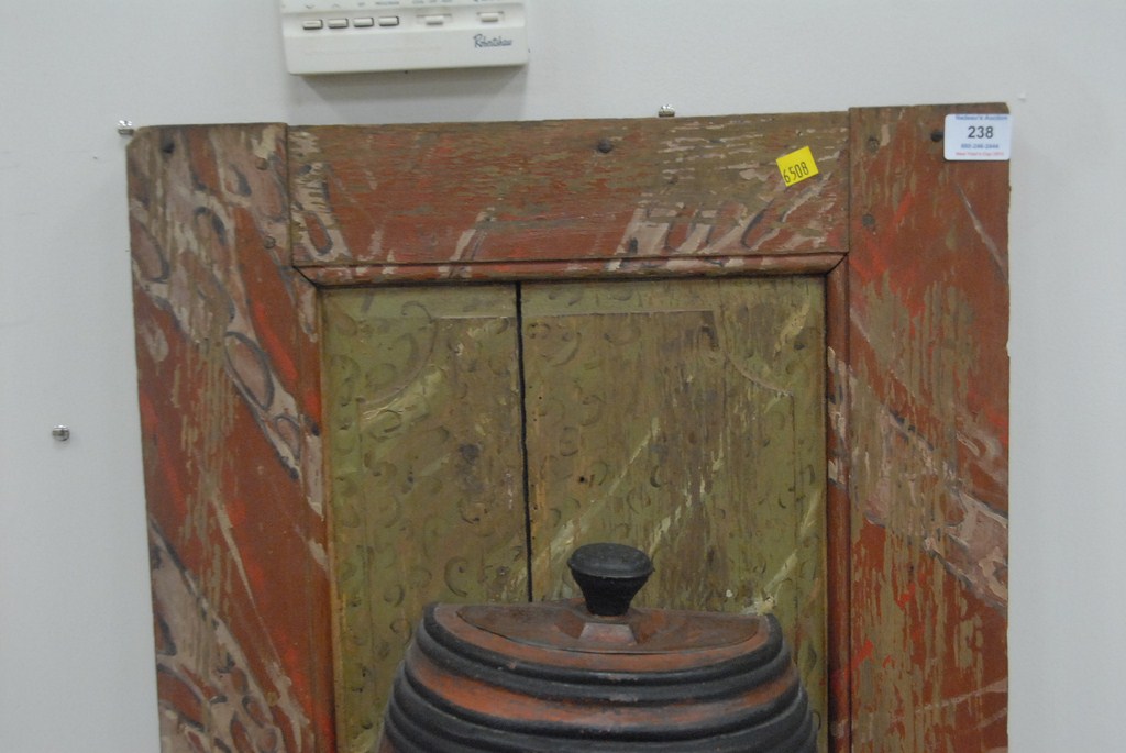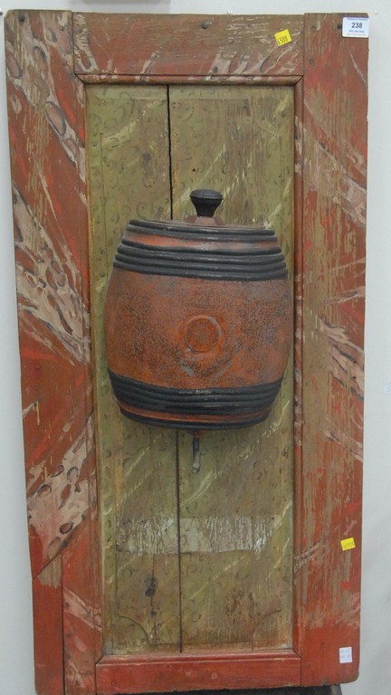 Lot 238: Paneled board in old paint mounted with paint decorated tole, 1/2 barrel with lid. Provenance: property from a home in Rockville Ce…